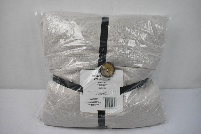 2x BH&G Banded Button Decorative Pillows, Feather Filled 20x20", Tan/Cream - New