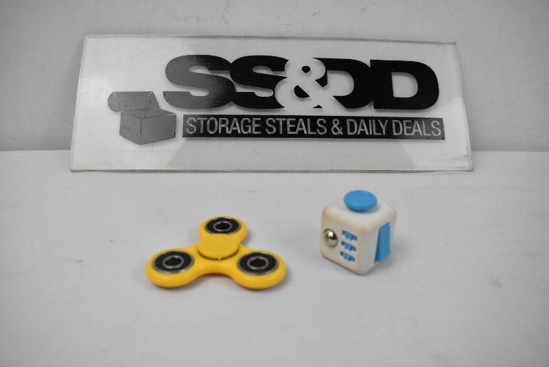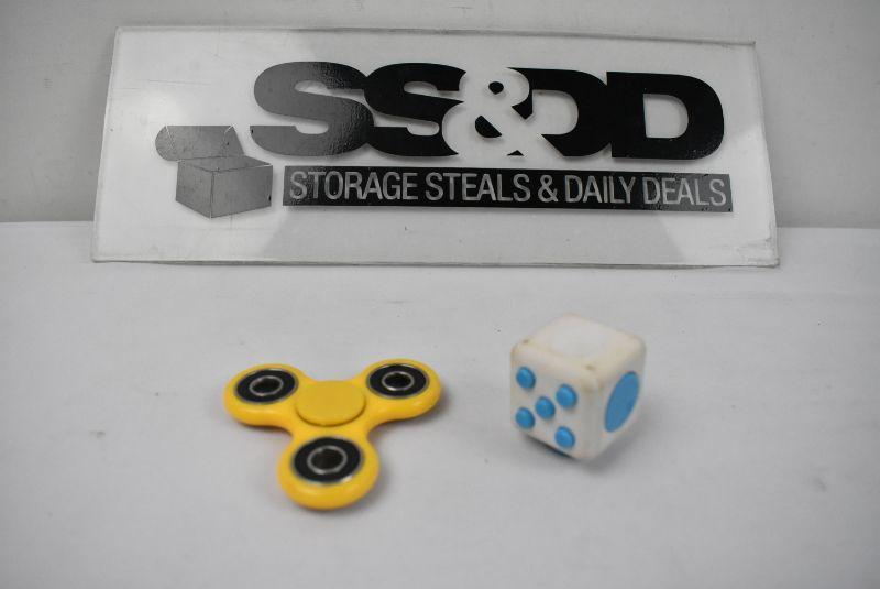 2x Fidget Toys: Yellow Spinner and Blue & White Cube