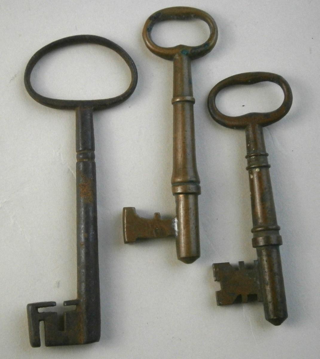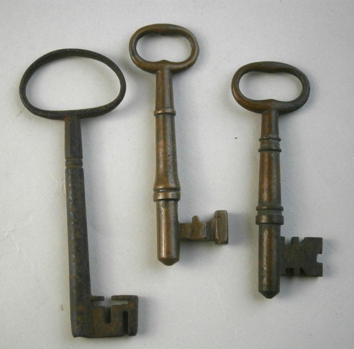 (3) 19th Century Keys, 2 brass & 1 made of steel/iron, 2 3/8 in. to 3 1/2 in. long.