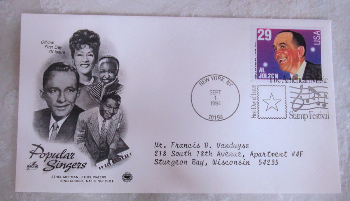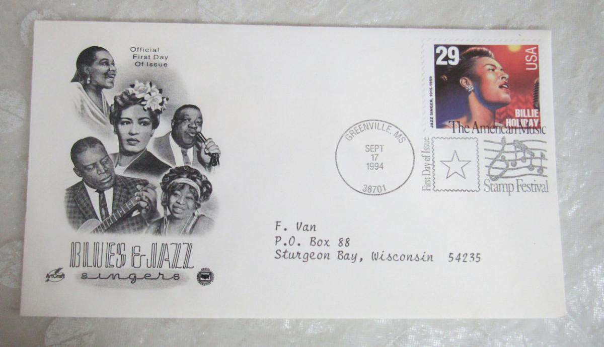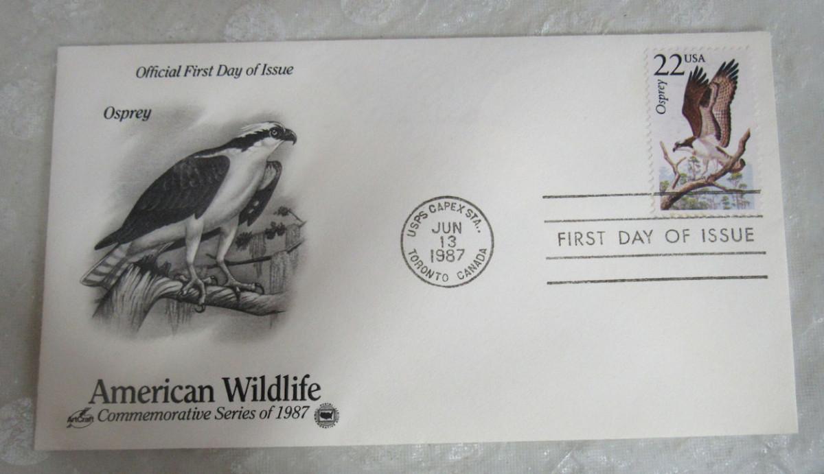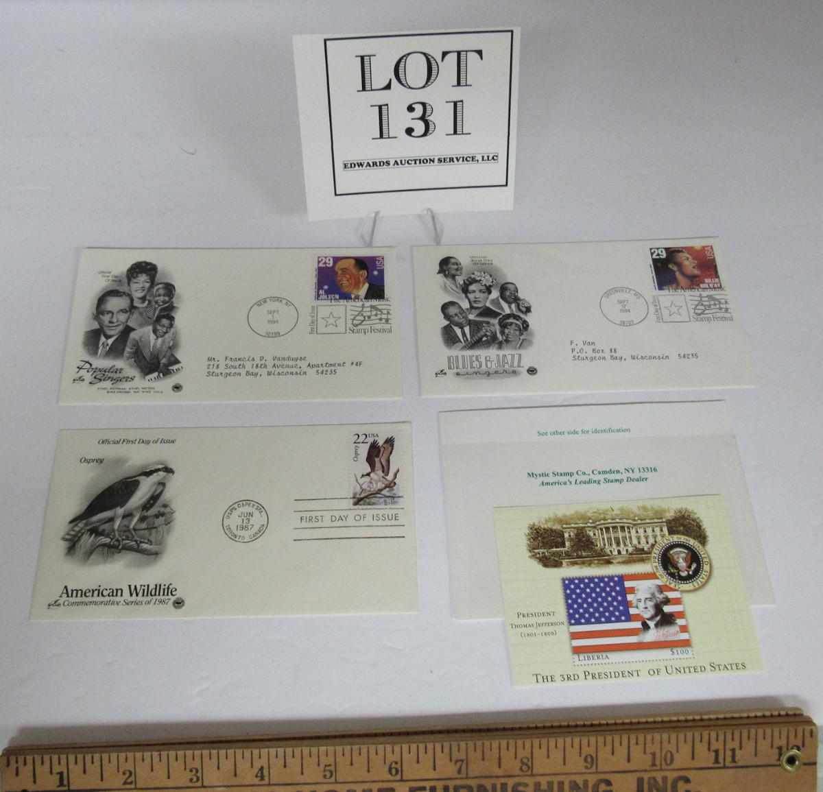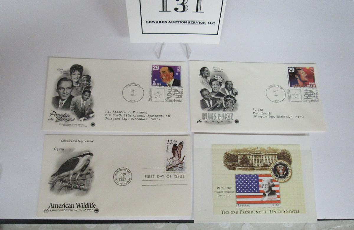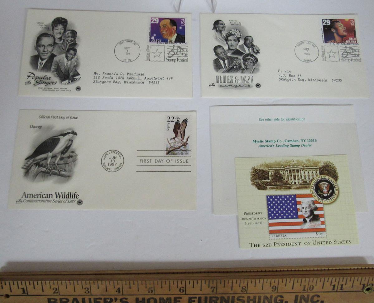 3 1st Day Issue Canceled Envelopes: 1987 Wildlife Osprey, 1994 Popular Singers, 1994 Blues & Jazz, 1 1994 T Jefferson Stamp