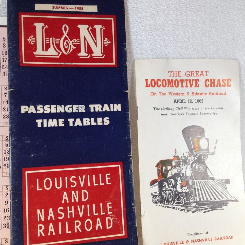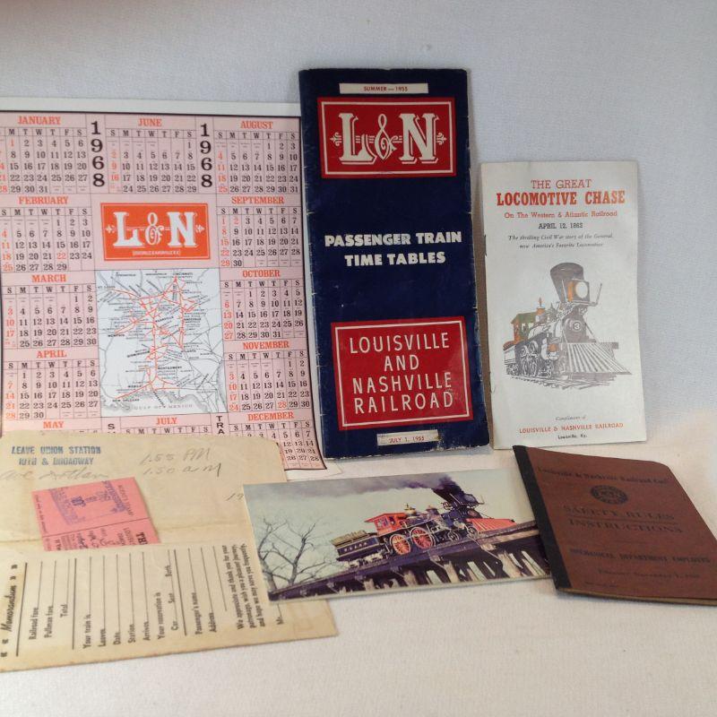 L & N Memorabilia - Lot #3 consists of a 1968 Calendar, a 1955 L & N Passenger Train Time Table, a Coach Ticket for the 1:55 PM South Wind Train in its Original Envelope. 2 different copies of the Story of the Great Locomotive Chase of 1862, and a L & N Safety Rules Booklet.