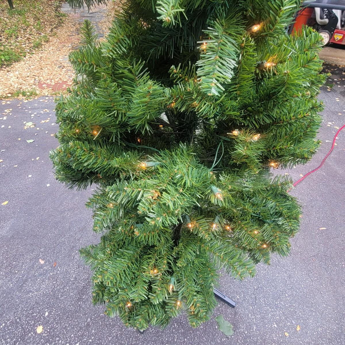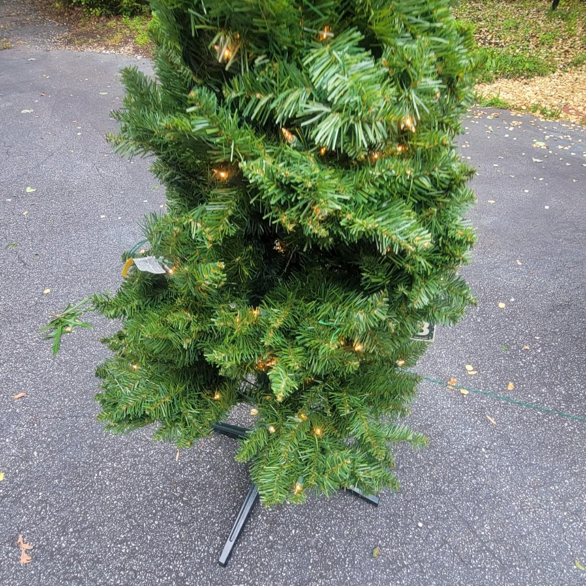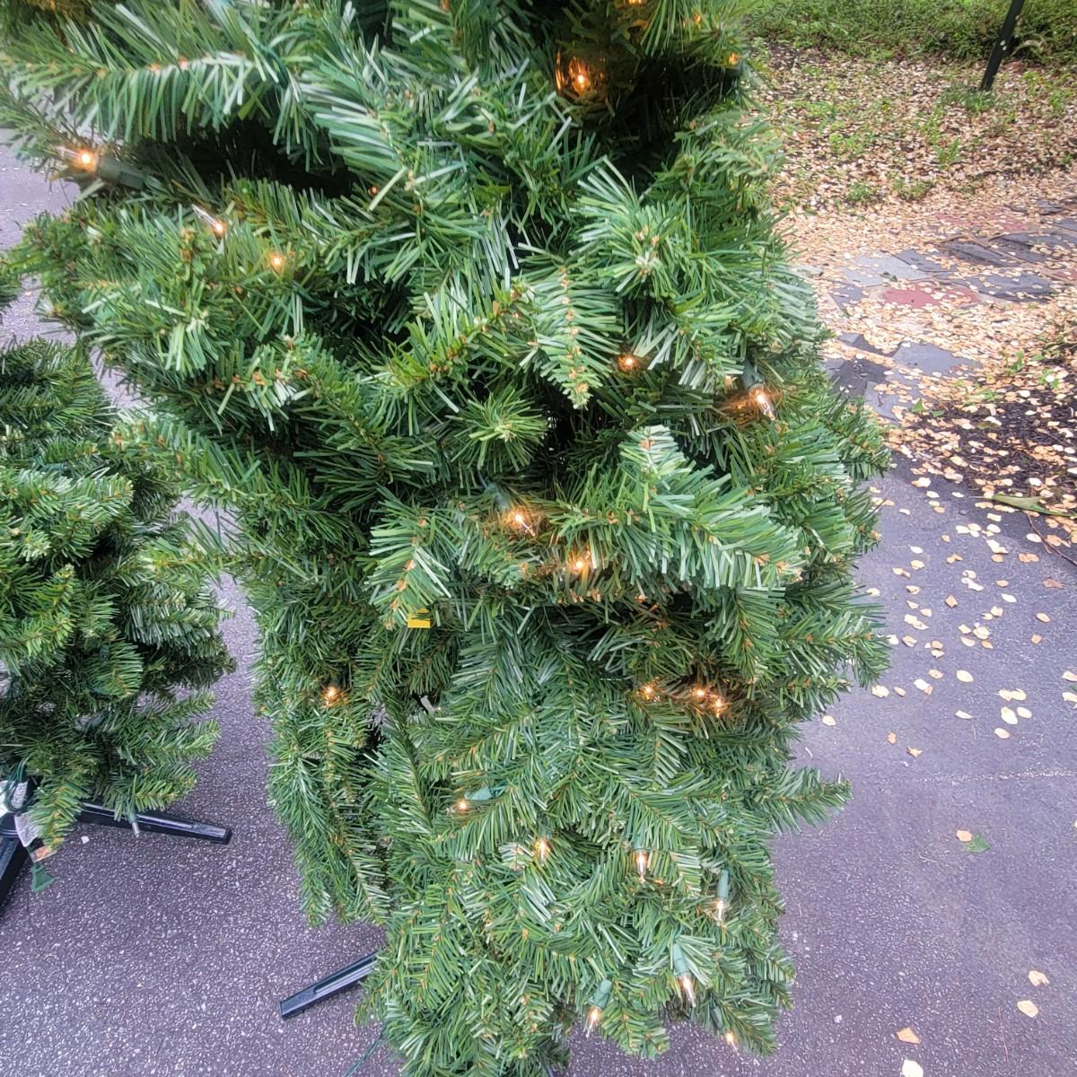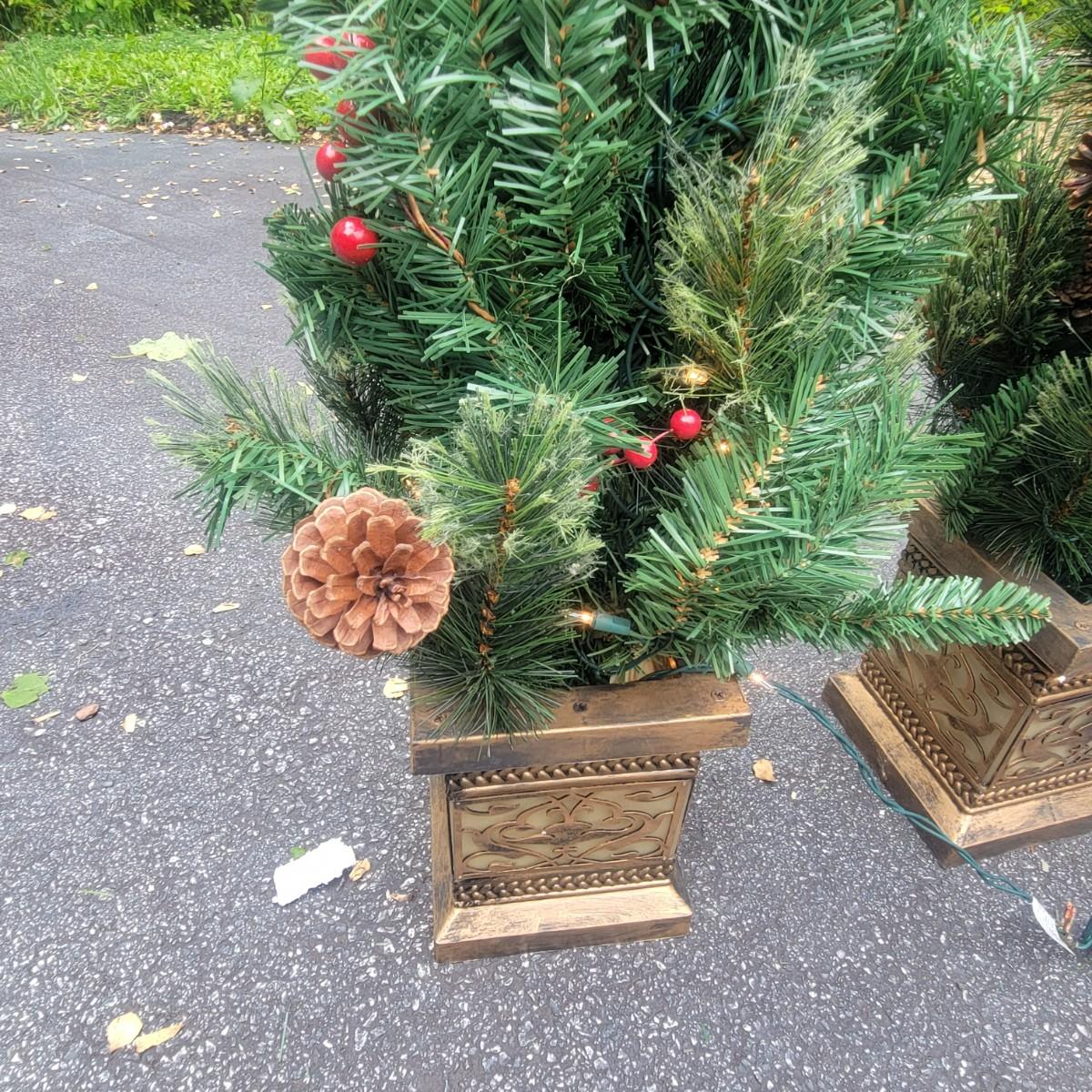 Three 7ft tall Christmas trees that are prelit with standard lights. 2 trees lit up 100%, one tree has a small section that wasn't lit. See photos. Each tree has storage bag and extension cords. Two 4ft prelit trees with decorations and decorative bases. Local pickup only