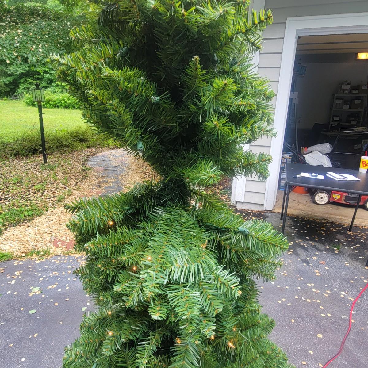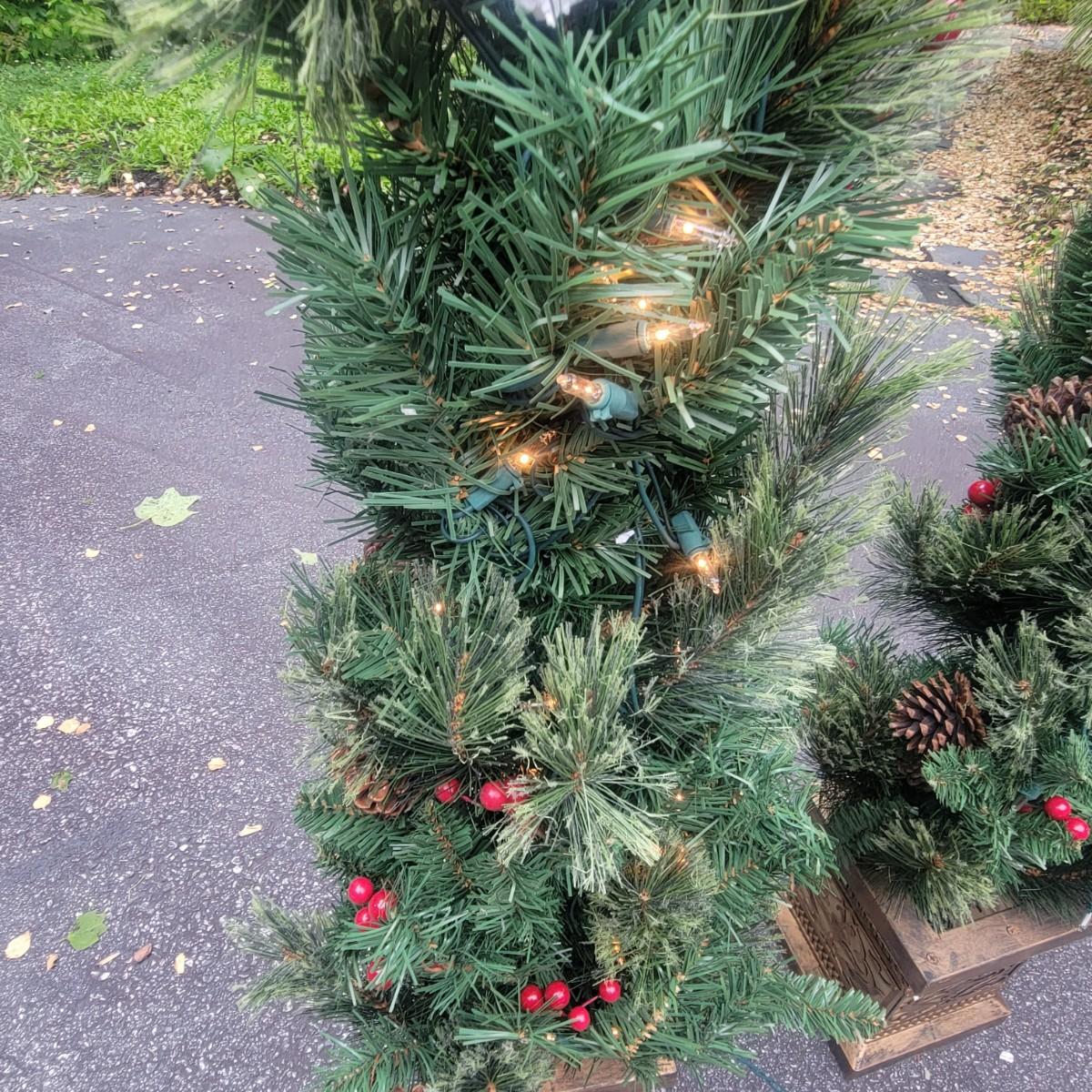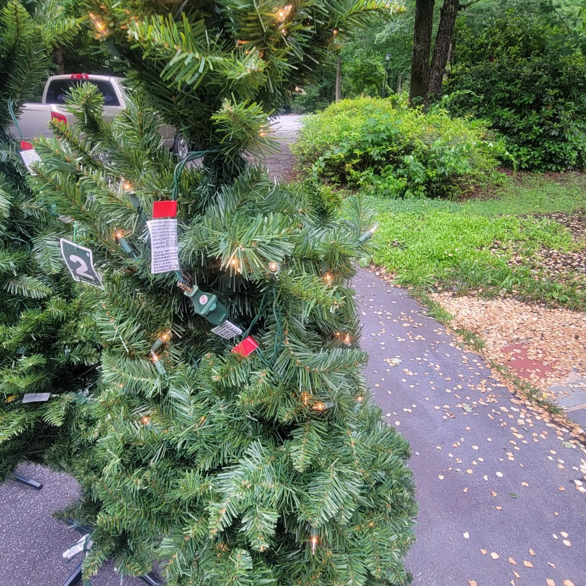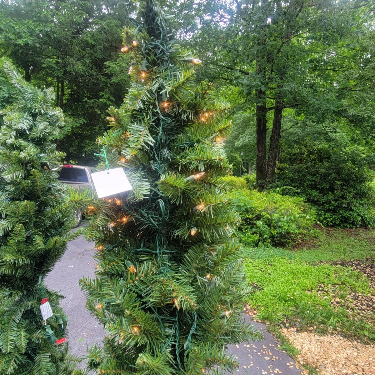 Three 7ft tall Christmas trees that are prelit with standard lights. 2 trees lit up 100%, one tree has a small section that wasn't lit. See photos. Each tree has storage bag and extension cords. Two 4ft prelit trees with decorations and decorative bases. Local pickup only