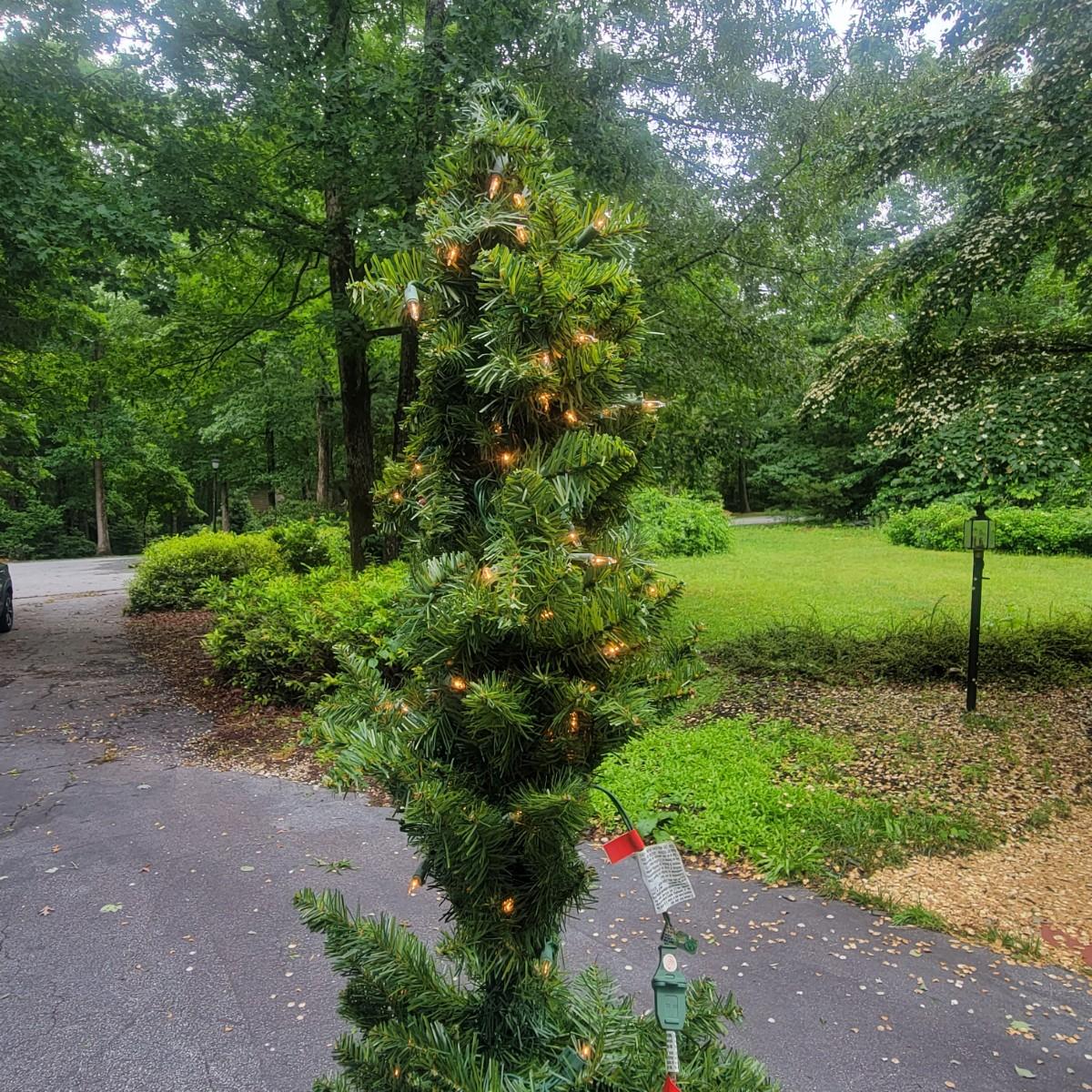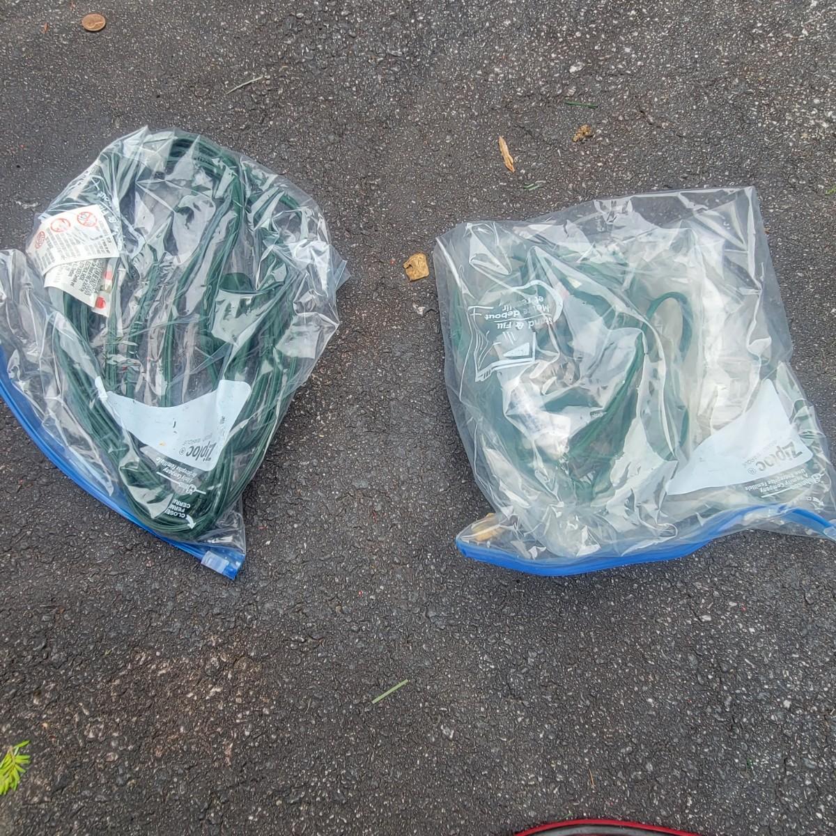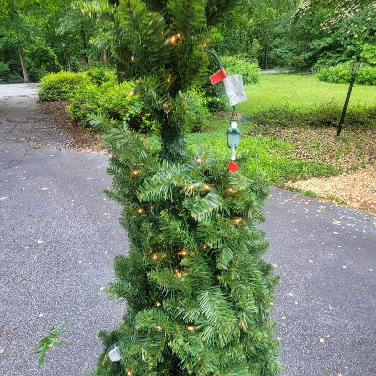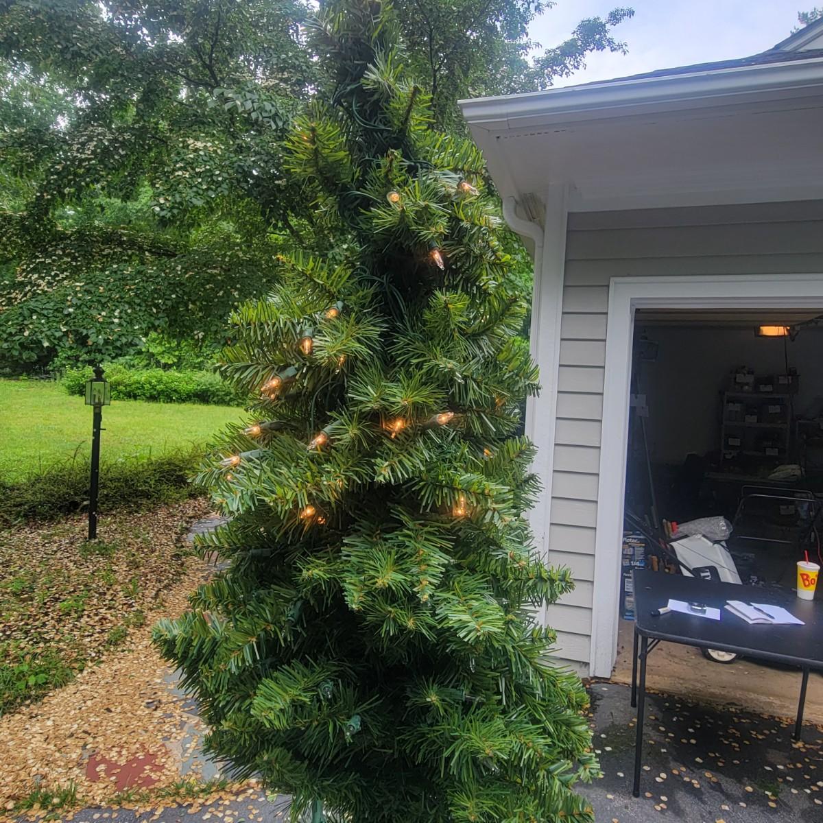 Three 7ft tall Christmas trees that are prelit with standard lights. 2 trees lit up 100%, one tree has a small section that wasn't lit. See photos. Each tree has storage bag and extension cords. Two 4ft prelit trees with decorations and decorative bases. Local pickup only