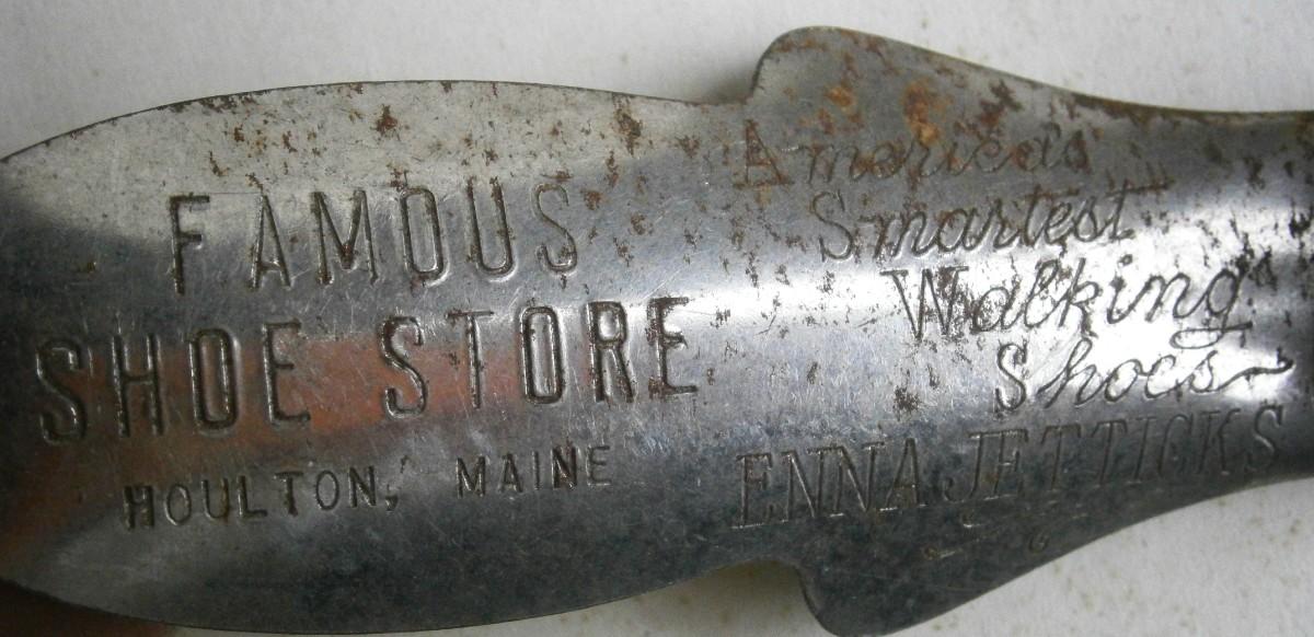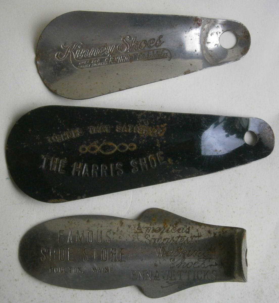 (3) Advertising Shoe Horns, vintage, metal, 3 3/4 in. to 4 1/2 in. long, metal.