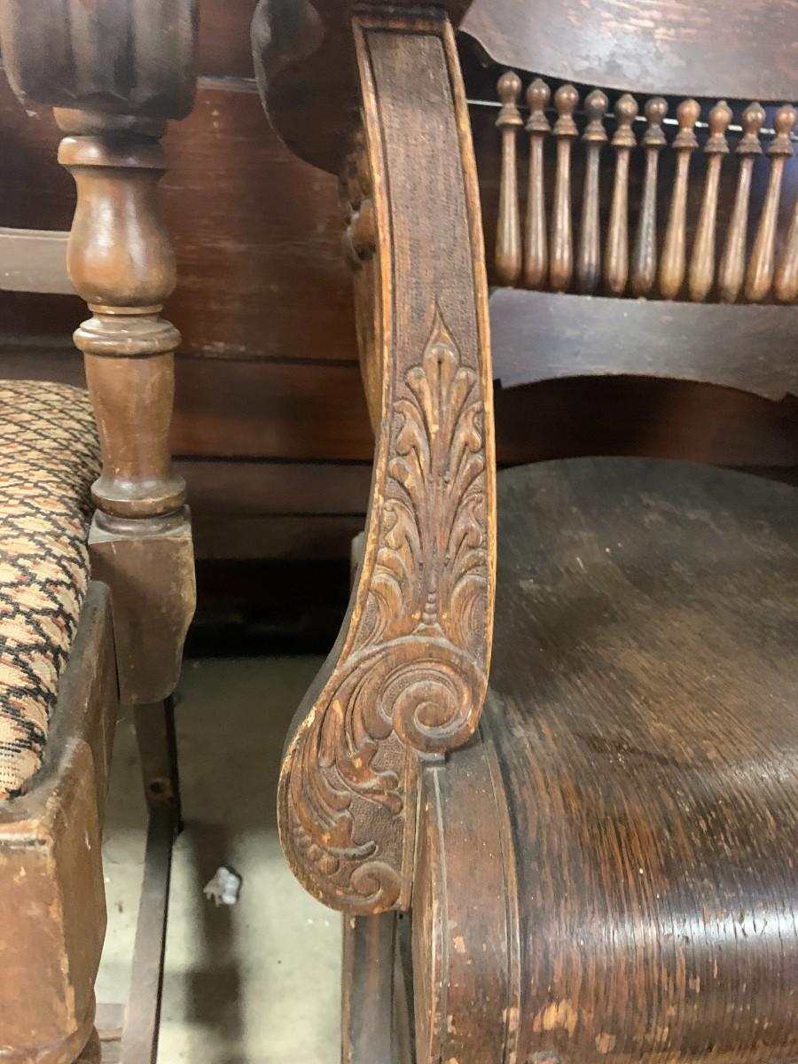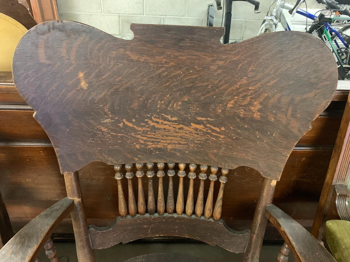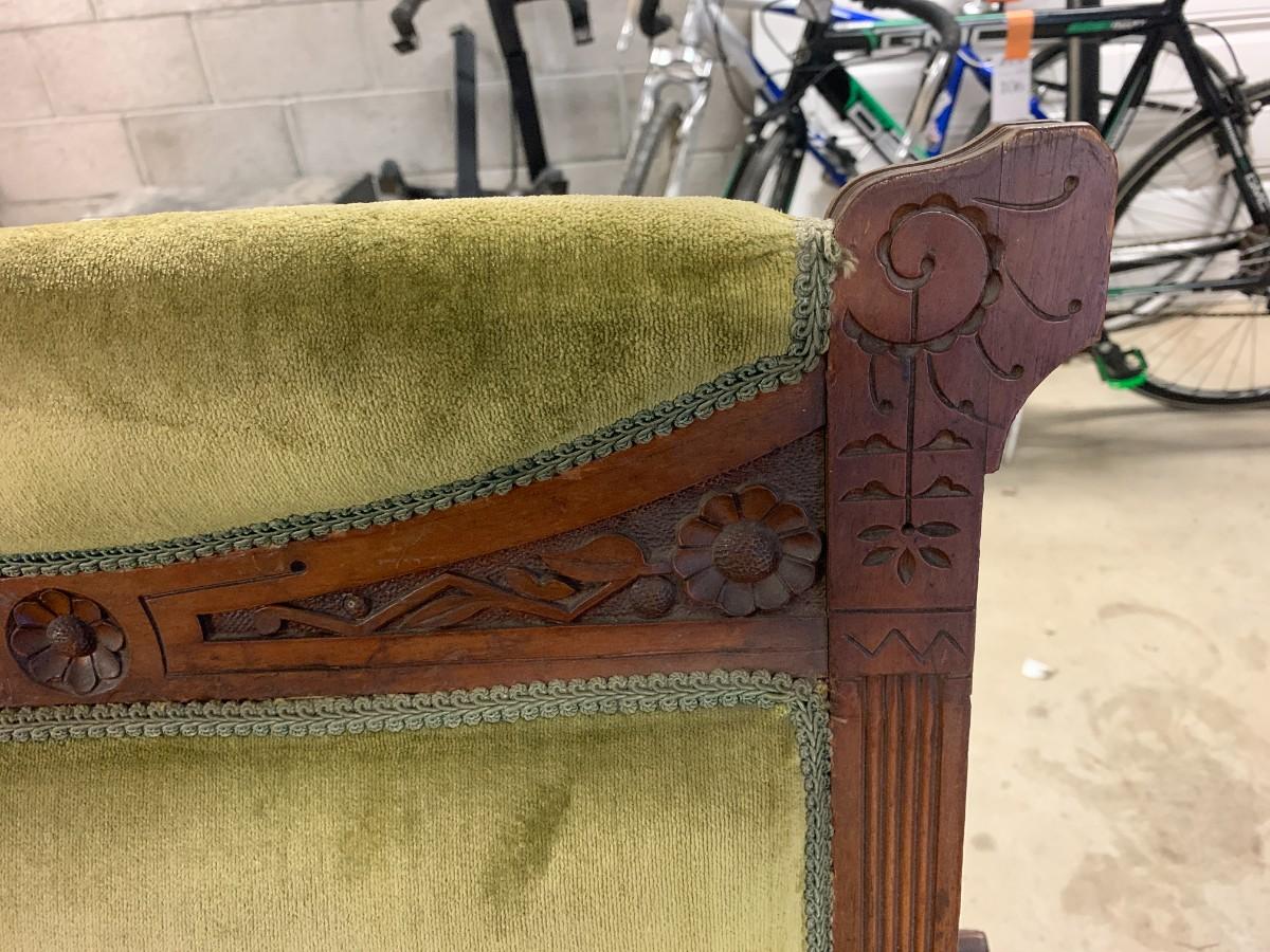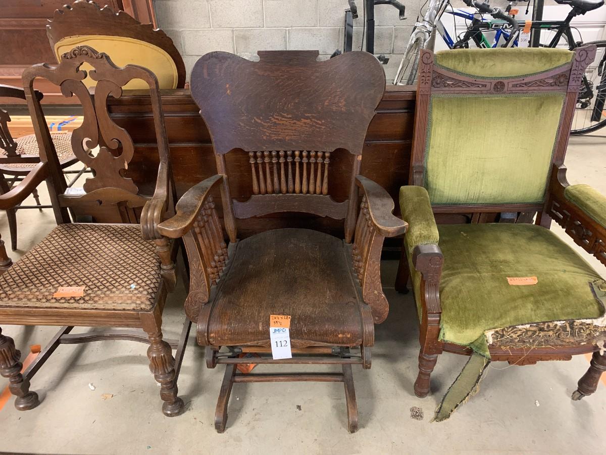 Victorian platform rocker all wood. Green upholstered arm chair with torn seat upholstery. Wood arm chair with fabric seat