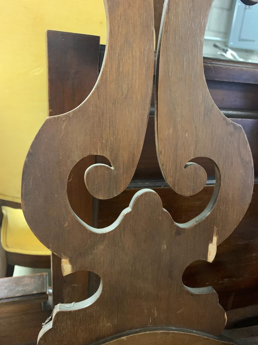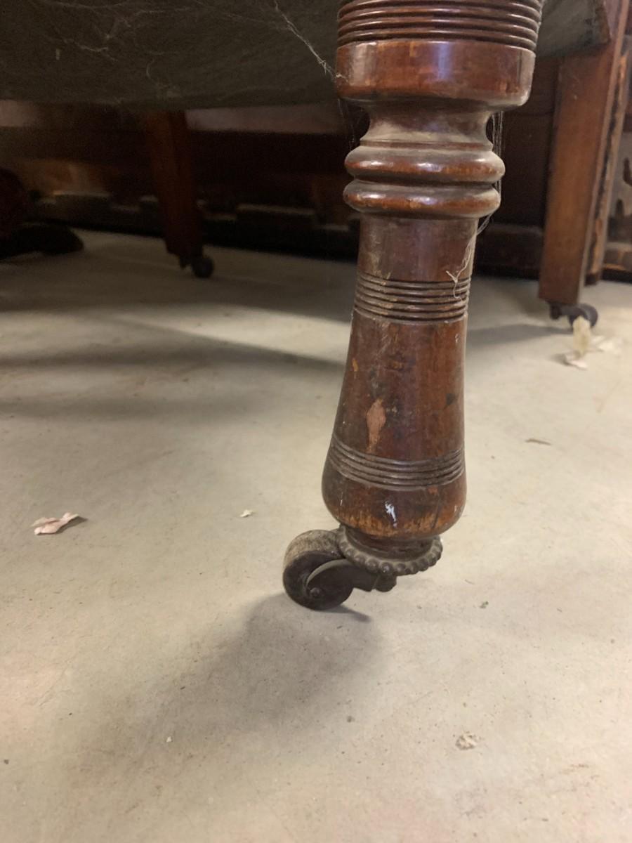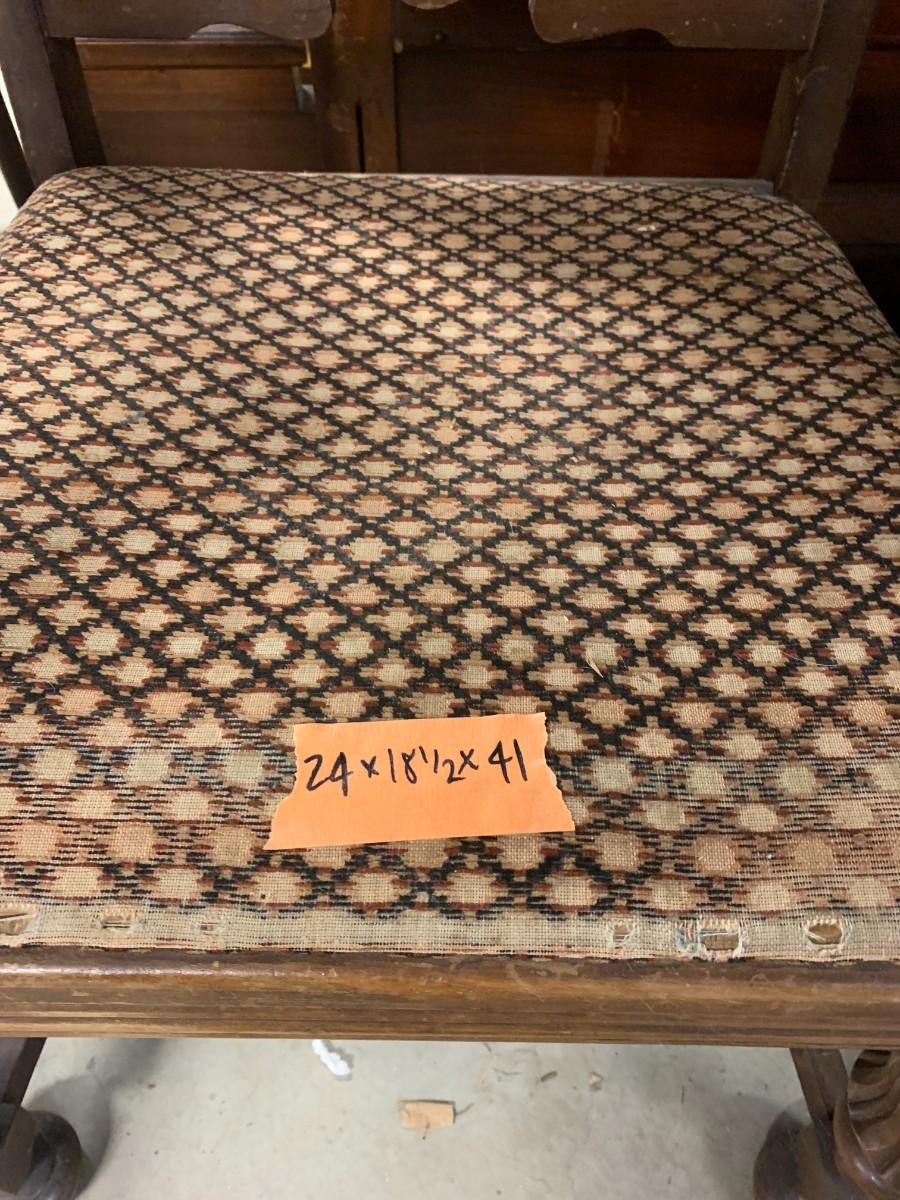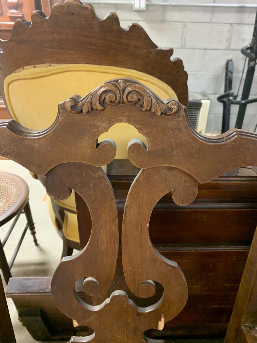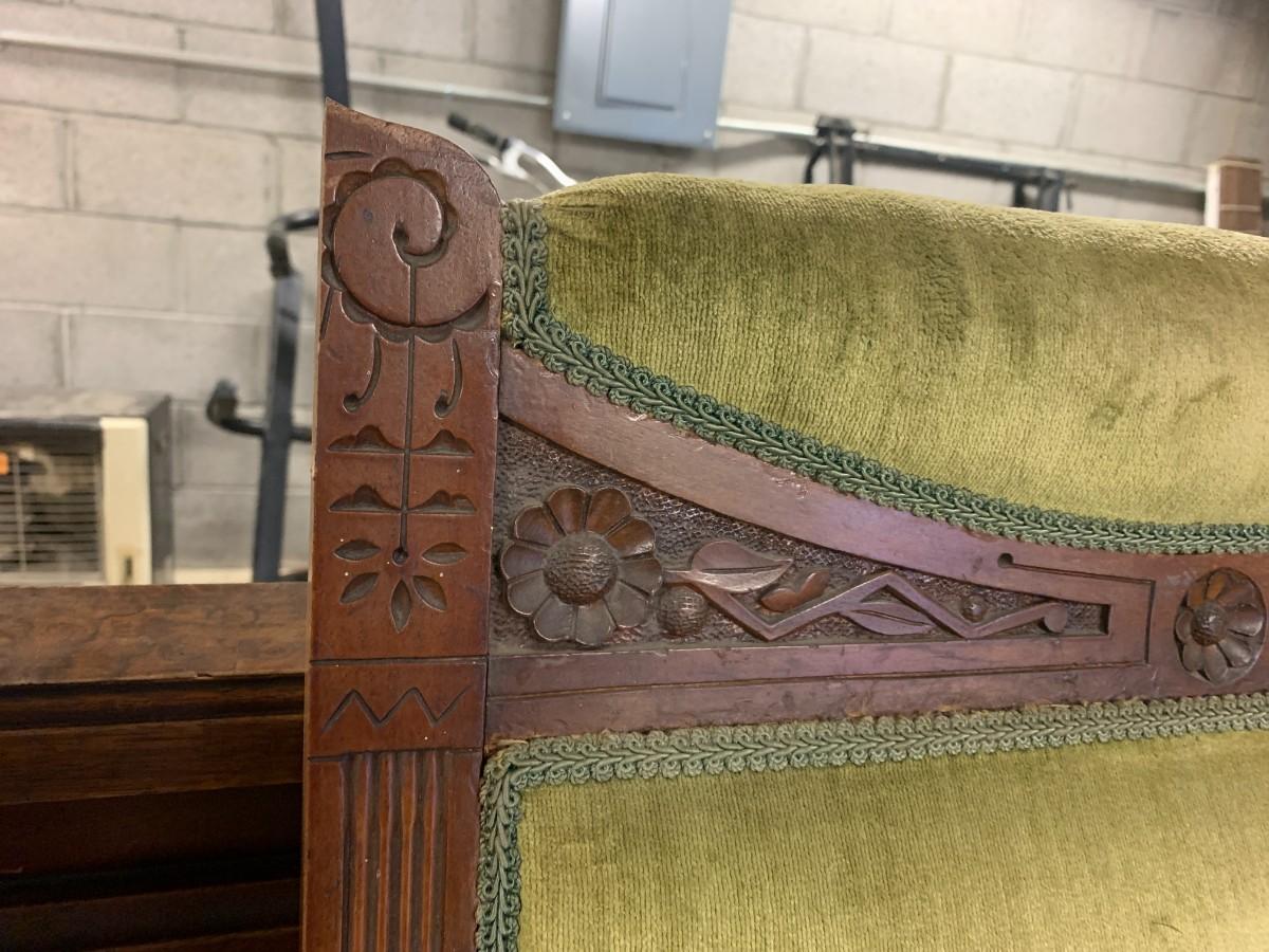 Victorian platform rocker all wood. Green upholstered arm chair with torn seat upholstery. Wood arm chair with fabric seat