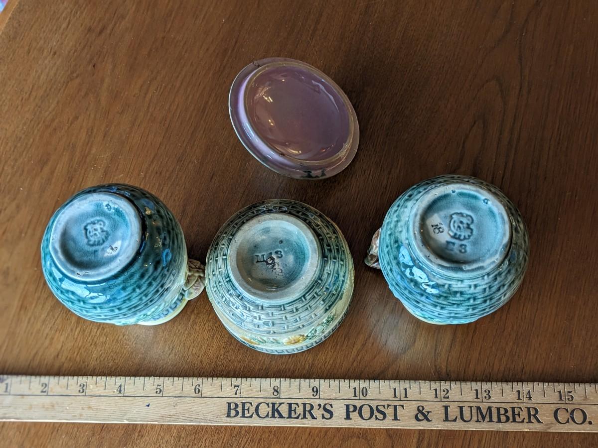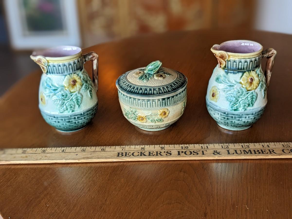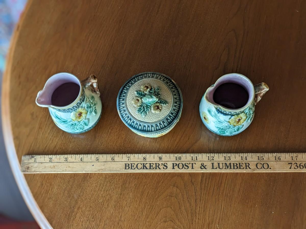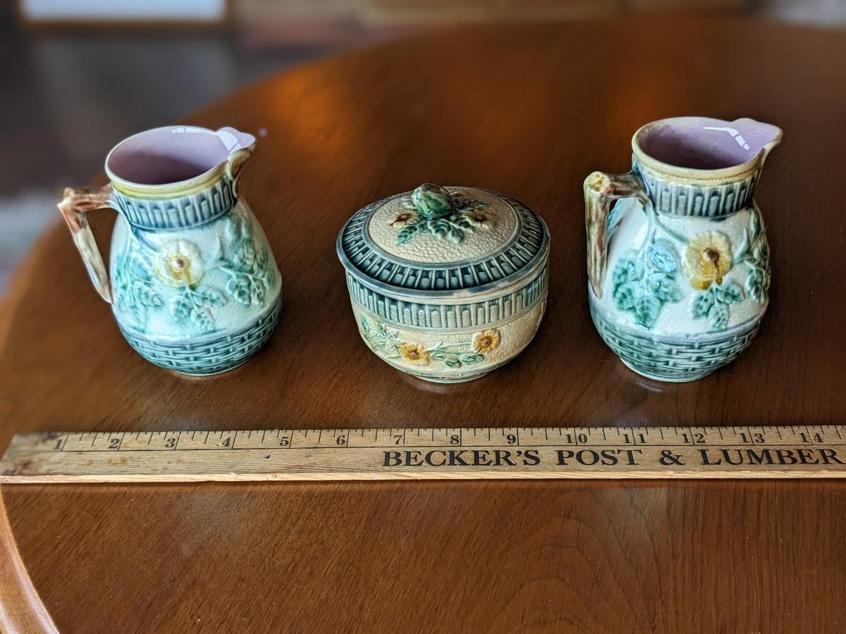 3 Antique Etruscan Majolica Wild Rose Pitcher & Sugar Bowl