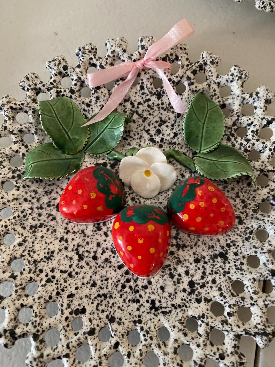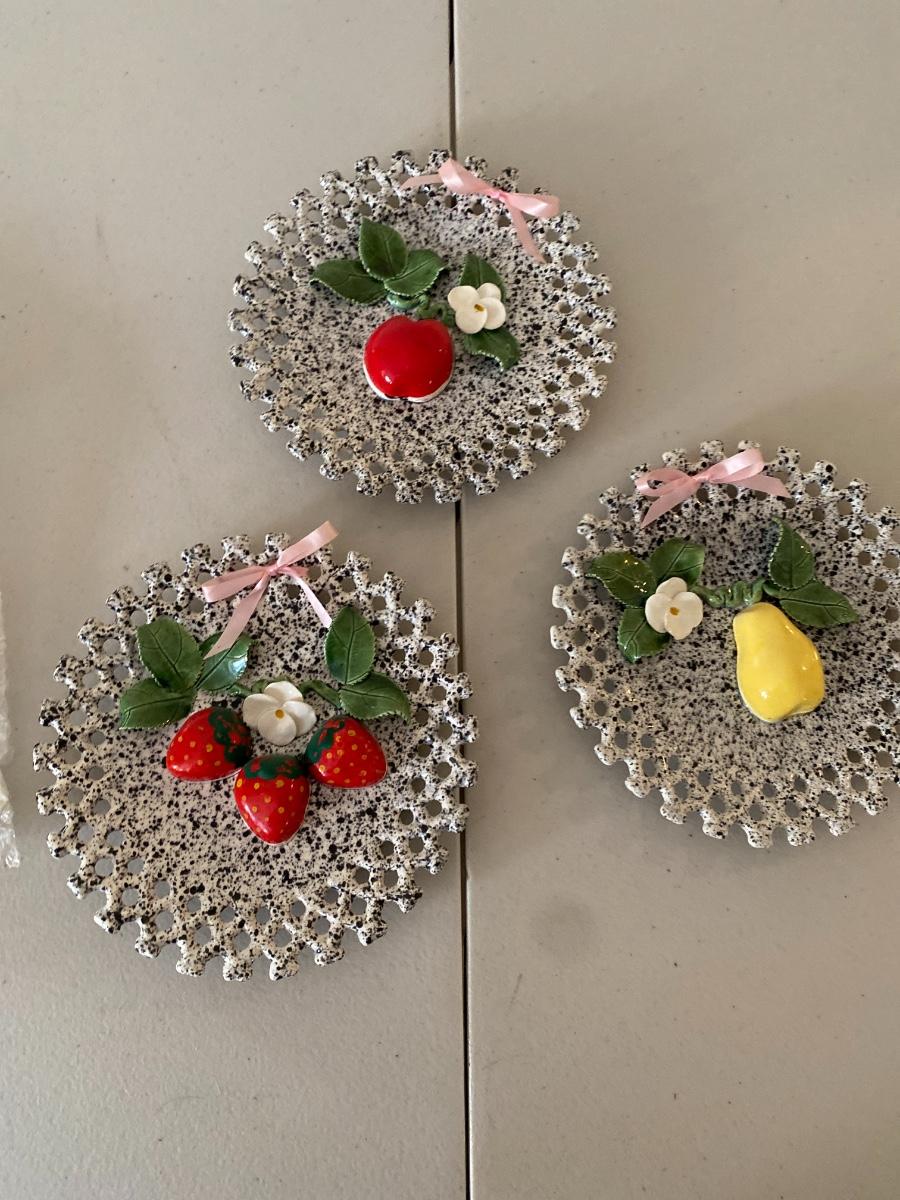 Largest Apple is 6 inches high. 7 items. Includes three ceramic vintage wall hangings.