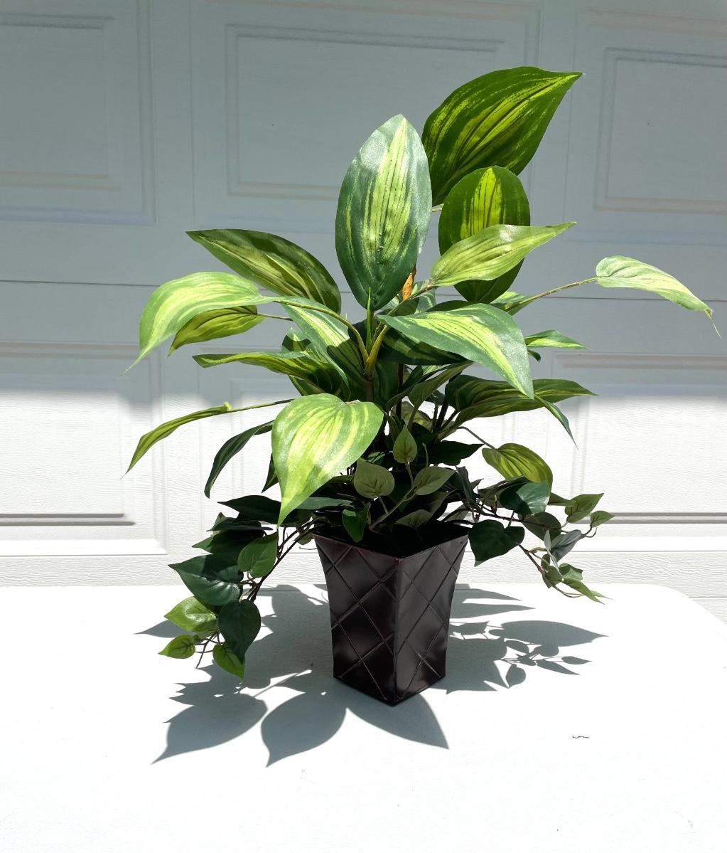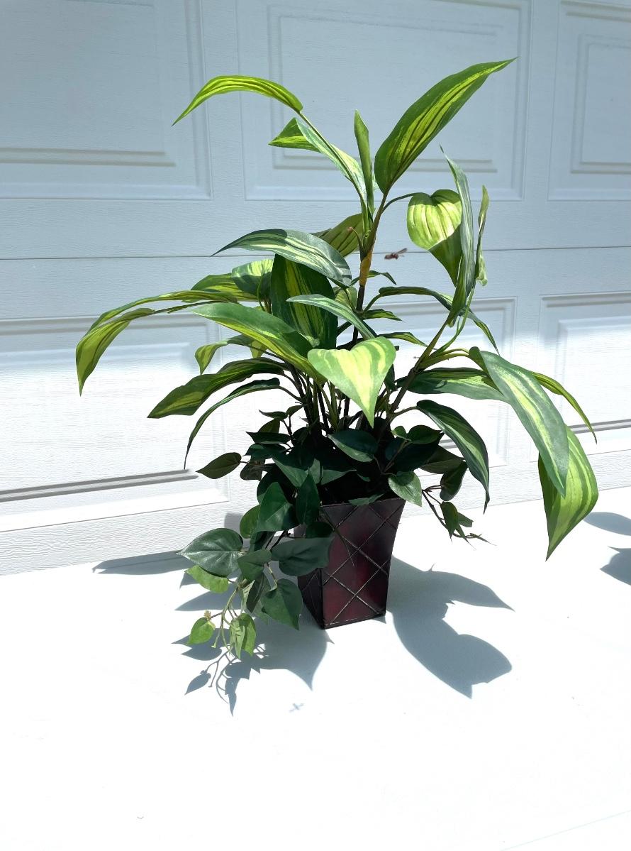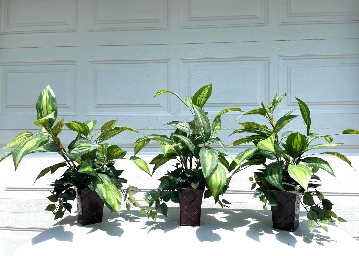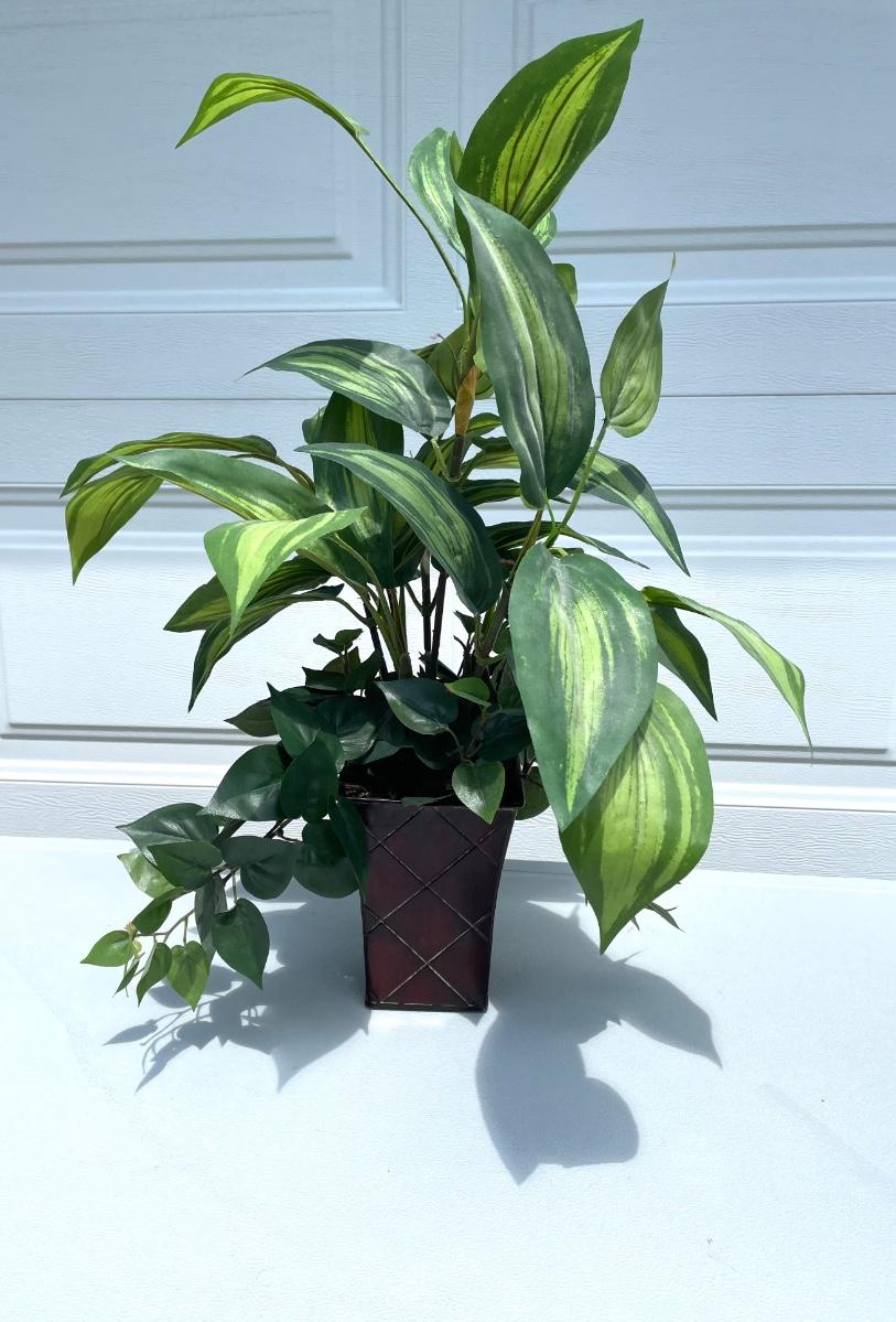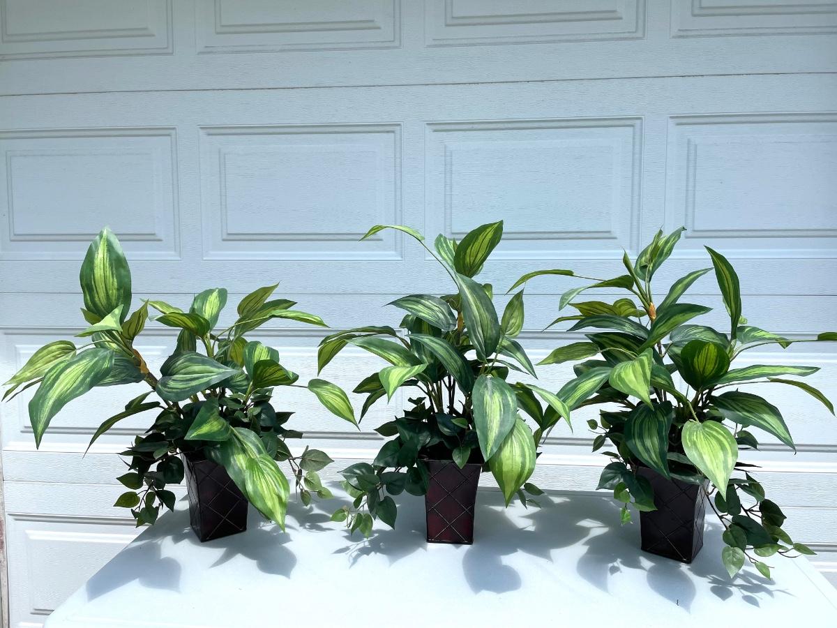 3 Artificial Potted Plants in tin planters. These were used indoors. Measures 23 inches tall.