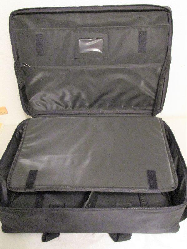 Black travel bag, looks new, has several compartments, 20"x13.5"x6"