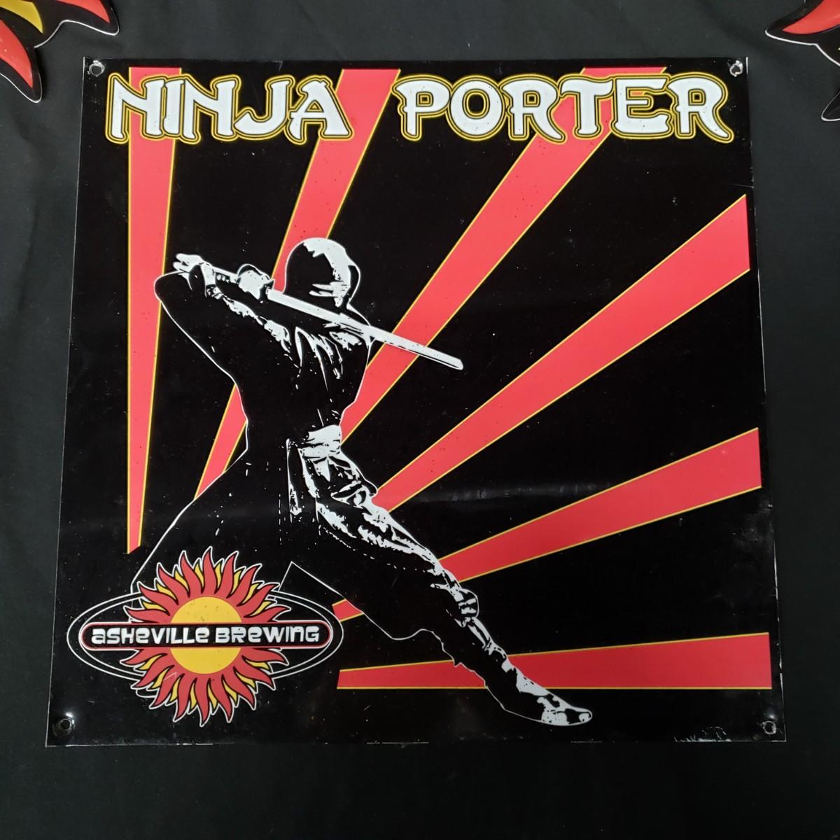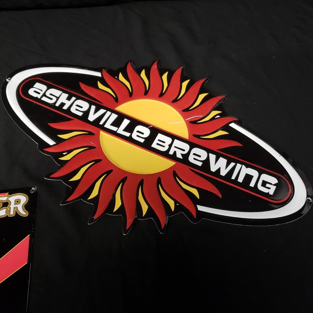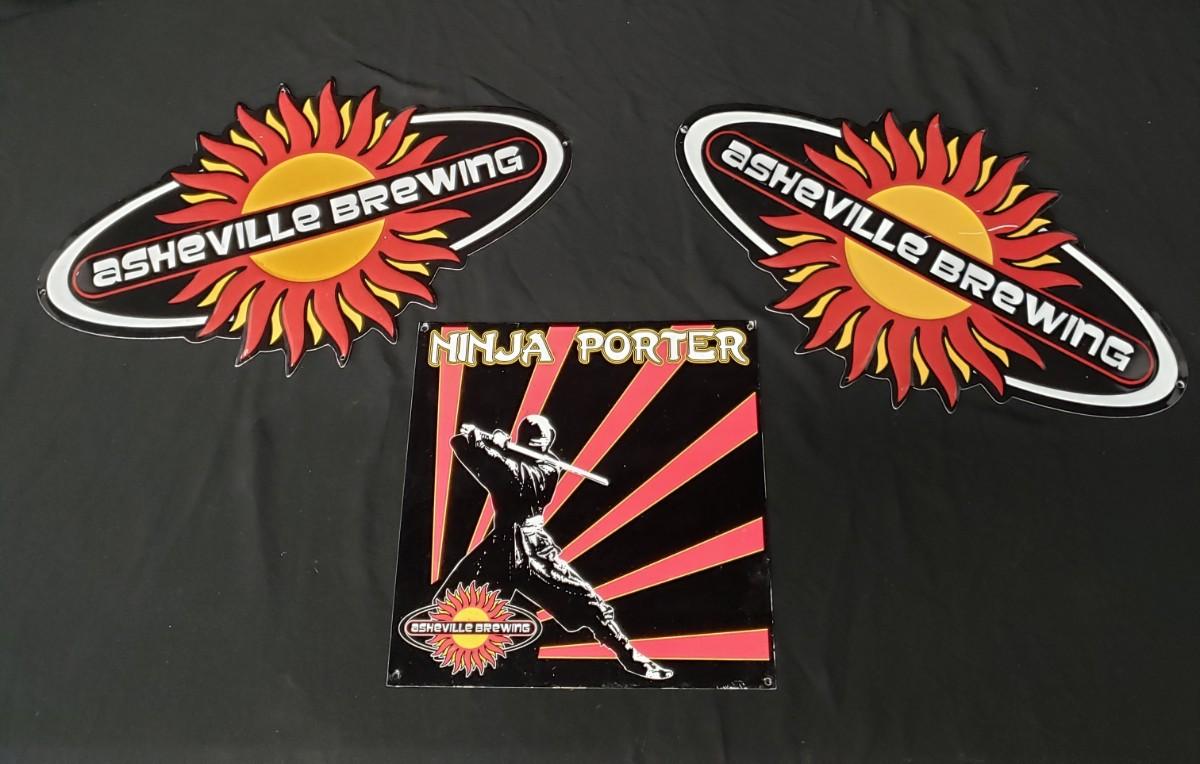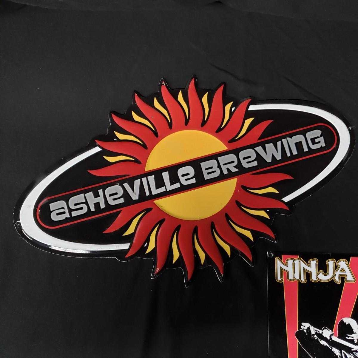 This lot includes 2 identical Asheville Brewing sun burst metal signs measuring 20"x12". They appear to be in good condition. The Ninja Porter metal sign measures 12"x12". There is some wear on the bottom right corner as seen in the pictures. Shipping available.