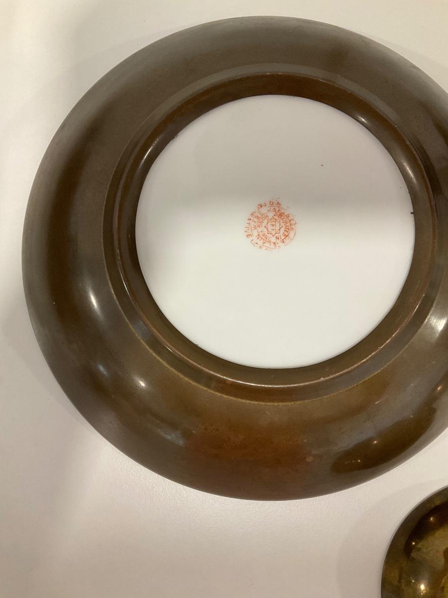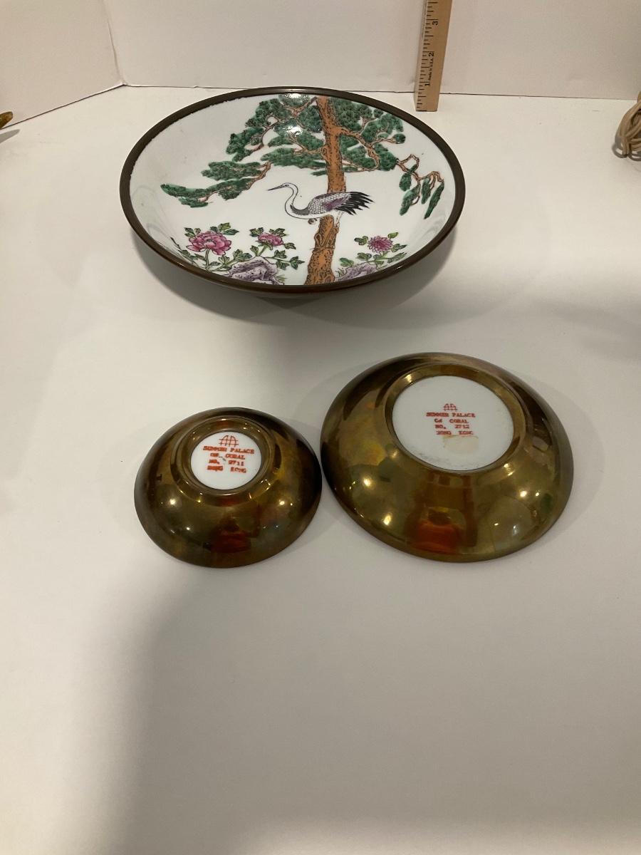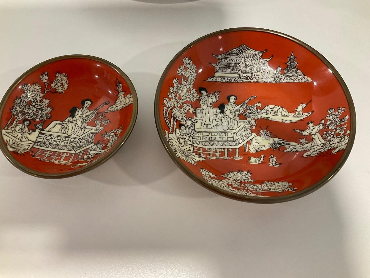 Brass overlay on back door of each bowl with raised print on inside