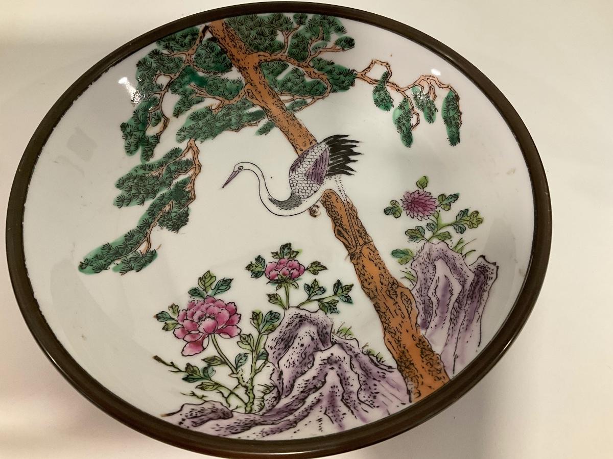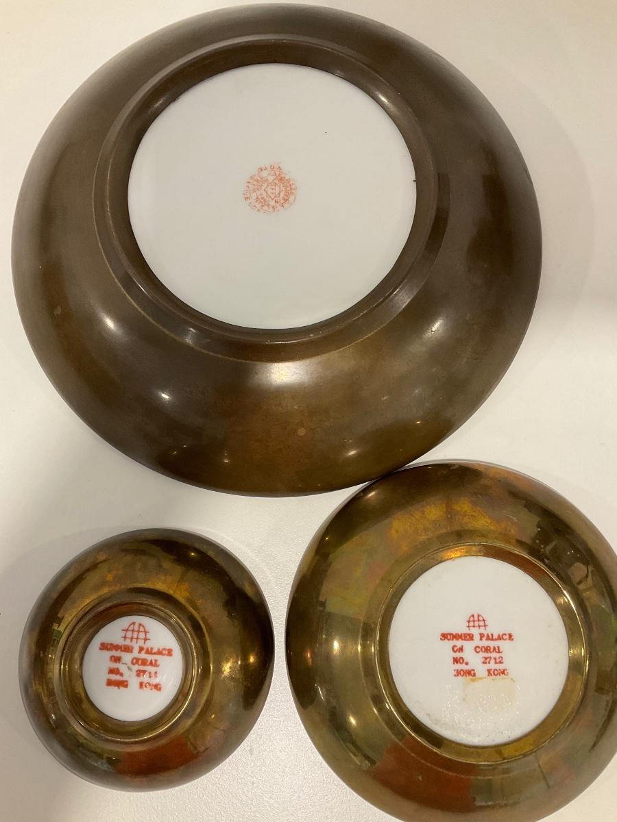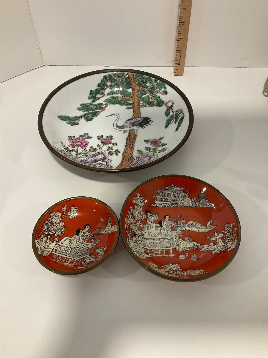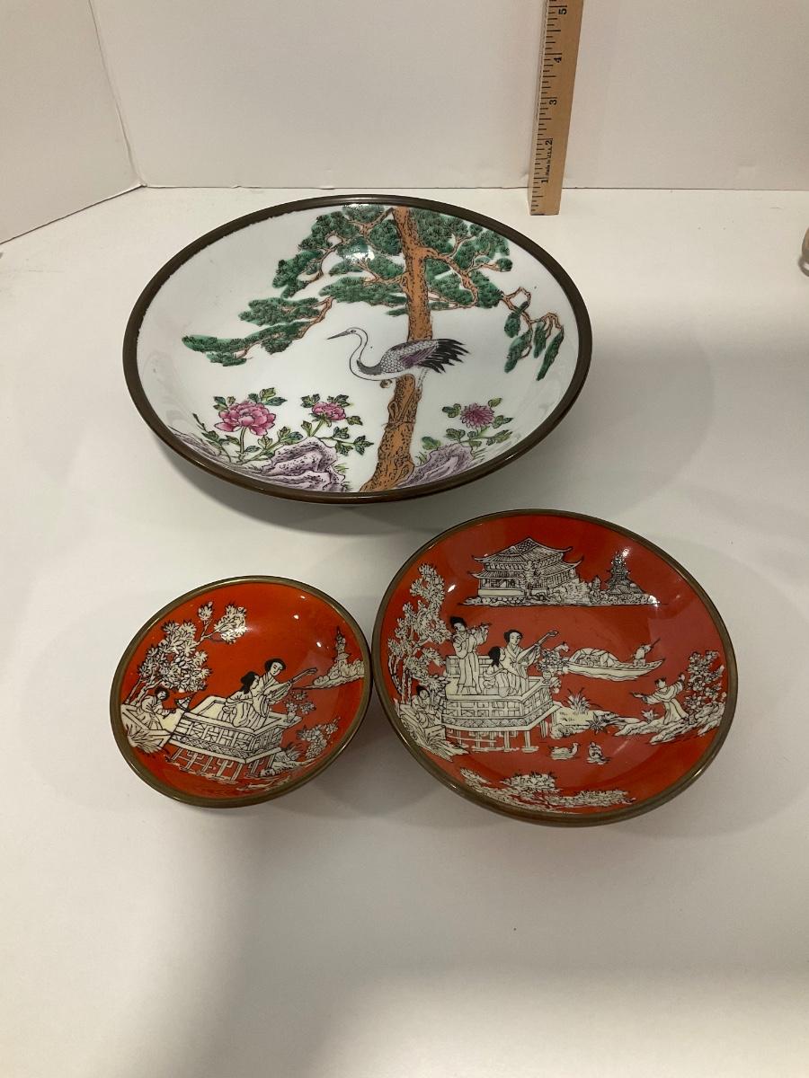 Brass overlay on back door of each bowl with raised print on inside