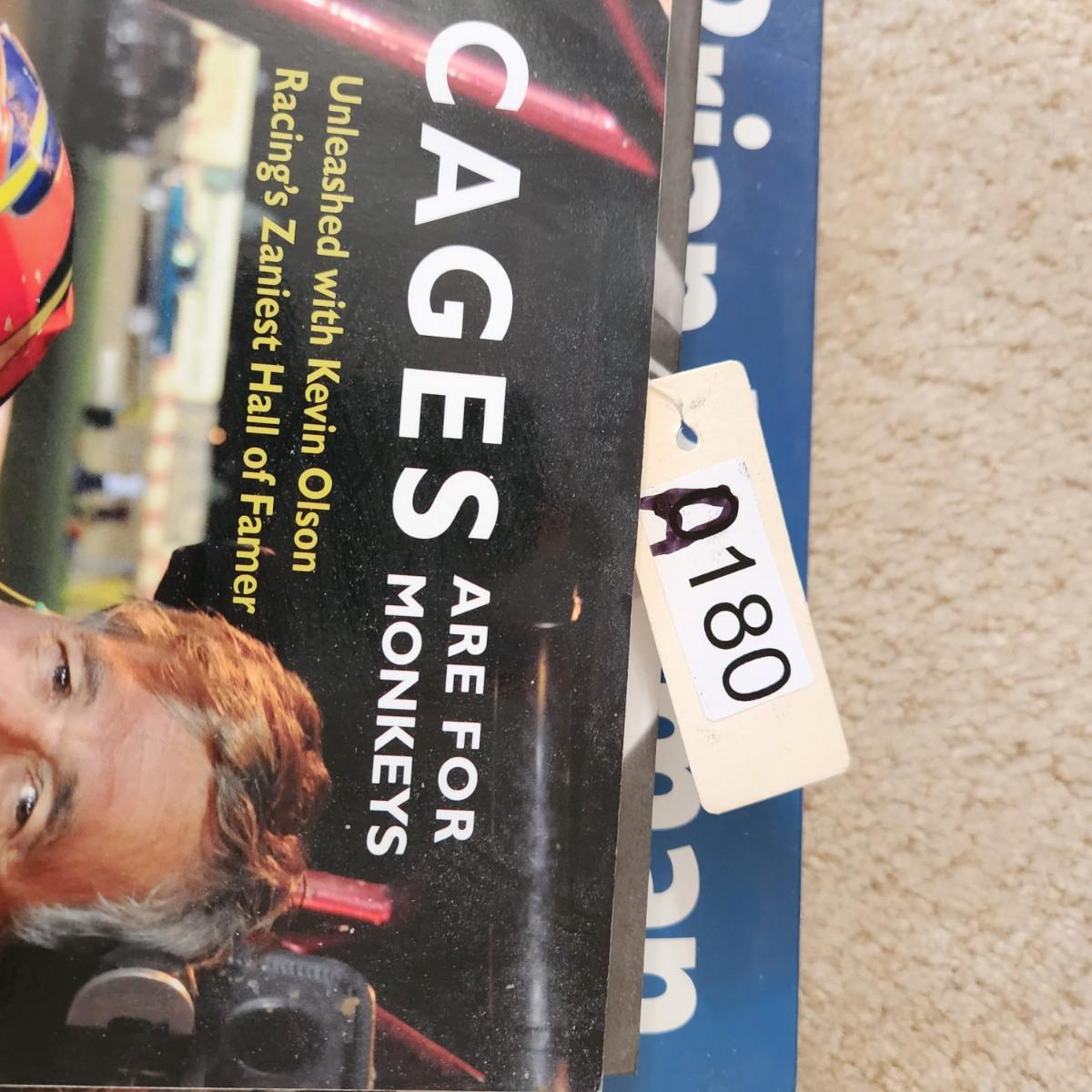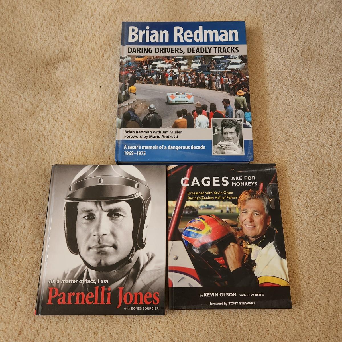 3 Autographed Signed Car Racing Books Parnelli Jones, Brian Redman Daring Drivers Deadly Tracks , Cages are for Monkeys Kevin Olson