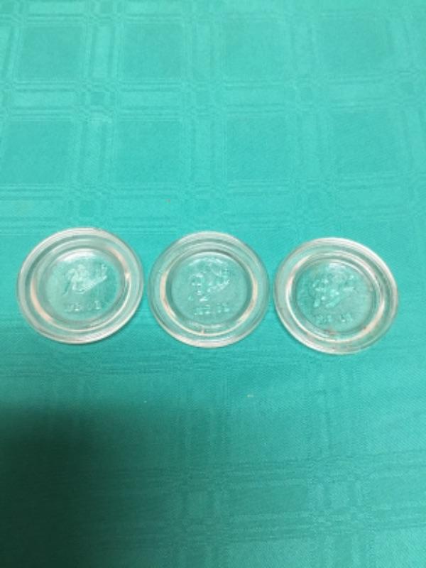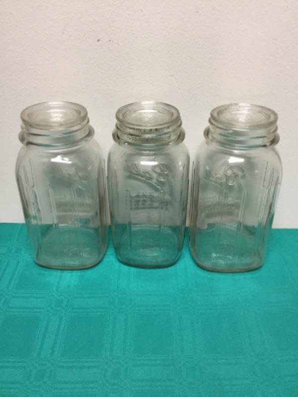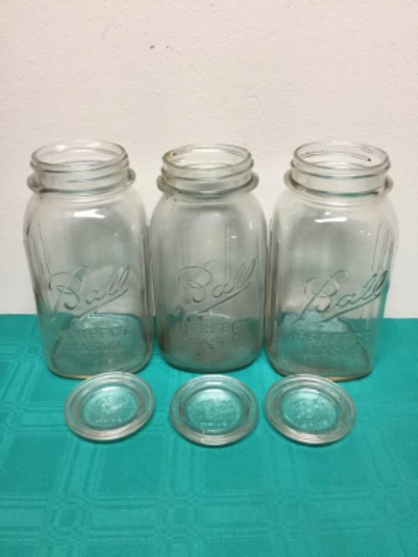 Lot of 3 Ball brand Mason jars with glass Ball no. 10 glass insulators. Two of the mason jars have nine flutes, and one has six flutes.