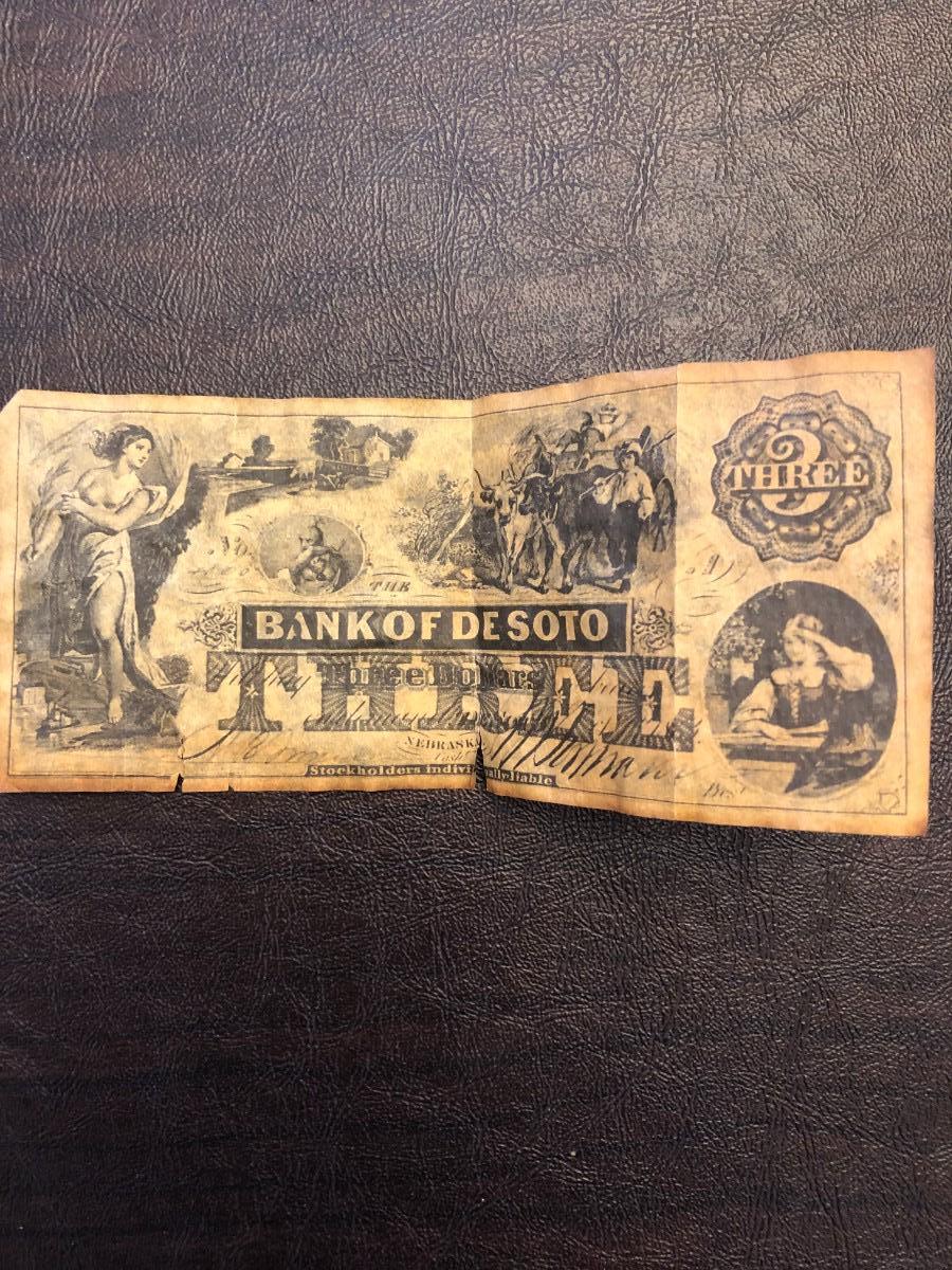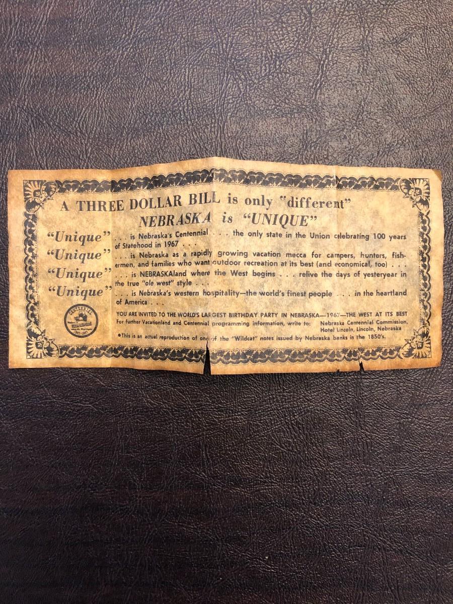 $3 BILL REPRODUCTION 1850'S WILDCAT NEBRASKA BANK NOTE