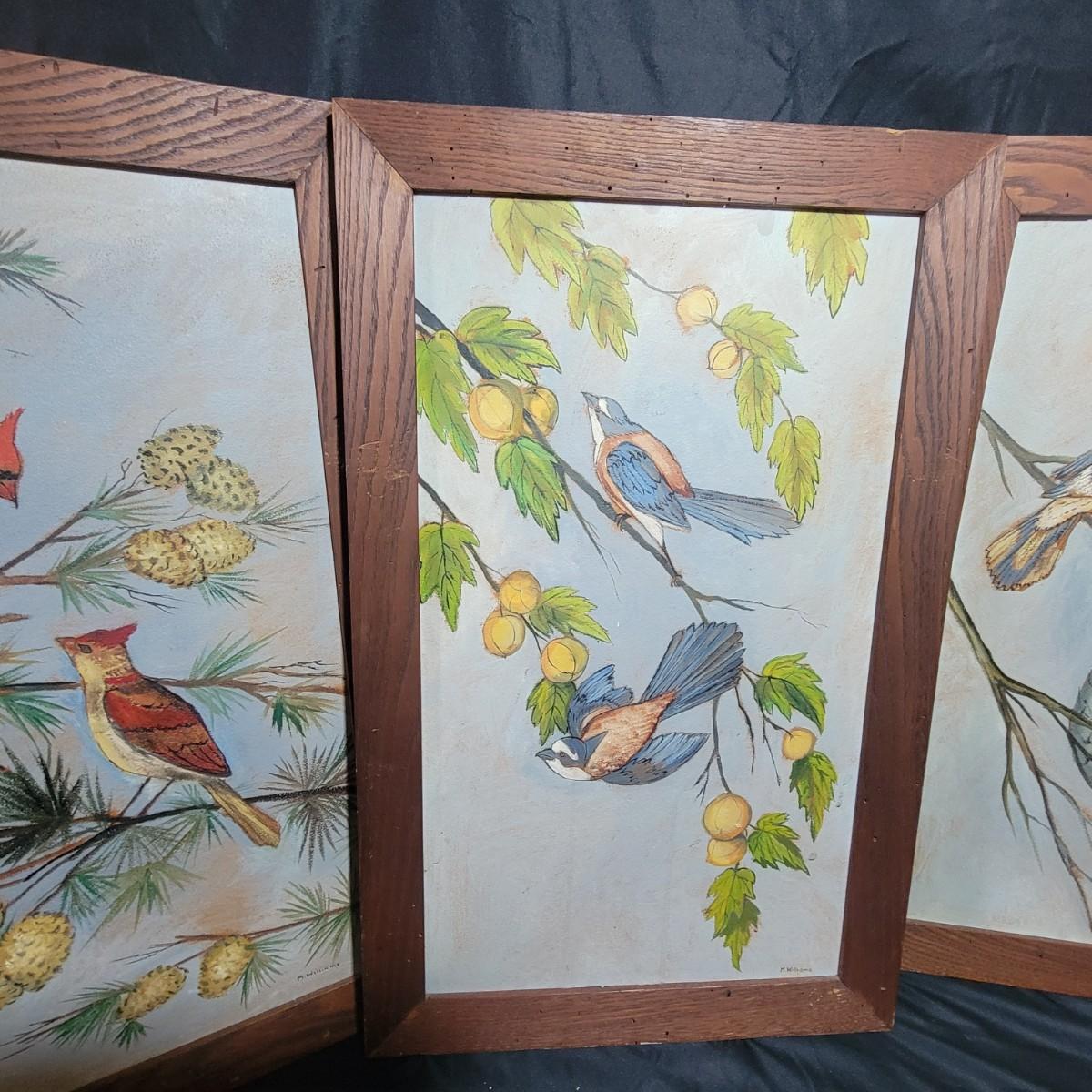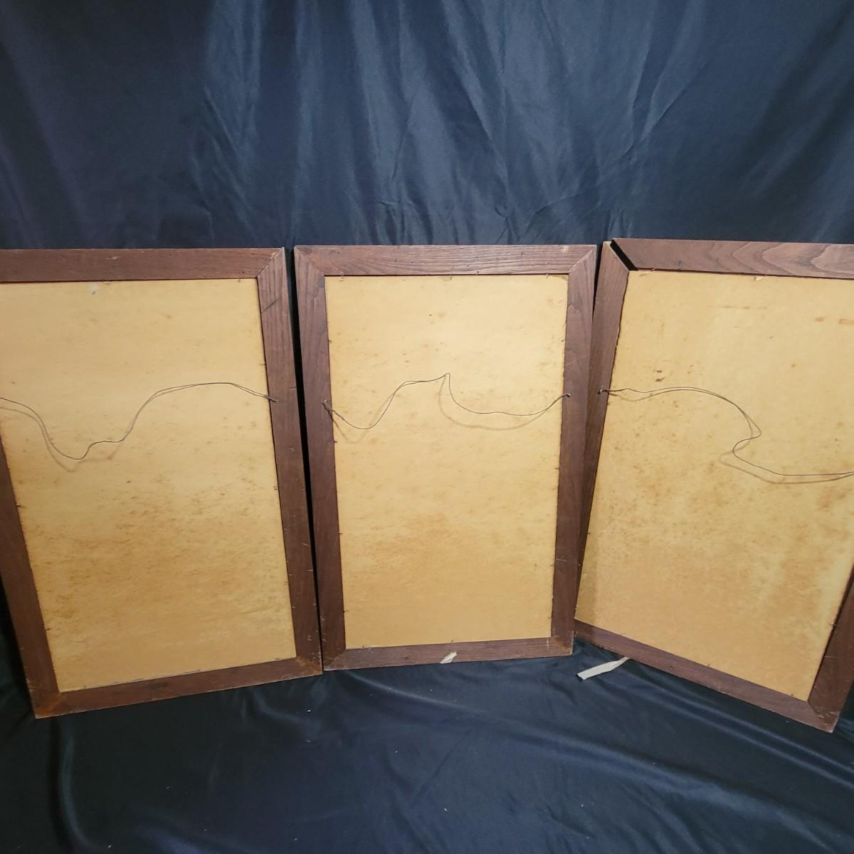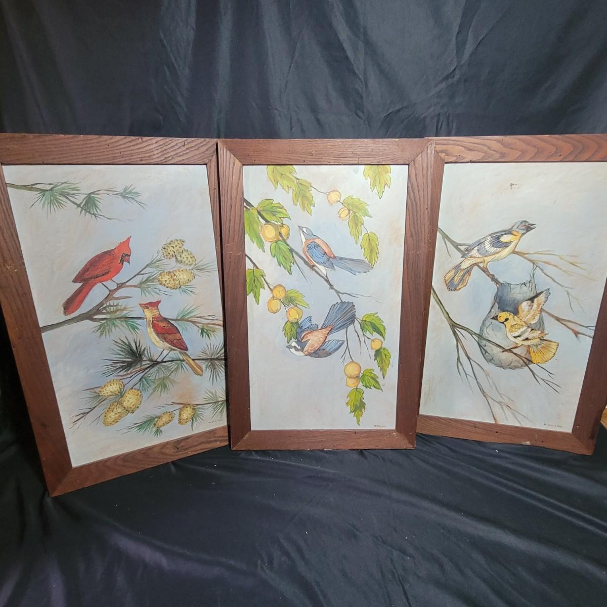 These appear to be originals in pastels on a board and sealed well. Frames are wormy oak and measure approximately 18" x 28" outside dimensions. 2 frames have damaged corners and all 3 have some surface damage. Shipping Available