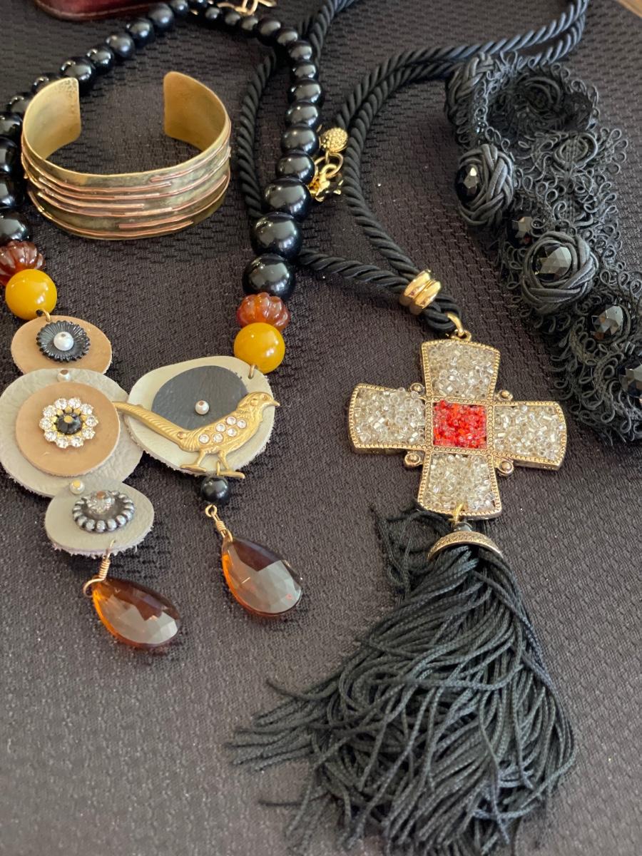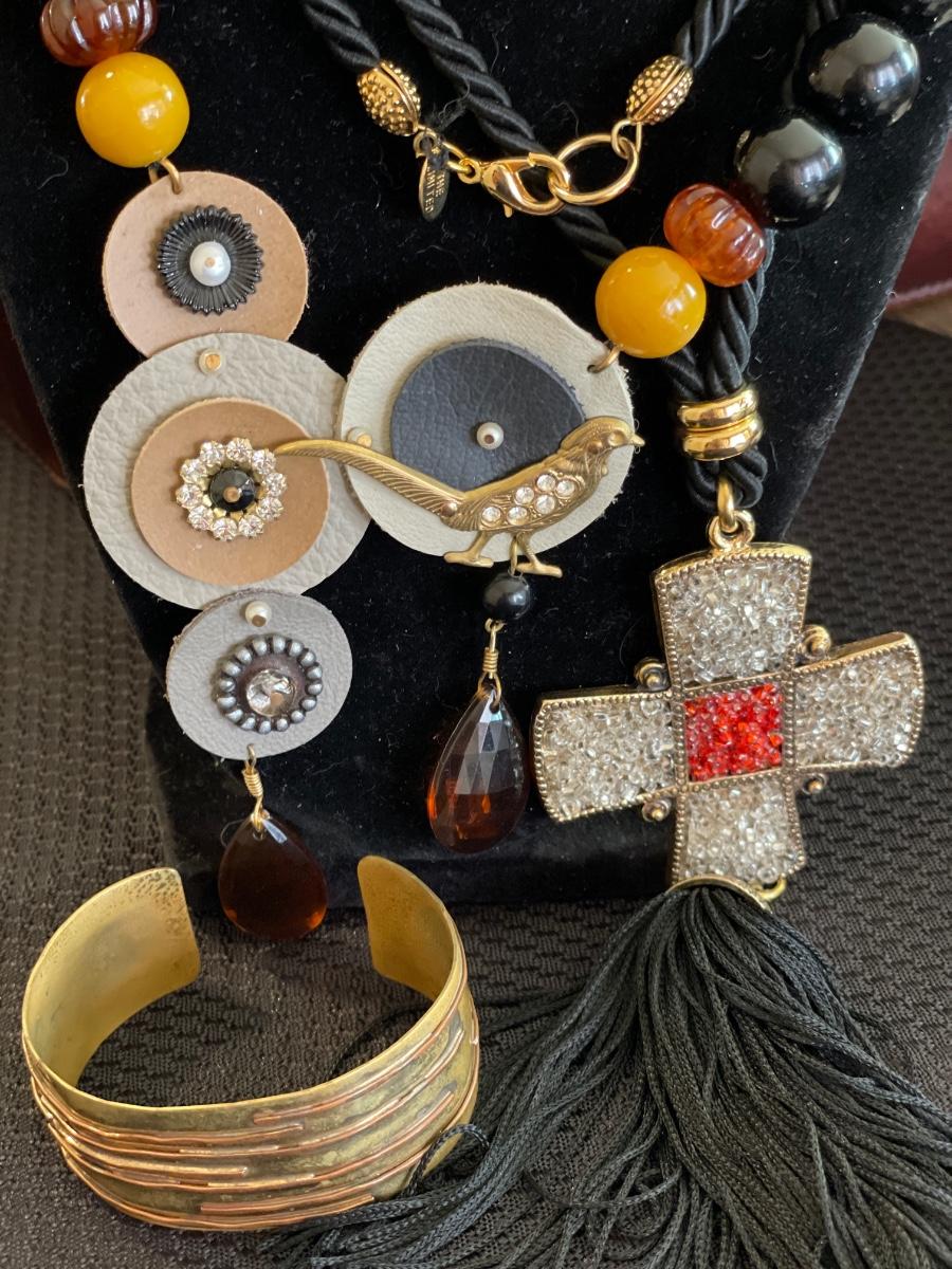 3 Black necklaces with brass cuff bracelet