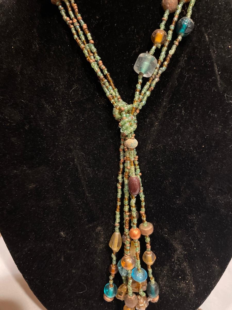 Multi colored bead necklace is long and dangling