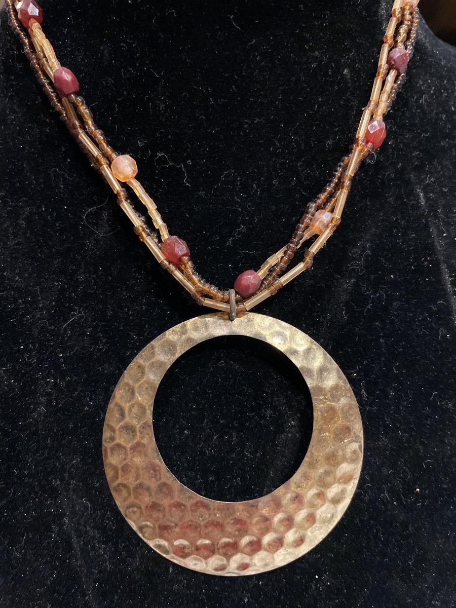 Brown bead necklace has large brass colored pendant