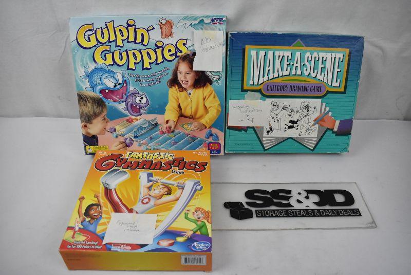 3 Board Games: Gulpin' Guppies (missing instructions) Make A Scene (Missing instructions & 1 clip) Fantastic Gymnastics (Gymnast won't release)