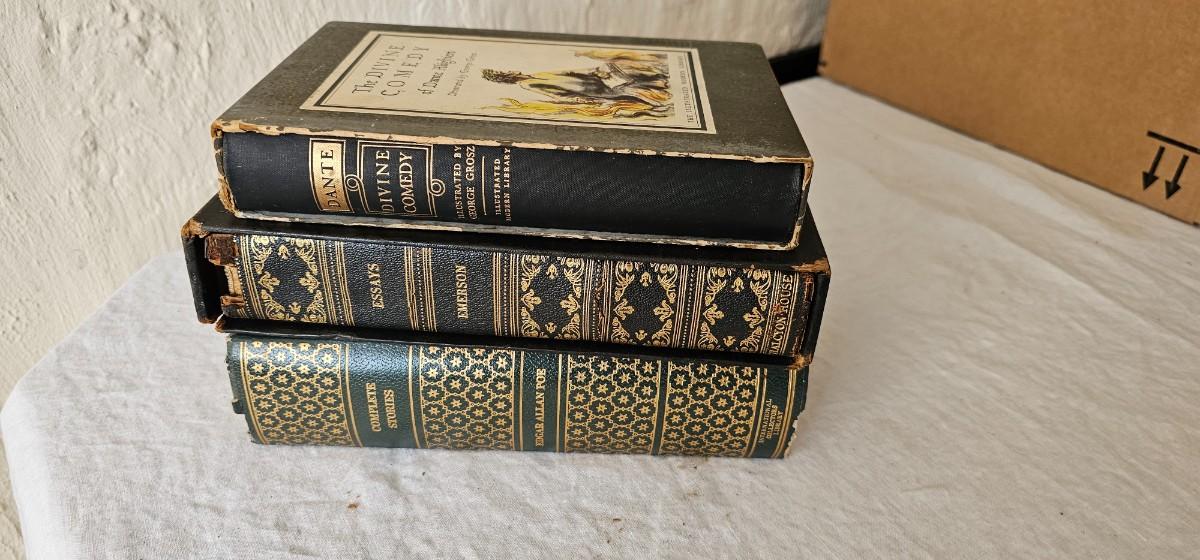3 Antique book lot Dante Divine Comedy, Essays Ralph Waldo Emerson, Complete Stories Edgar Allen Poe