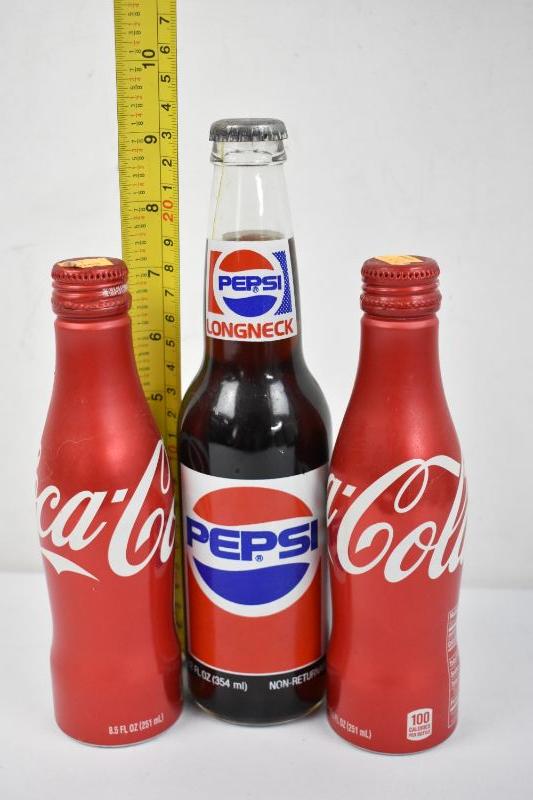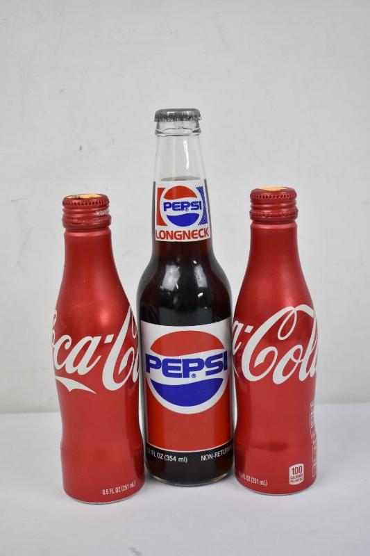 3 Bottled Sodas: 2 Coca-Cola 8.5 oz & 1 Pepsi 12 oz. Unopened