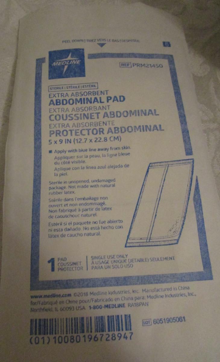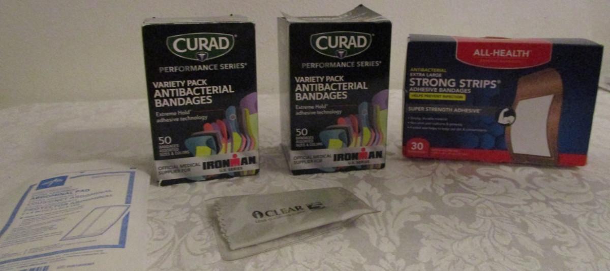 3 boxes bandages, lens cloth, extra absorbent abdominal pad