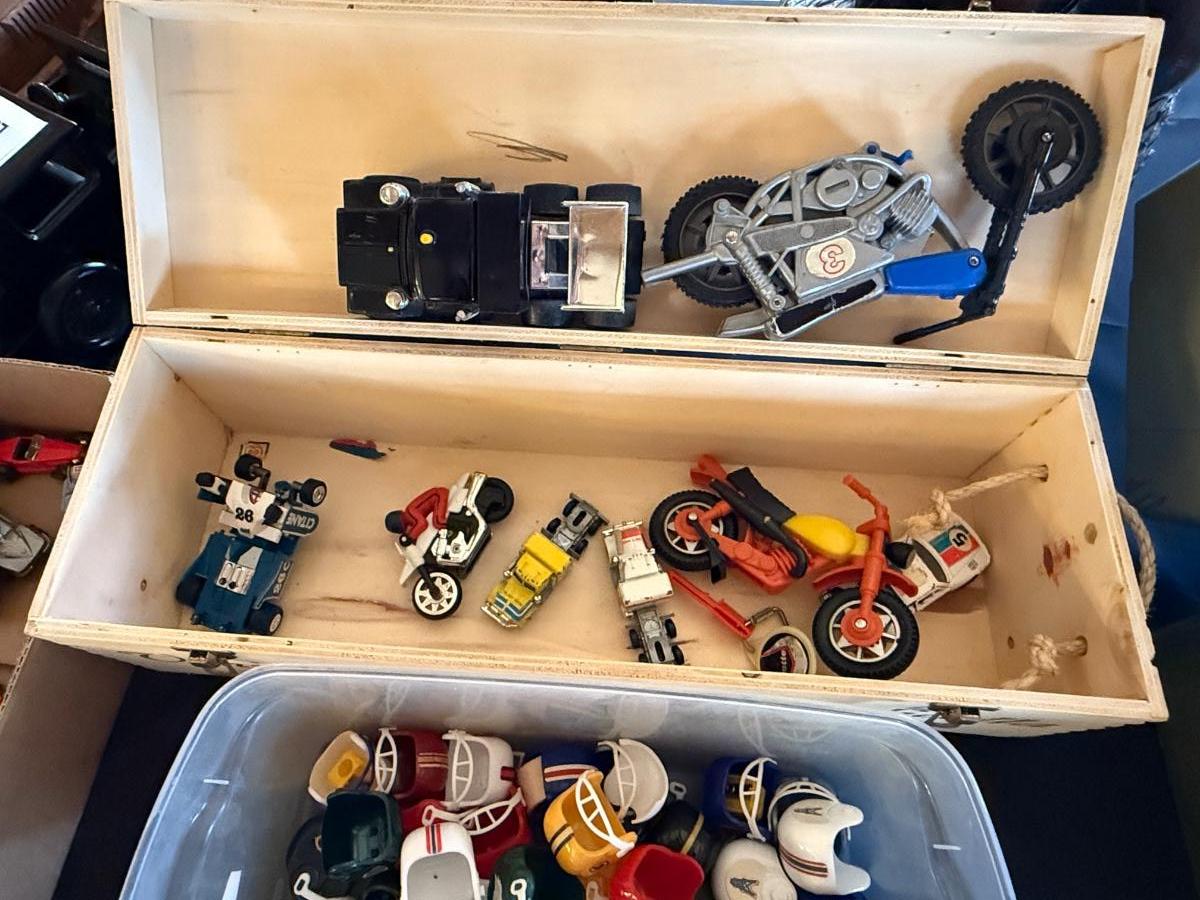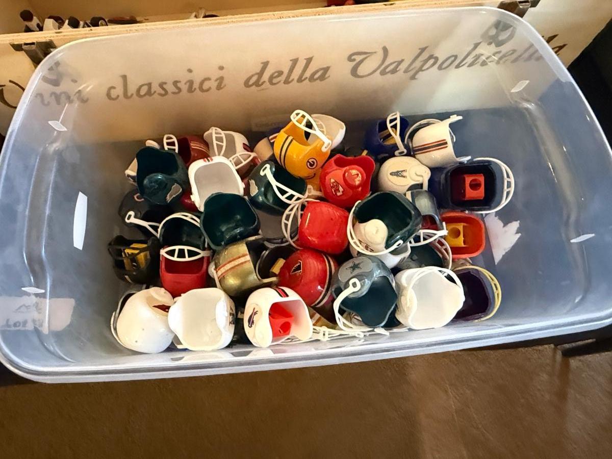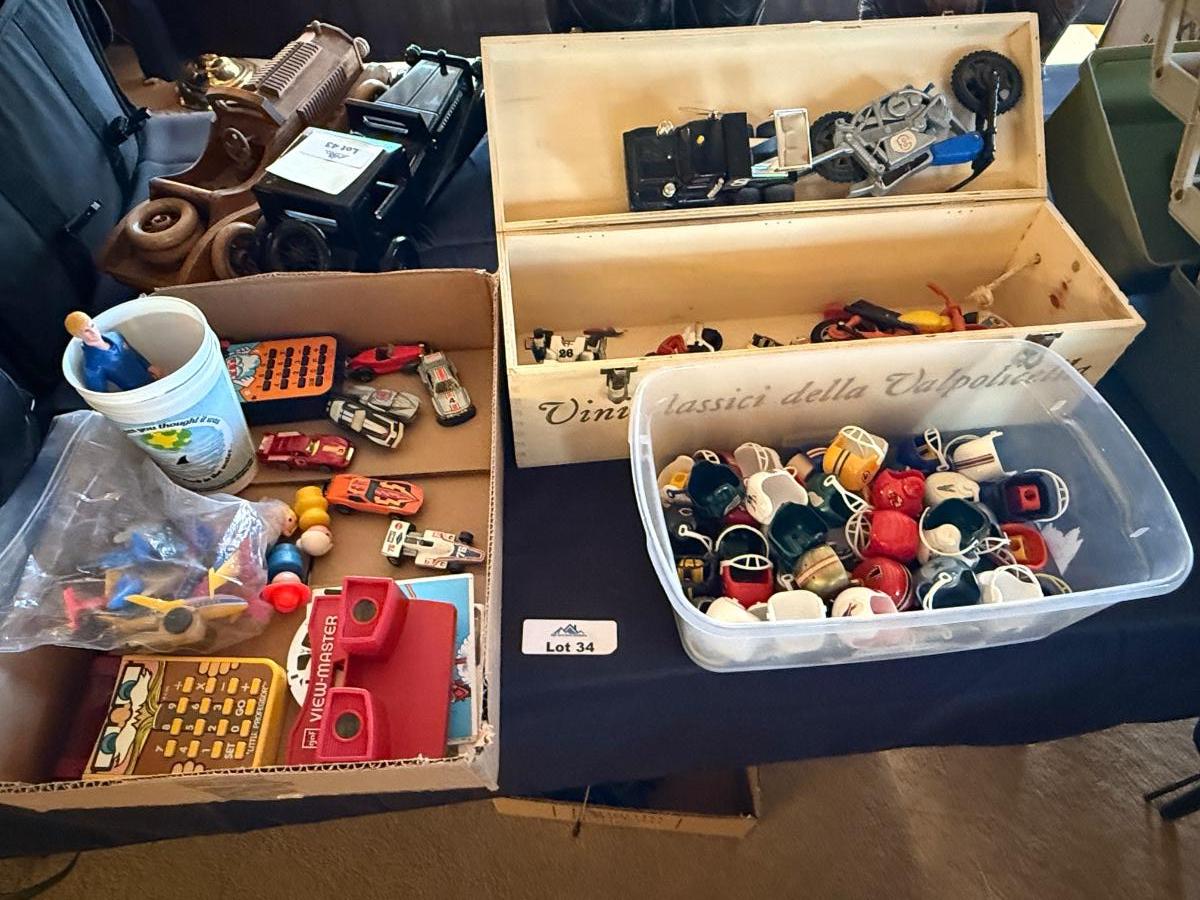 3 Boxes Vintage Toys-View Master w/some slides, mini NFL football Helmets, cars