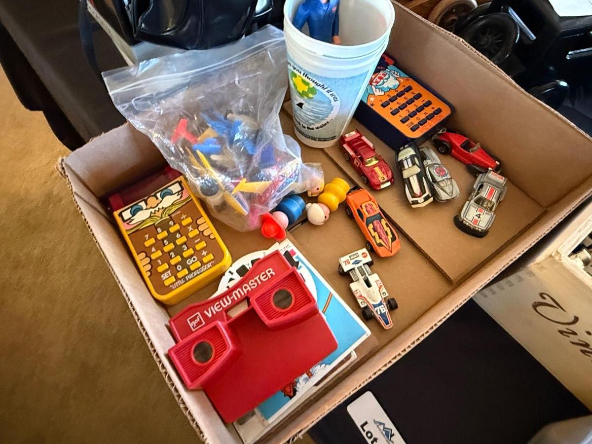 all vintage toys including about 7 Hot Wheels, 2 electronic Texas Instruments Calculators, 3 little people, Jaws cups and other small toys as shown