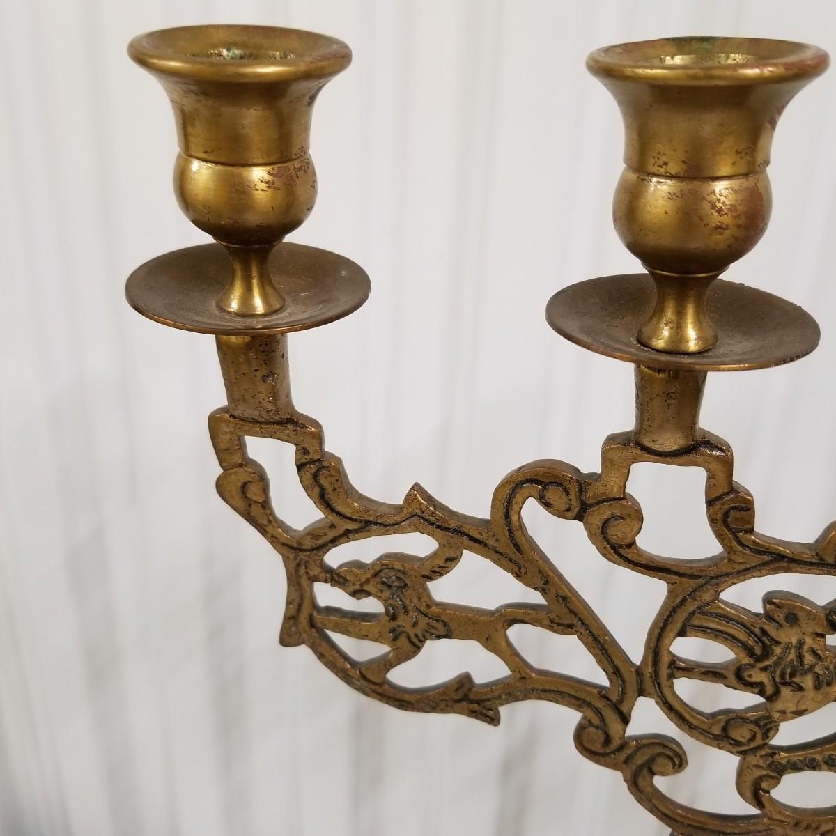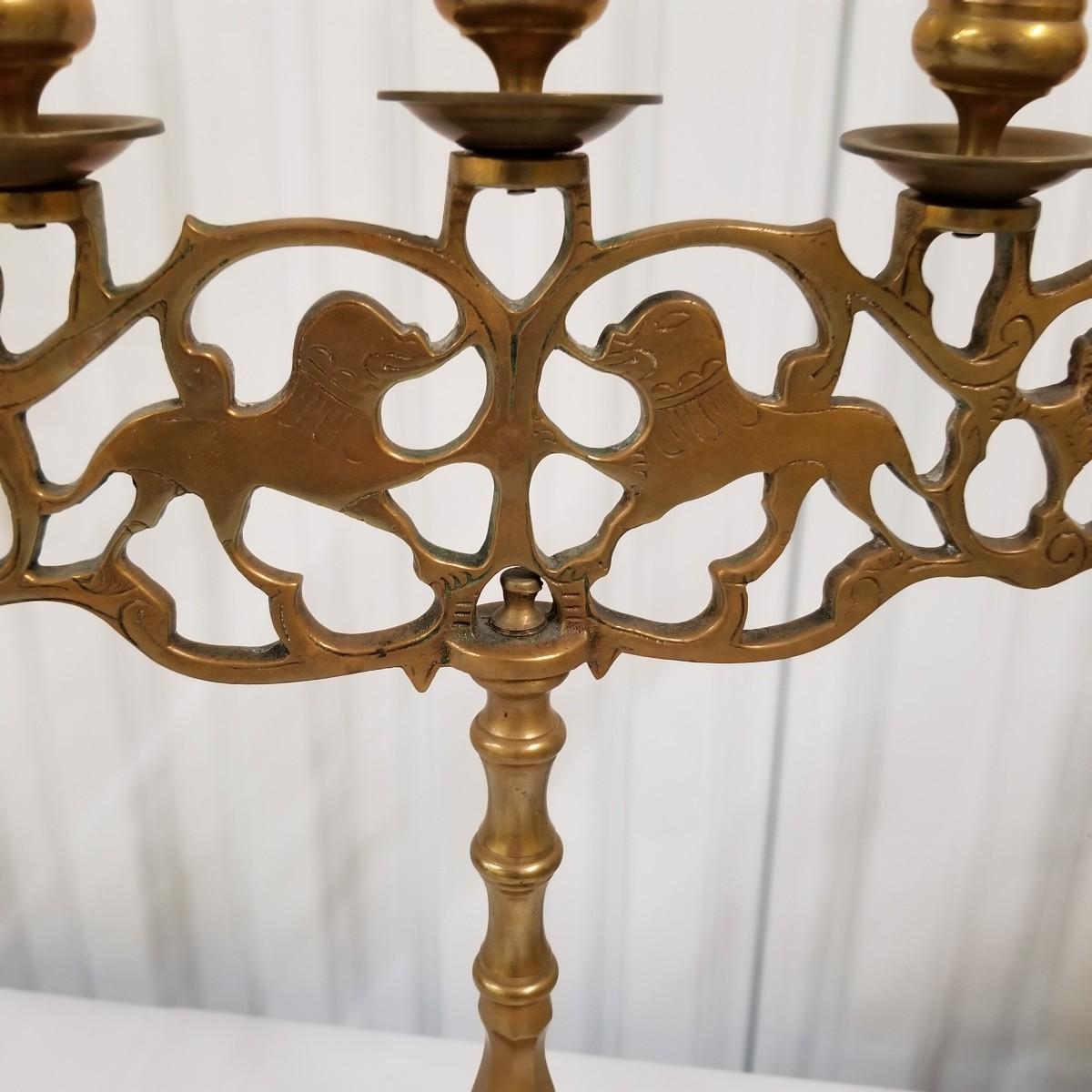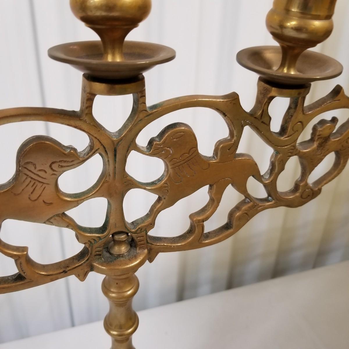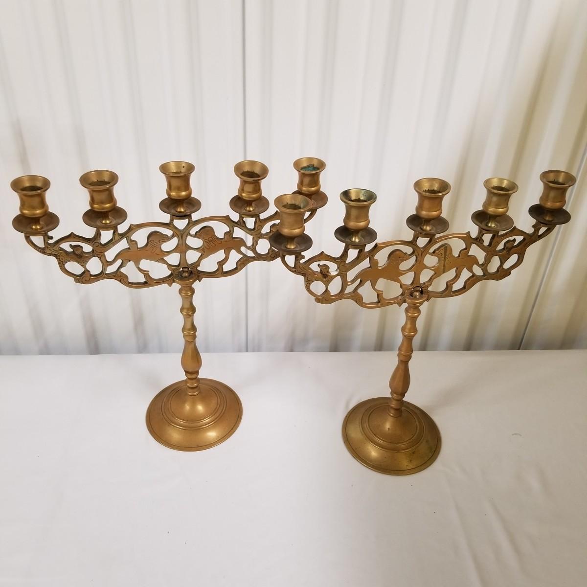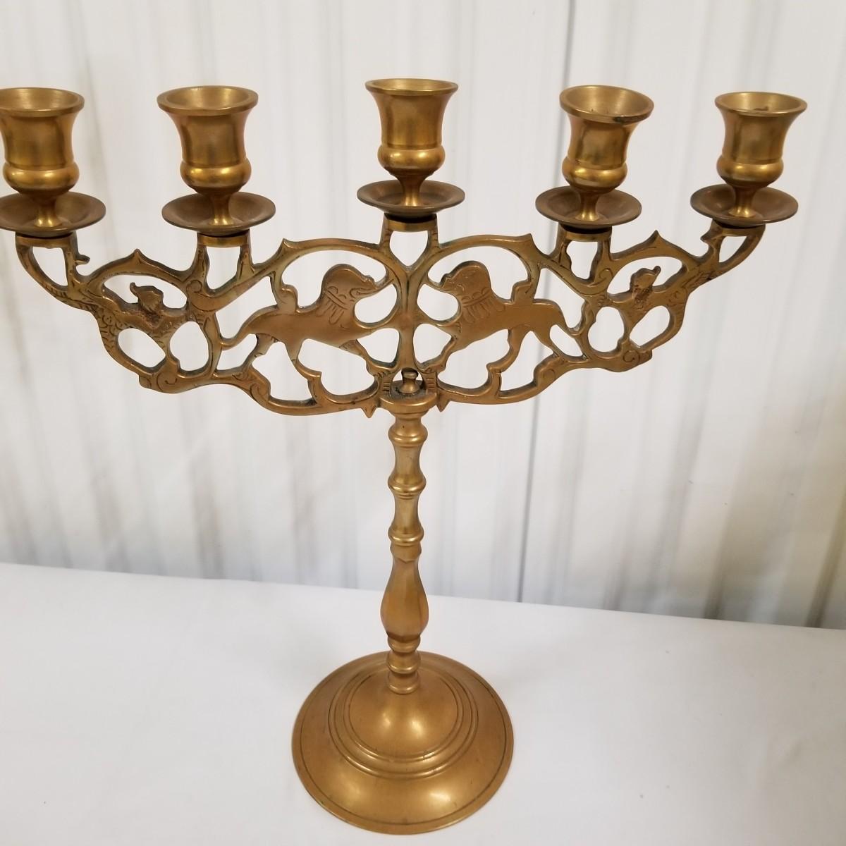 One large and two smaller solid brass candle holders with animal motif designs.  Large piece holds seven candles, is 22"x22"x6.5". Two smaller pair hold five candles each, are 14.5"x16"x6".  Turned columns on all pieces, see photos for detail.  Very heavy set. Local pickup only.