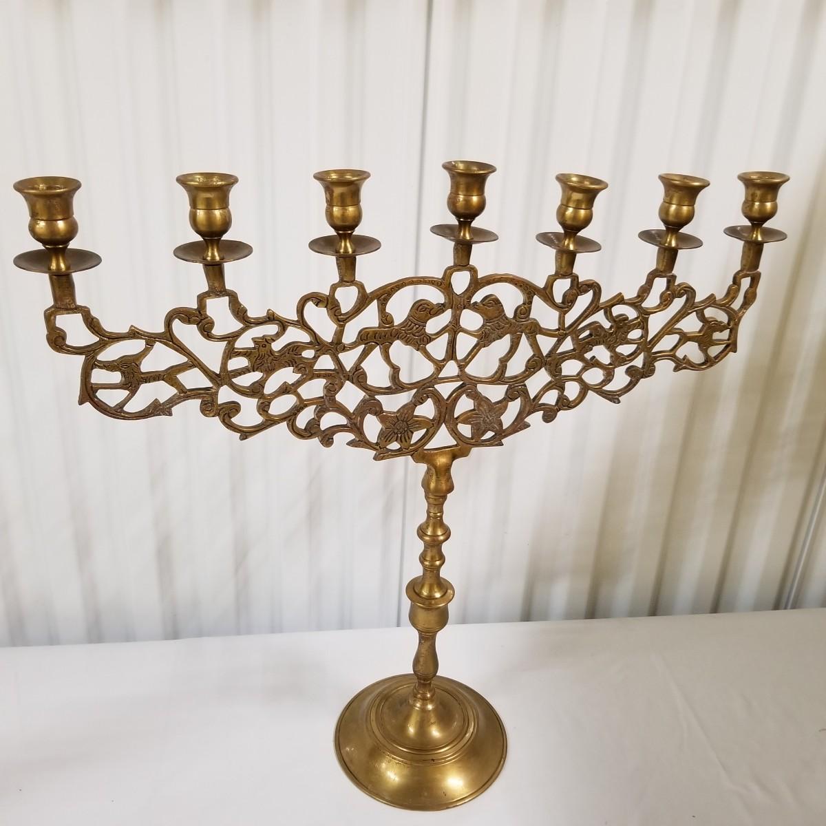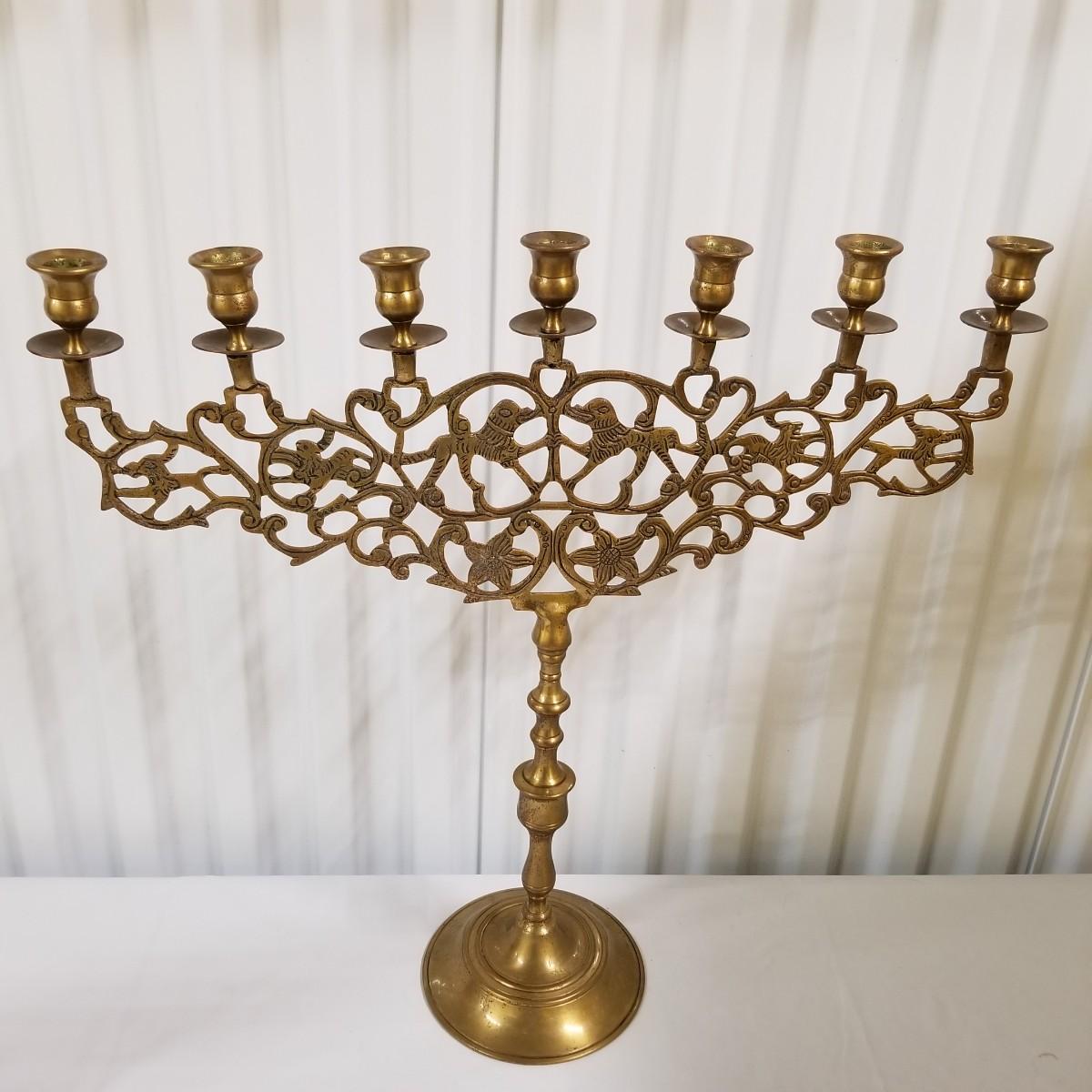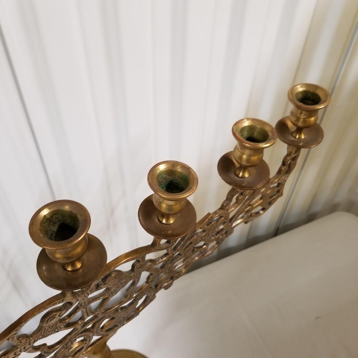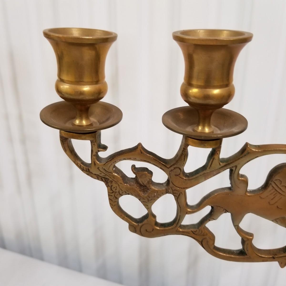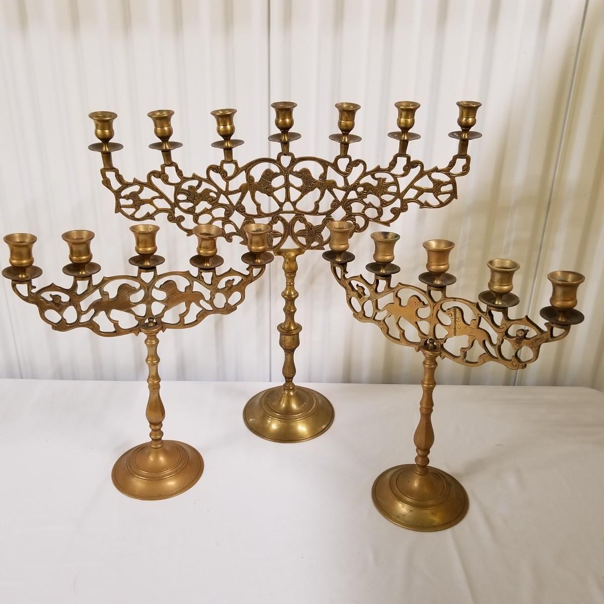 One large and two smaller solid brass candle holders with animal motif designs.  Large piece holds seven candles, is 22"x22"x6.5". Two smaller pair hold five candles each, are 14.5"x16"x6".  Turned columns on all pieces, see photos for detail.  Very heavy set. Local pickup only.