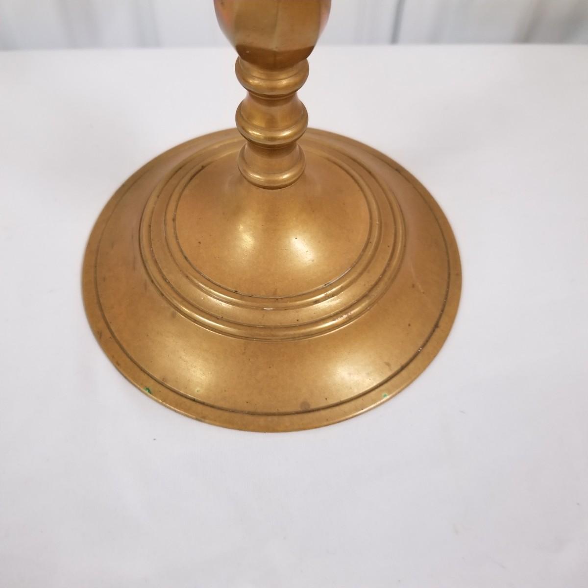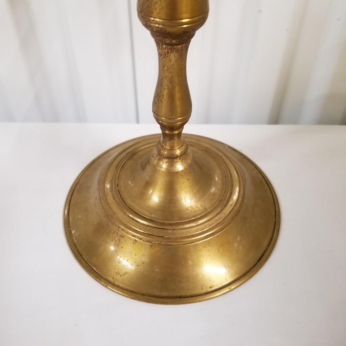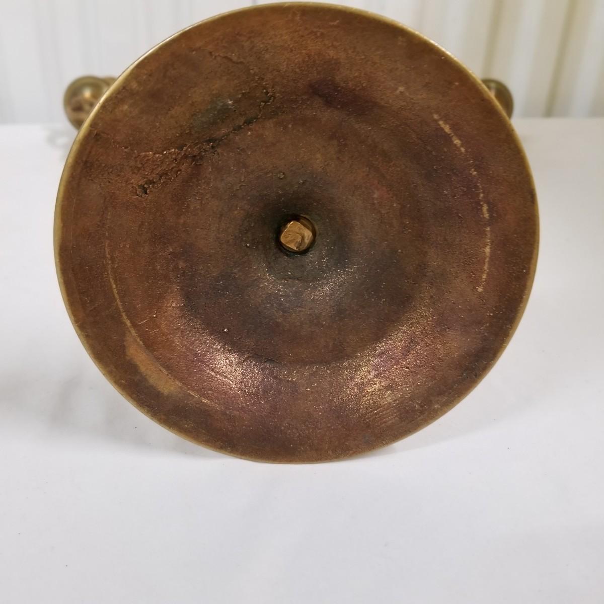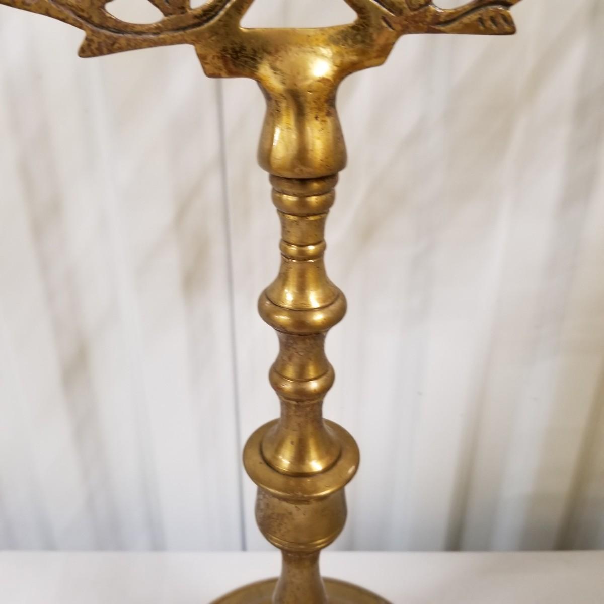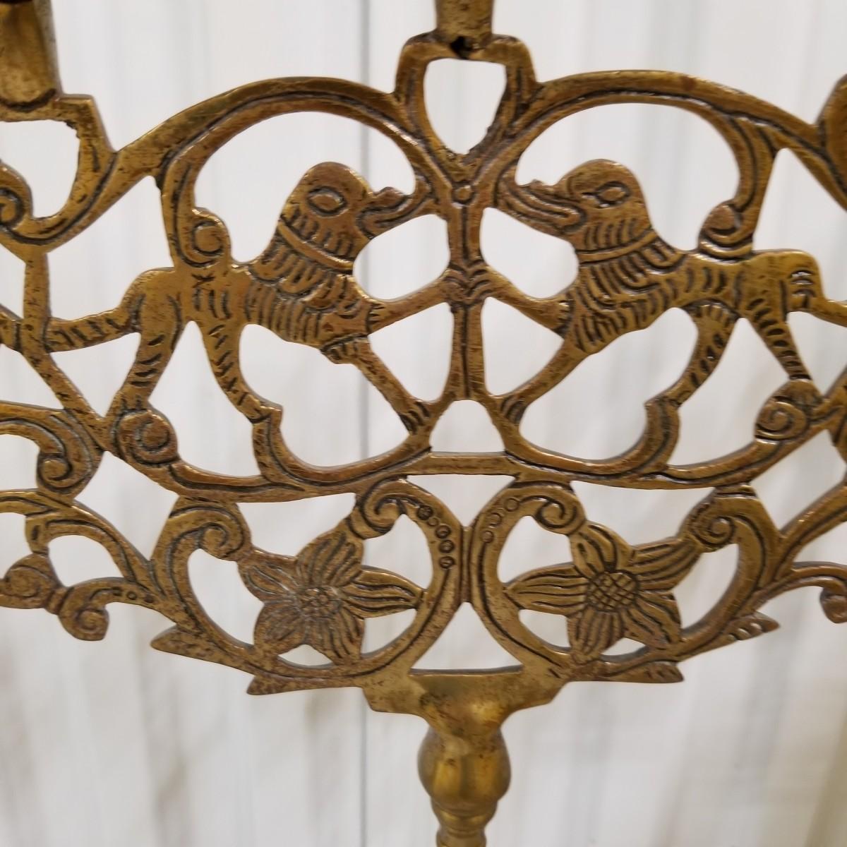 One large and two smaller solid brass candle holders with animal motif designs.  Large piece holds seven candles, is 22"x22"x6.5". Two smaller pair hold five candles each, are 14.5"x16"x6".  Turned columns on all pieces, see photos for detail.  Very heavy set. Local pickup only.