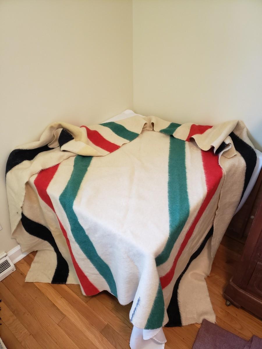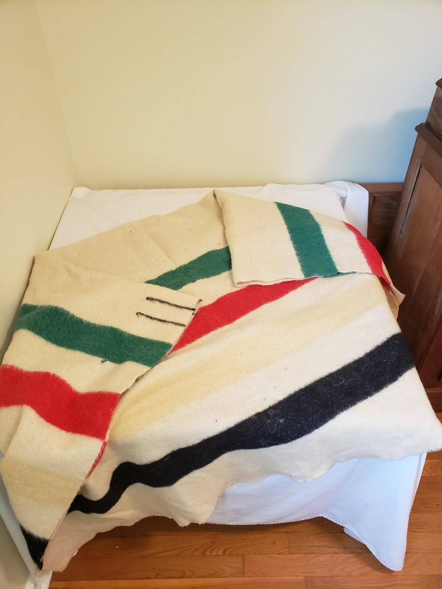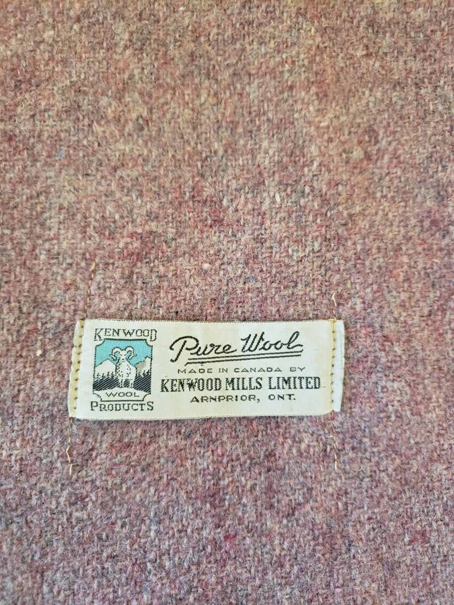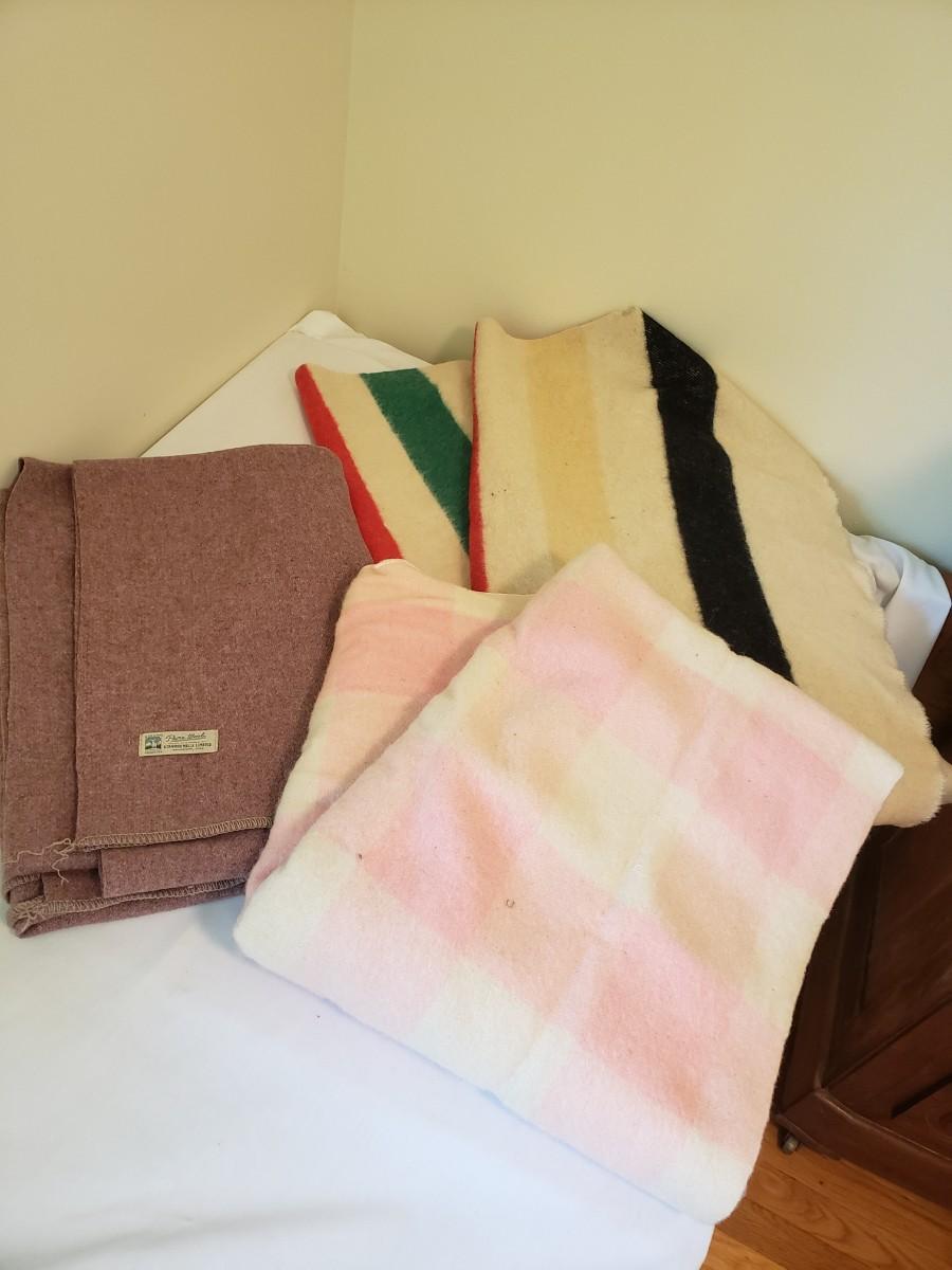 The pink and white checkered wool blanket would be perfect on a cold day! The blanket measures 62"x80" and appears to be in good condition. The Kenwood Mills Purple wool blanket measures 62"x80" and also appears to be in really good condition. The last wool blanket is a cream color with green, yellow, red and black stripes by Hudson's Bay Company on each side of the middle. This blanket does have 2 patched spots as seen in the pictures, yet would keep you cozy warm. This measures 62"x80". Shipping available.