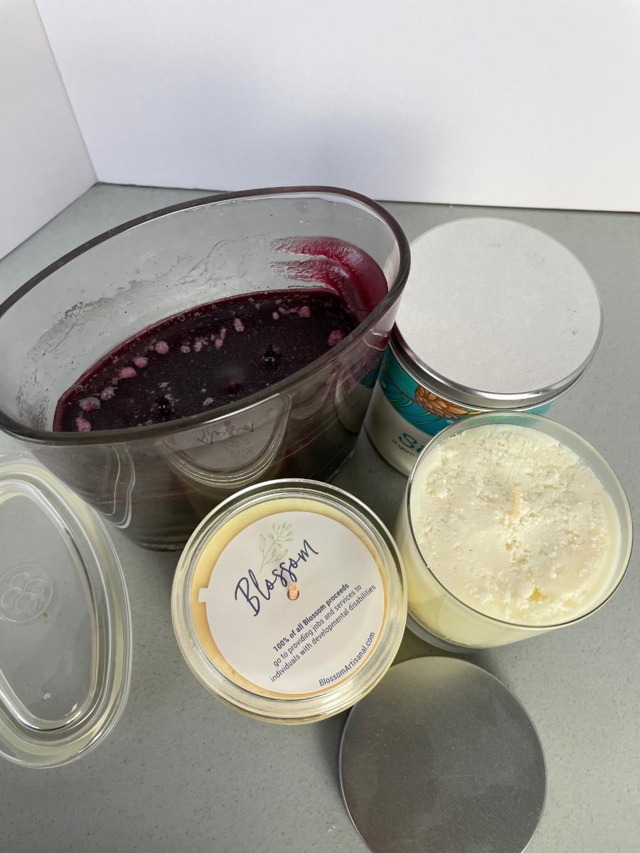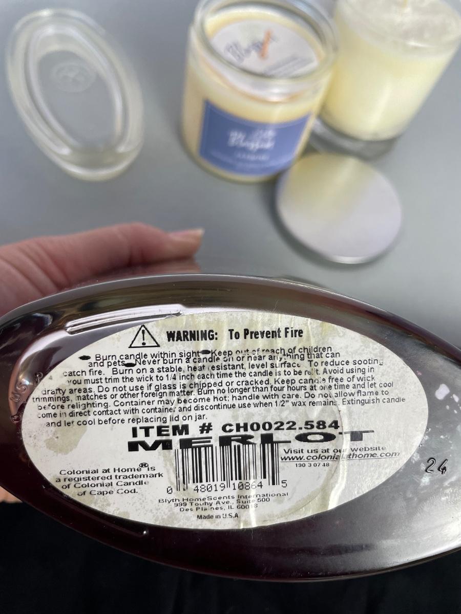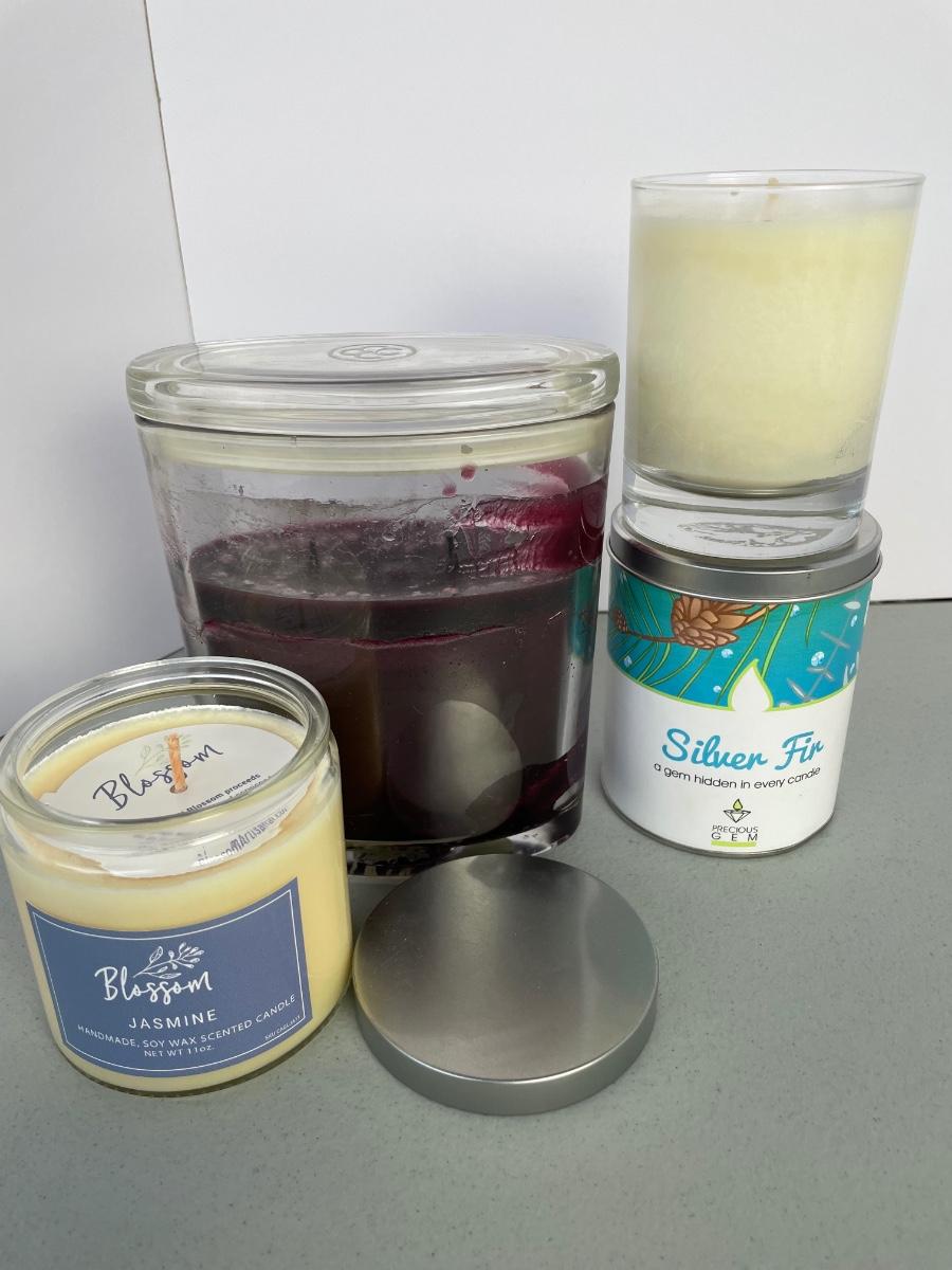 New candles are soy wax in Jasmine and Silver Fir scents, and the big candle is Colonial Home in Merlot scent.