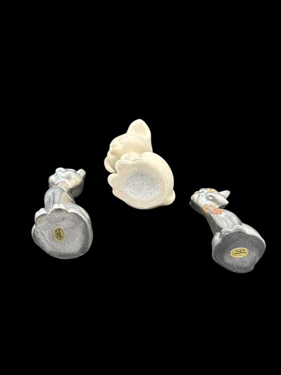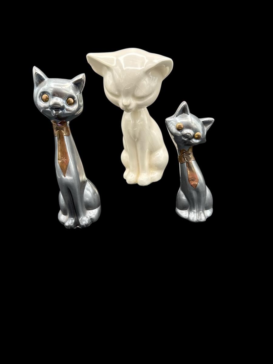 Includes two sleek pewter cats with gold eyes and neckties (made in Hong Kong) and one glossy ivory ceramic cat 9 “ tall with a minimalist design.