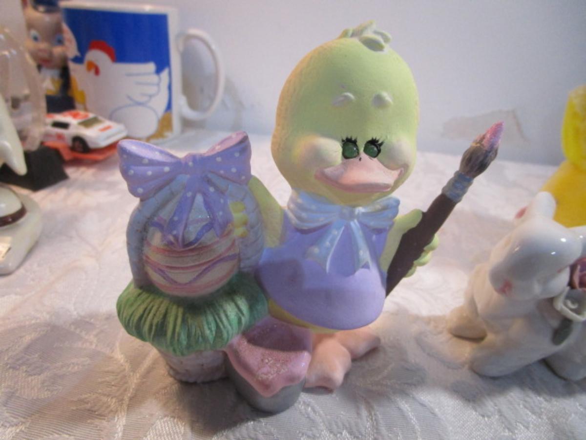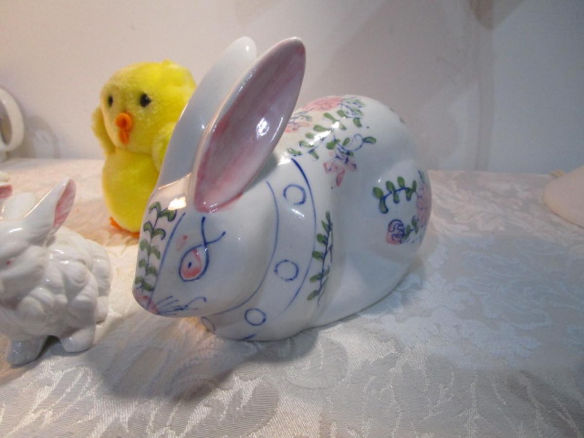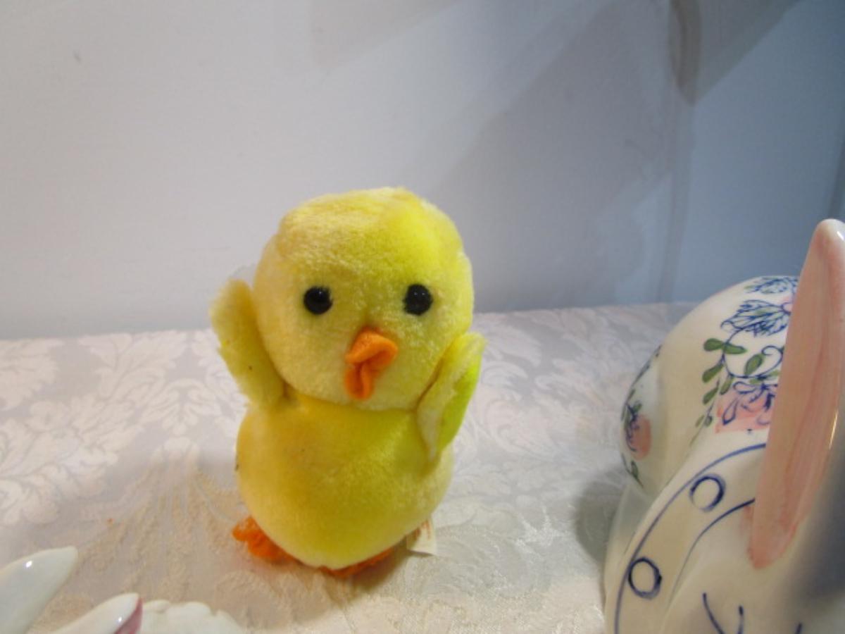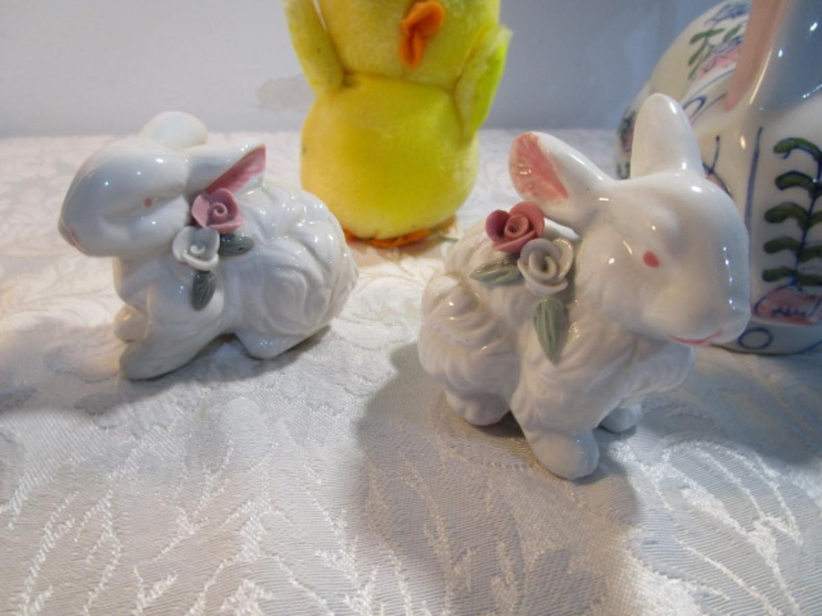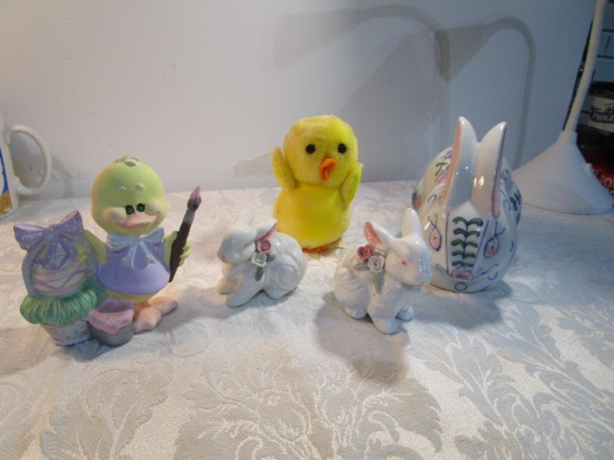 3 ceramic bunnies, 1 stuffed duckie, 1 duck figurine
