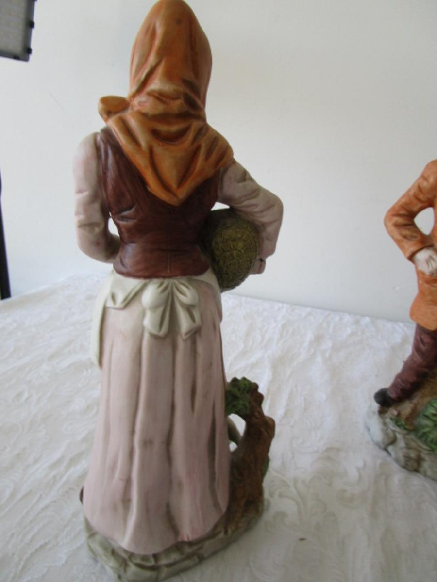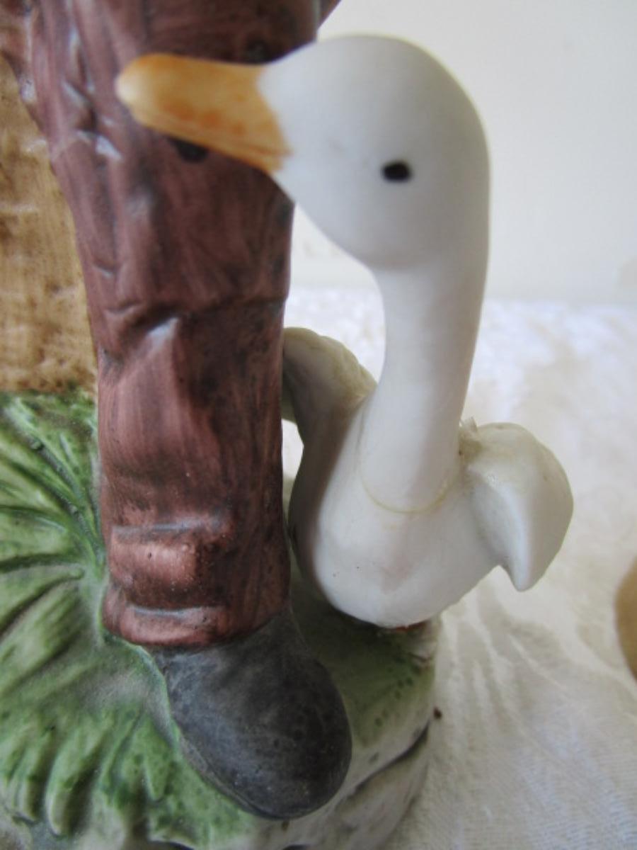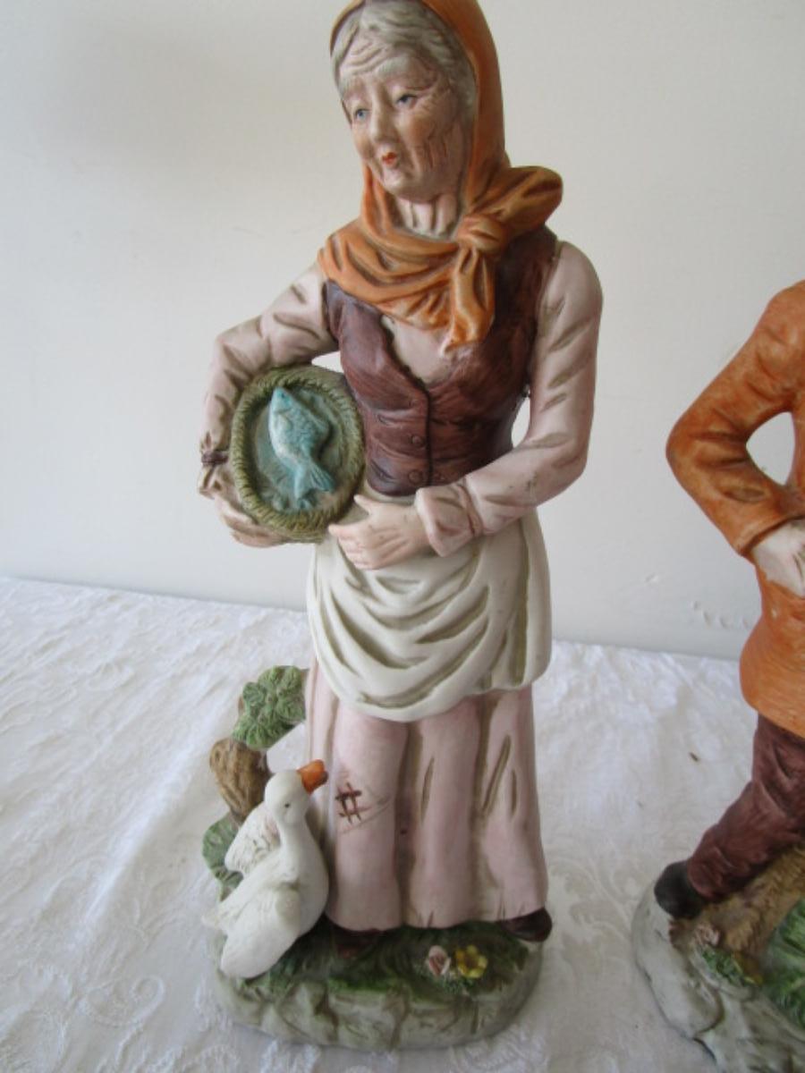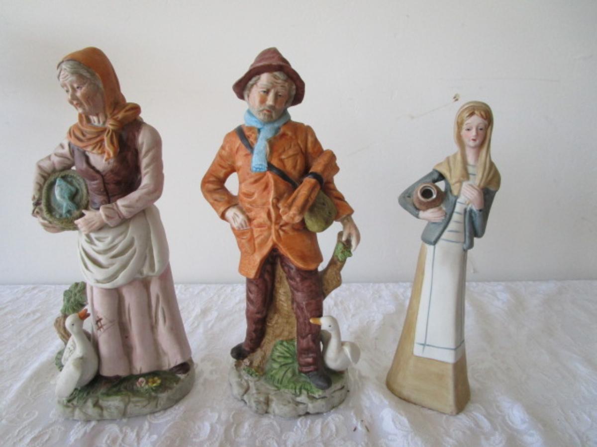 3 ceramic figurines, 1 man & 1 woman each with a goose, young woman