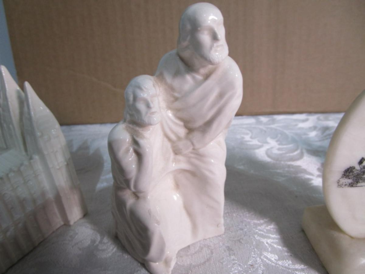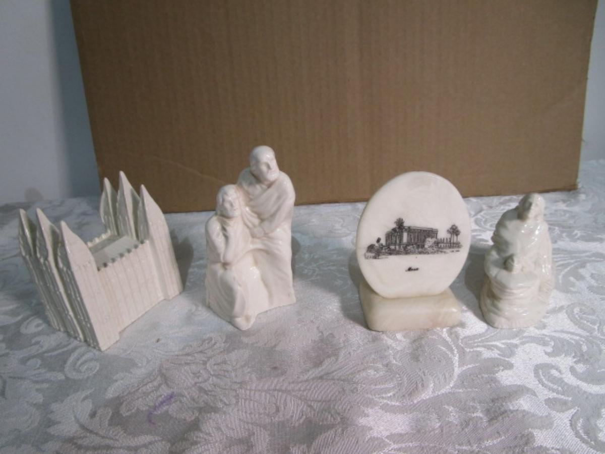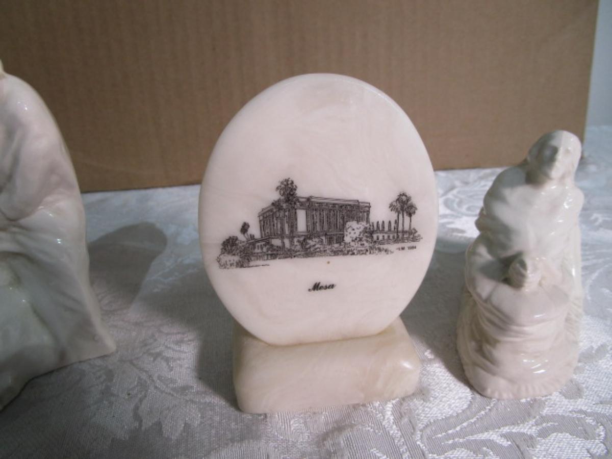 3 ceramic figurines (SL temple, Jesus, 2 men), 1 Mesa temple carving