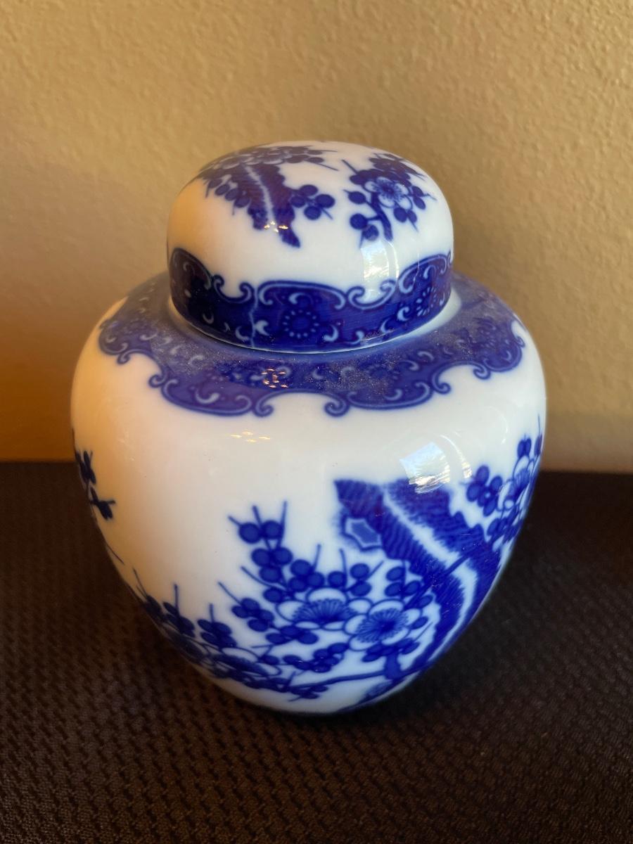 Blue vase, Asian inspired vase with lid and beach theme
