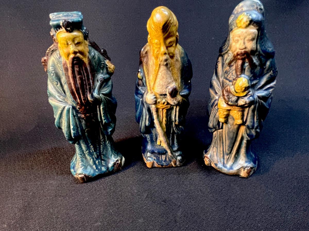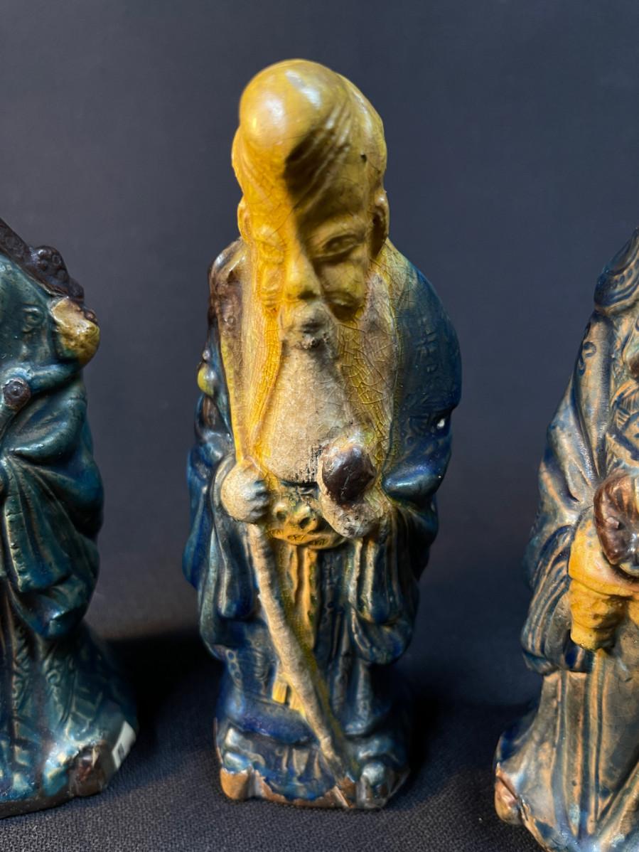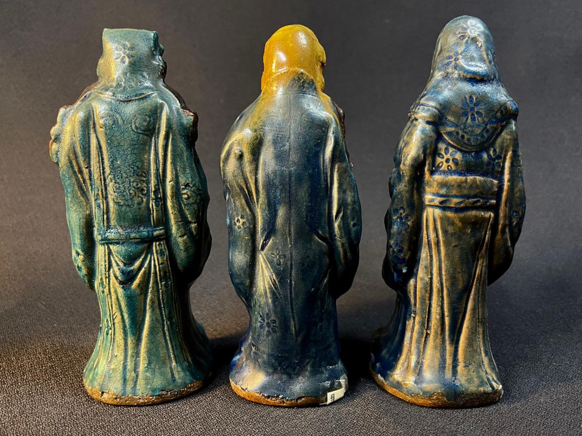DESCRIPTION: This lot includes three crudely cast and glazed pottery Lohans venerated in the Chinese pantheon of wise men. All three have been glazed with the famous sancai three-color glaze.