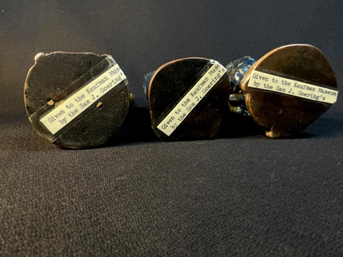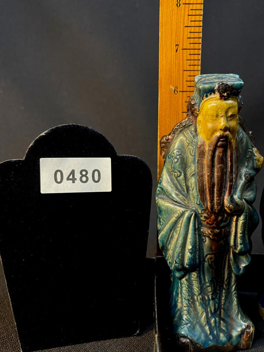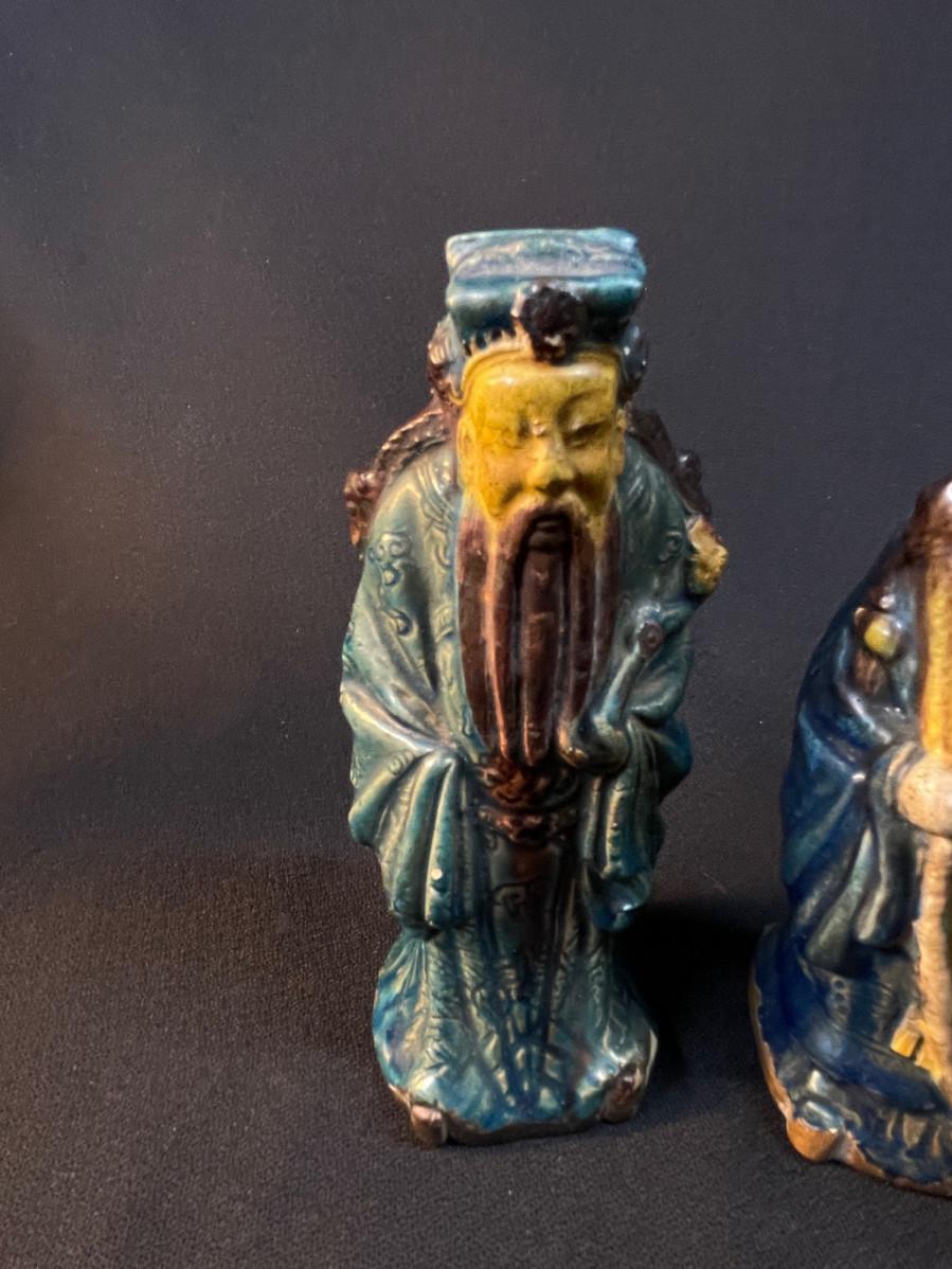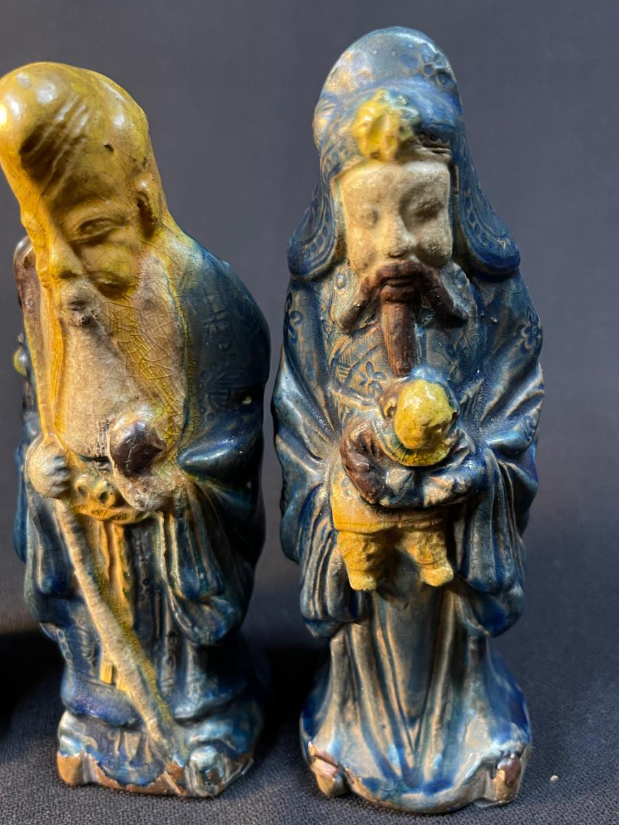 DESCRIPTION: This lot includes three crudely cast and glazed pottery Lohans venerated in the Chinese pantheon of wise men. All three have been glazed with the famous sancai three-color glaze.