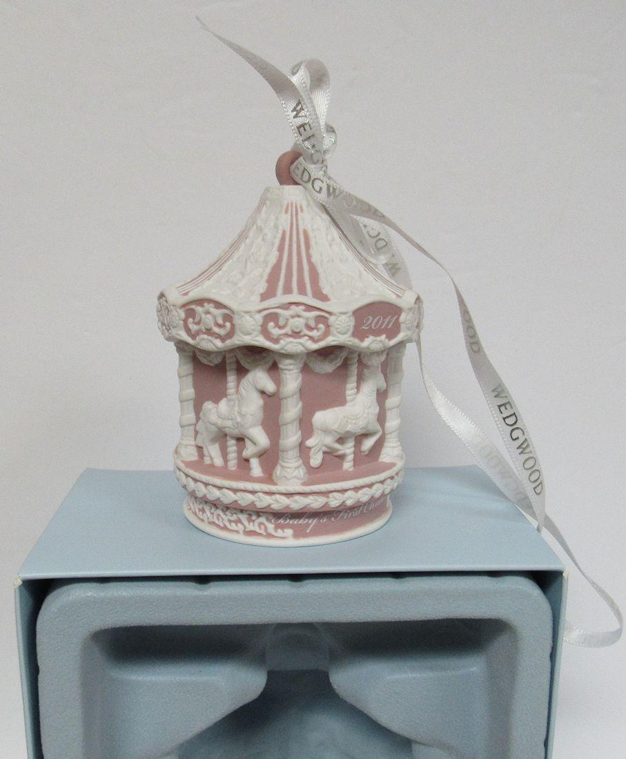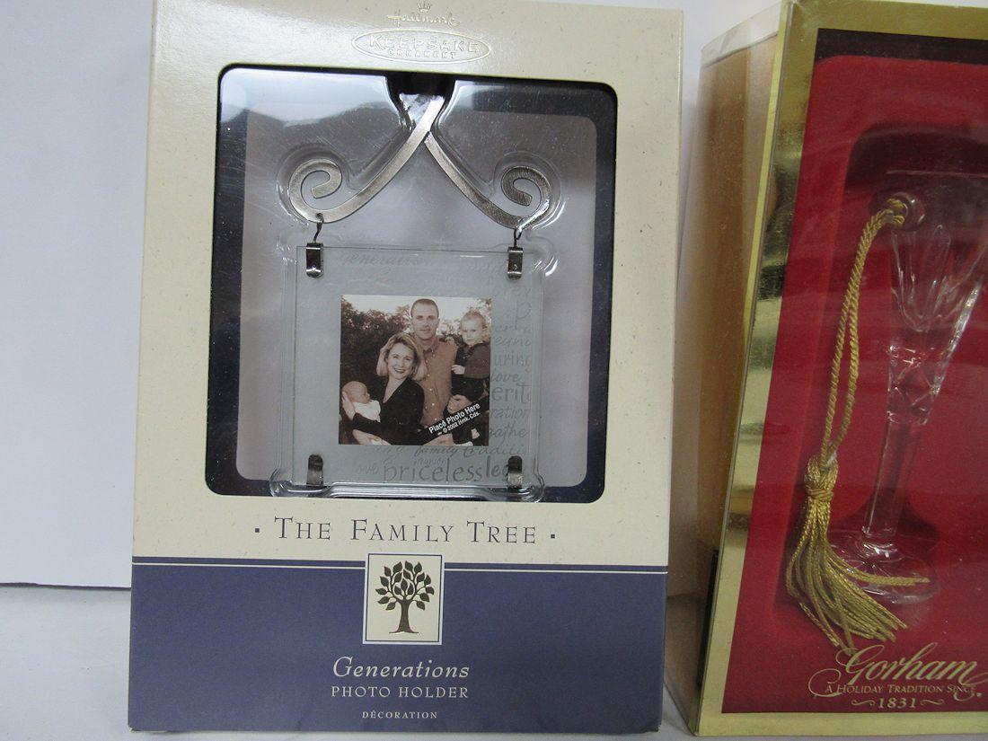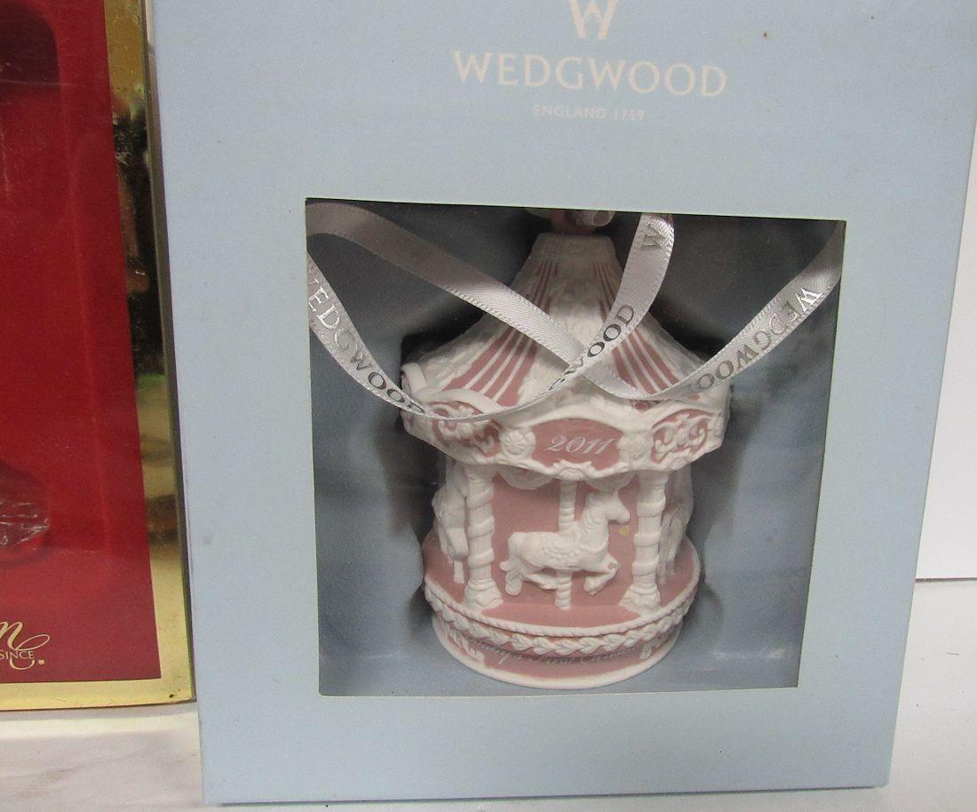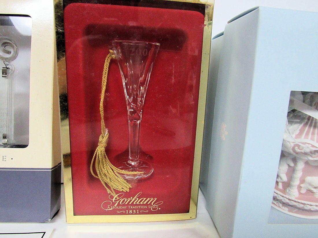 3 Christmas Ornaments in Original Boxes: Wedgwood Bisque Carousel 2011, Gorham Champaine Glass 2000, Photo Frame