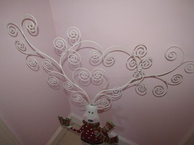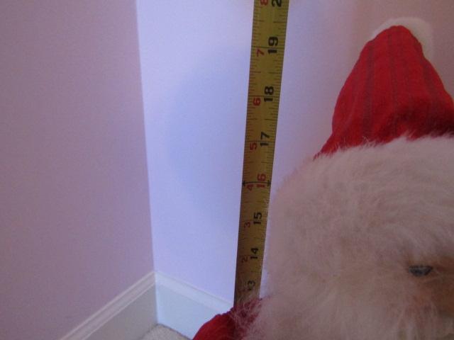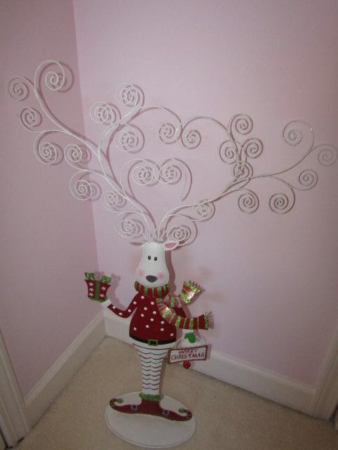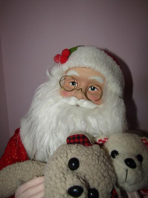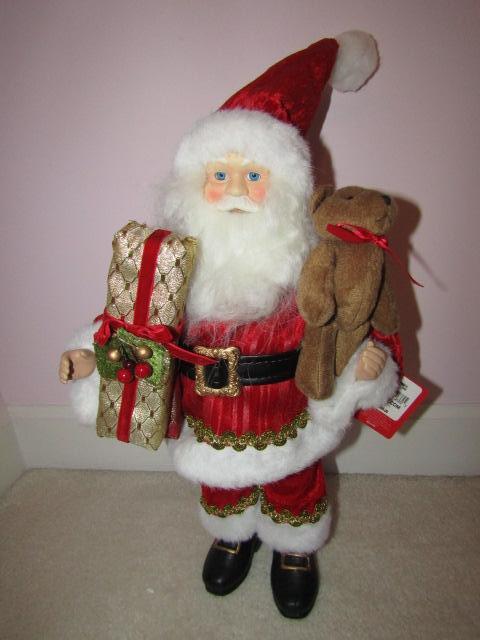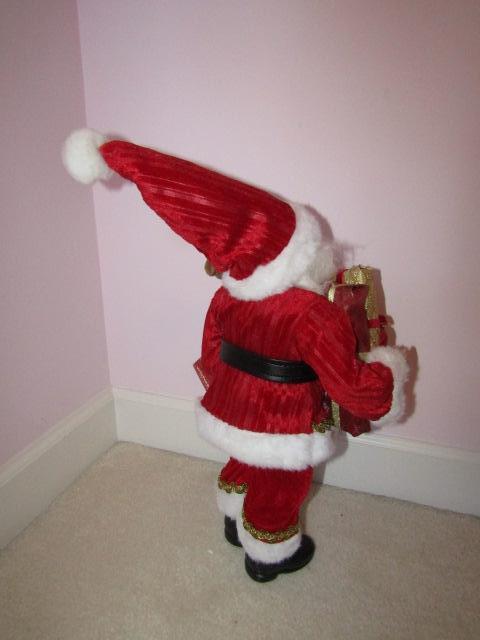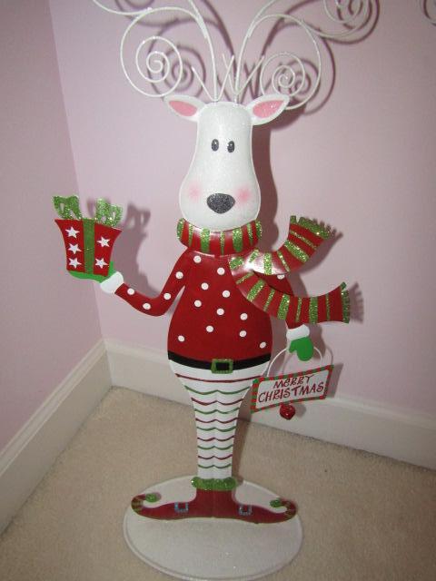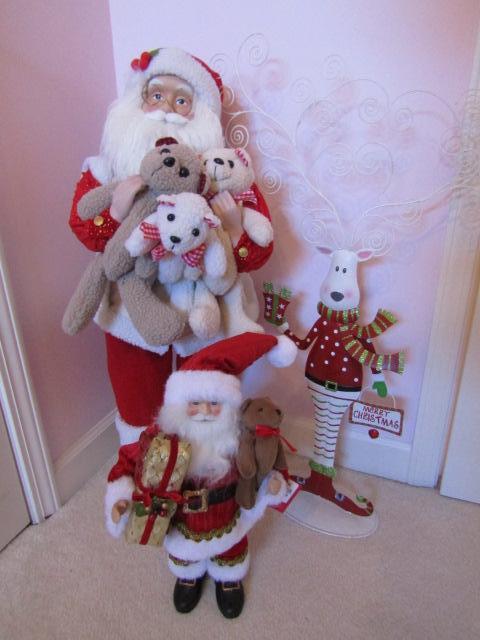 3 Christmas Standing Figures: 2 Santas, 1 Reindeer. Reindeer is made of metal and has antlers that hold cards. Please see pictures for measurements.