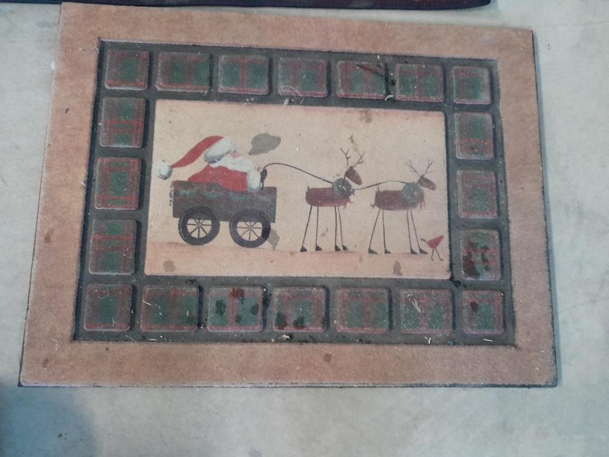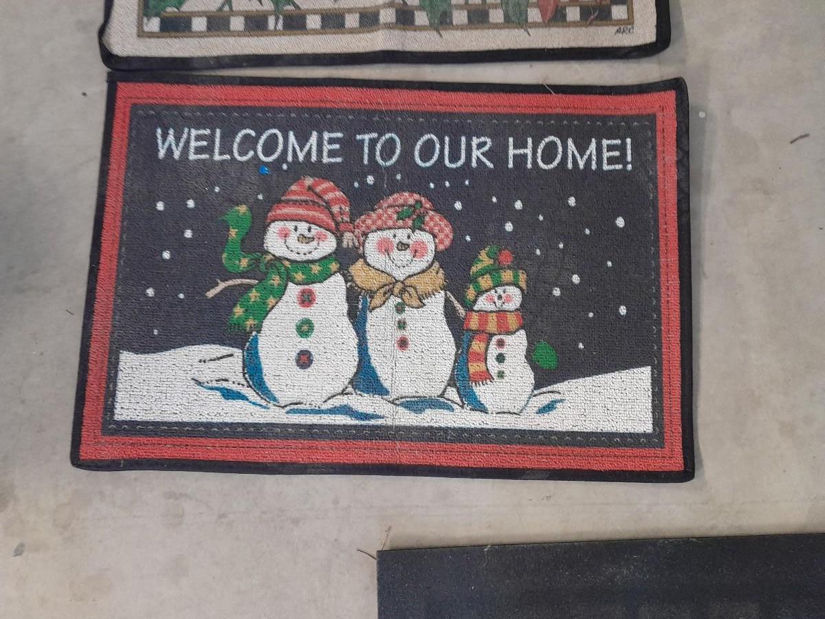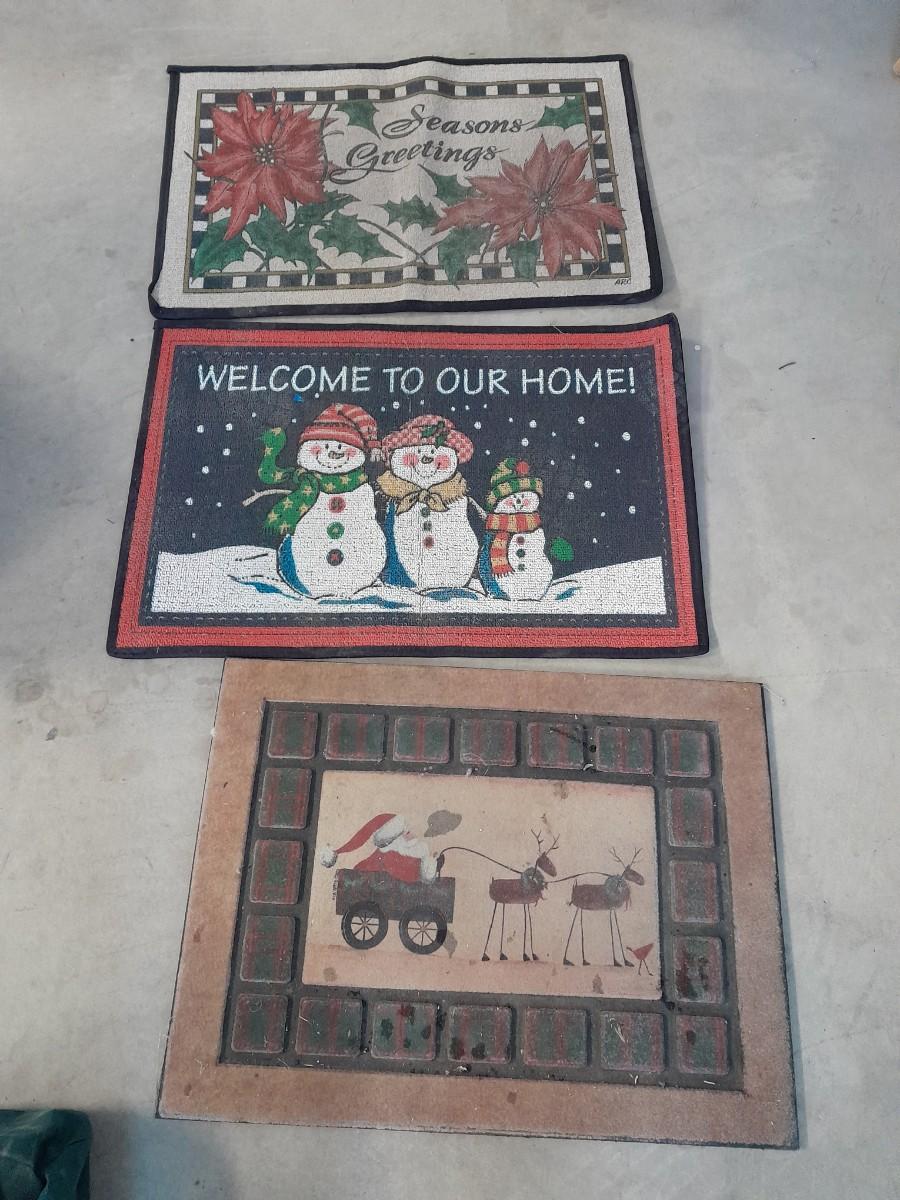 2 CHRISTMAS THROW RUGS AND 1 DOOR MAT