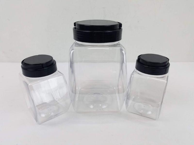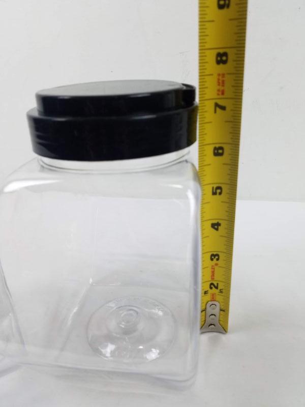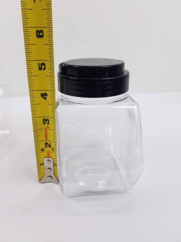 3 Clear Plastic Jars with Black Lids. 1 Large, 2 Small - New