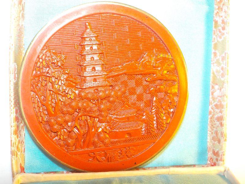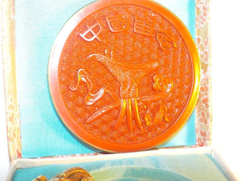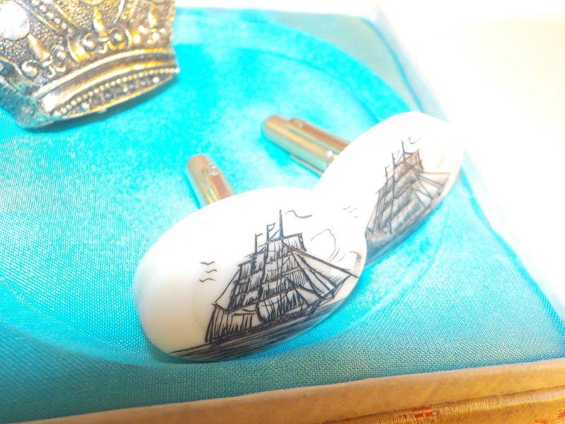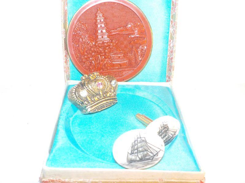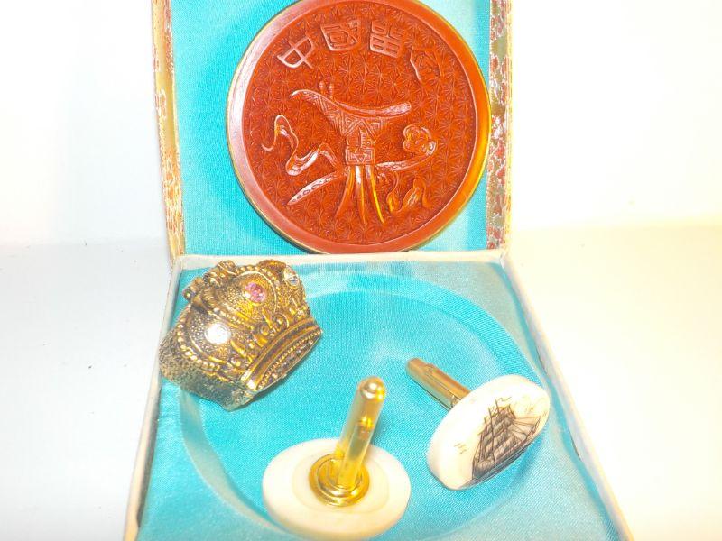 3 collector pieces " Chinese Best Wishes Coin and jewelry holder and Scrimshaw cuff links.