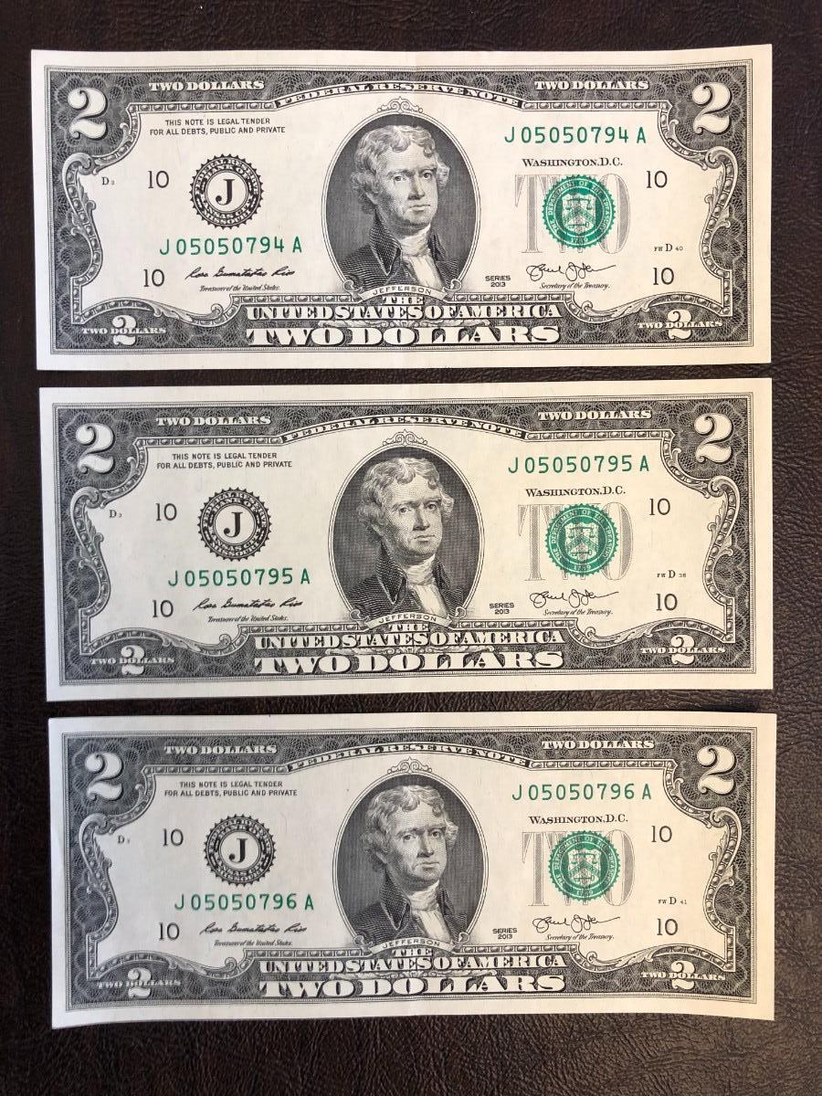 3 CONSECUTIVELY NUMBERED SERIES 2013 $2 BILLS (KANSAS CITY)