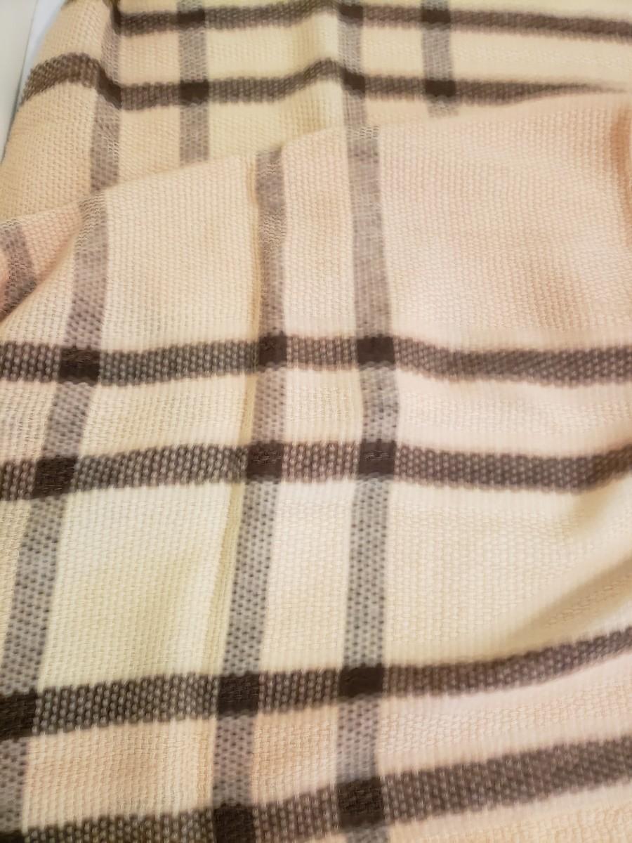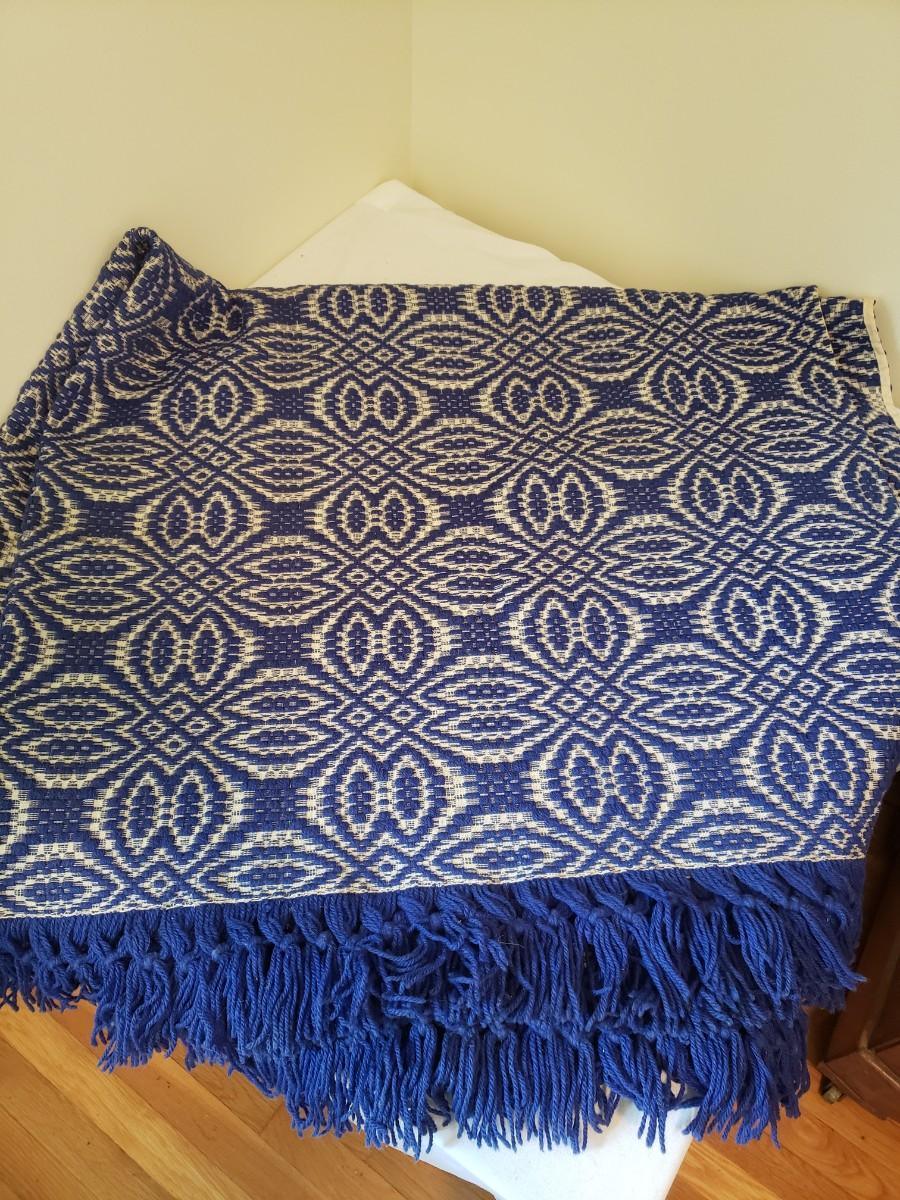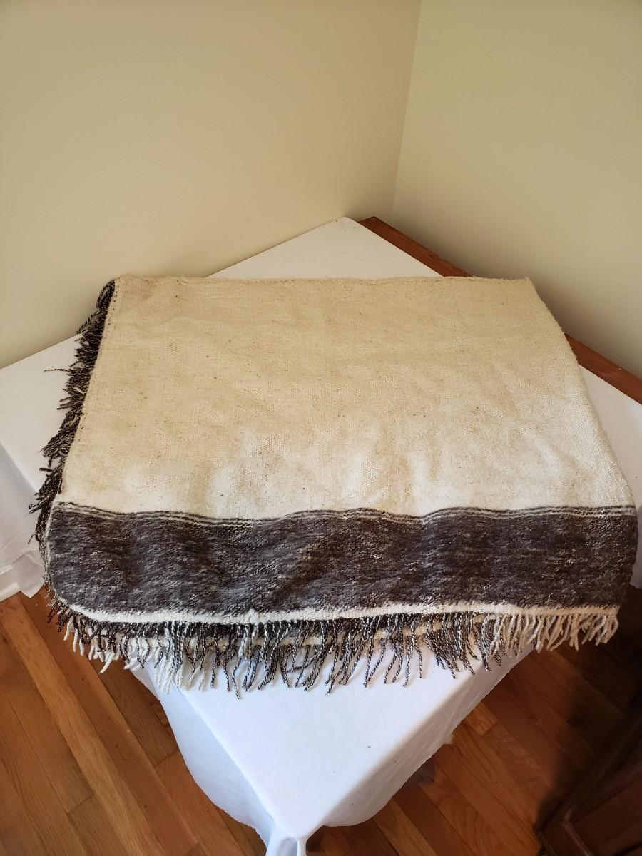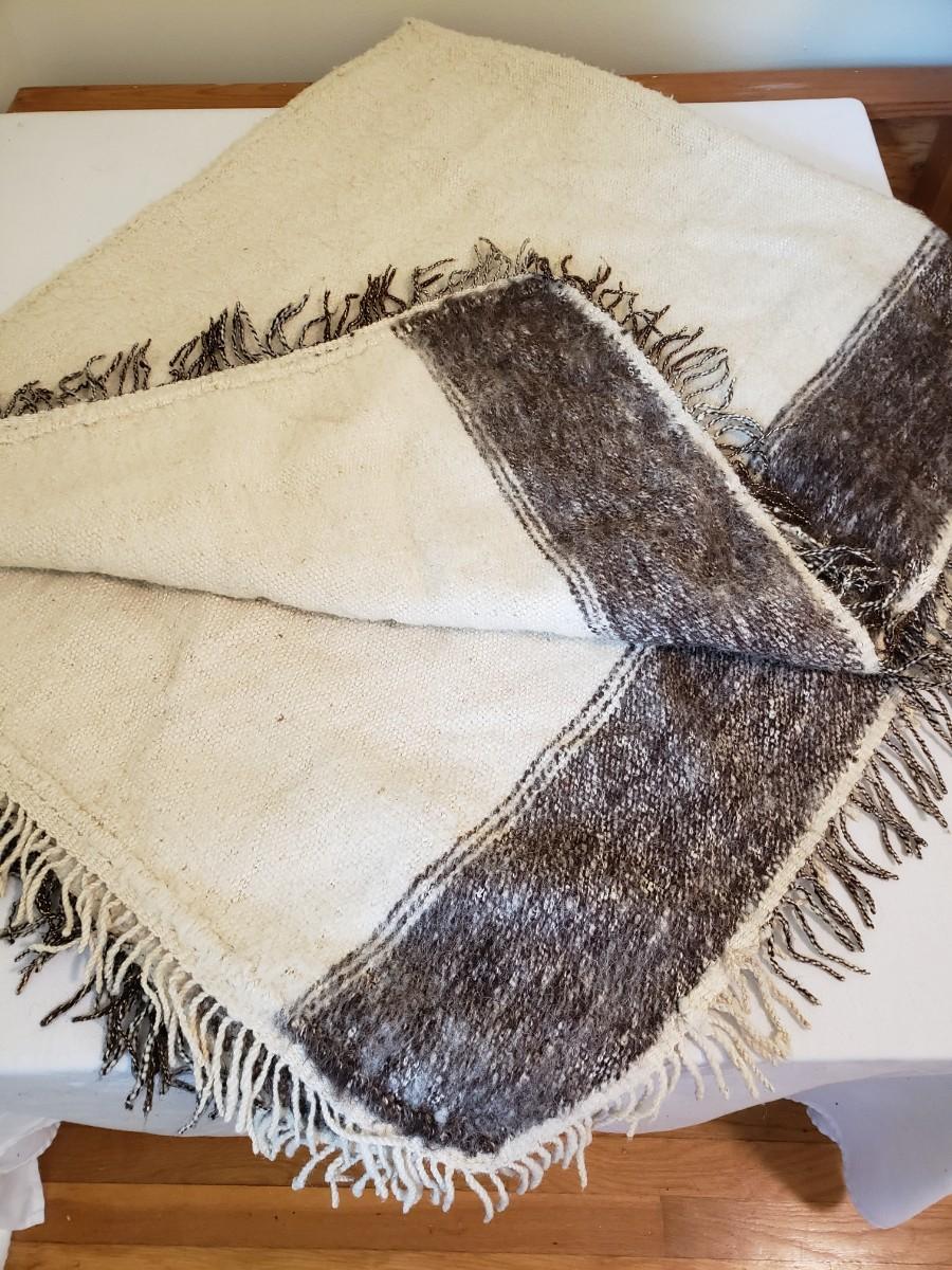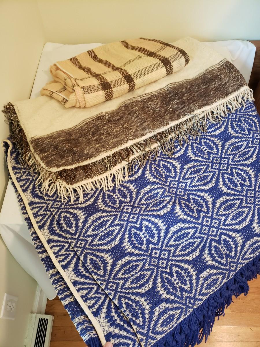 The first blanket pictured in this lot is believed to wool. It is tan with brown plaid strips. On the back one end is lined with linen as seen in the pictures. This blanket measures 56"x74". The wool tan blanket with a big brown strip on the edge with fringe, measures 60"x60" appears to be in good condition. The large blue and white patterned blanket is 76"x60" and is fringed in blue yarn on only two opposing sides. Shipping available.